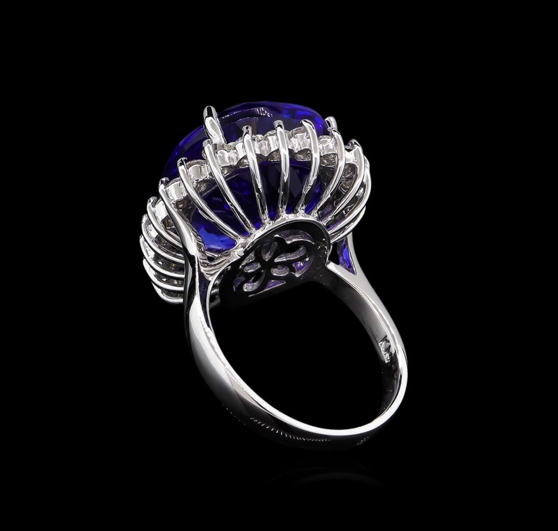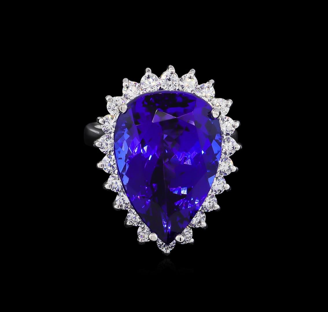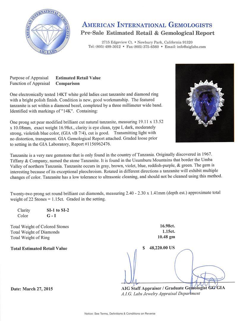 One electronically tested 14KT white gold ladies cast tanzanite and diamond ring with a bright polish finish. The featured tanzanite is set within a diamond bezel, completed by a three millimeter wide band. Identified with markings of "14K". Condition is new, good workmanship. Containing: One prong set pear modified brilliant cut natural tanzanite, measuring 19.11 x 13.52 x 10.08mm, exact weight 16.98ct., clarity is eye clean, type I, dark, moderately strong, violetish blue color, (GIA vB 7/4), cut is good. Transmitting light with no distortion, transparent. GIA Gemological Report attached. Graded loose prior to setting in the GIA Laboratory, Report #1156962476.Tanzanite is a very rare gemstone that is only found in the country of Tanzania. Originally discovered in 1967. Tiffany & Company, named the stone Tanzanite. It is found in the Usumburu Mountains that border the Umba Valley of northern Tanzania. Tanzanite occurs in gray, brown, violet, blue, reddish-purple, & green. The gem is interesting because of its exceptional pleochroism. Rotated in different directions a tanzanite will exhibit multiple changes of color. Tanzanite has a low tolerance to ultrasonic cleaning, and should not be cleaned using this method. Twenty-Two prong set round brilliant cut diamonds, measuring 2.40 - 2.30 x 1.41mm (depth est.) approximate total weight of 22 Stones = 1.15ct. Graded in the setting. Clarity: SI-1 to SI-2. Color: G - I. Total Weight of Colored Stones 16.98ct. Total Weight of Diamonds 1.15ct. Total Weight of Ring 10.48 grams. AIG Appraised at $48,220.00.