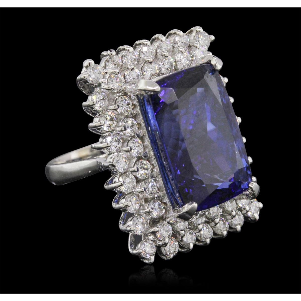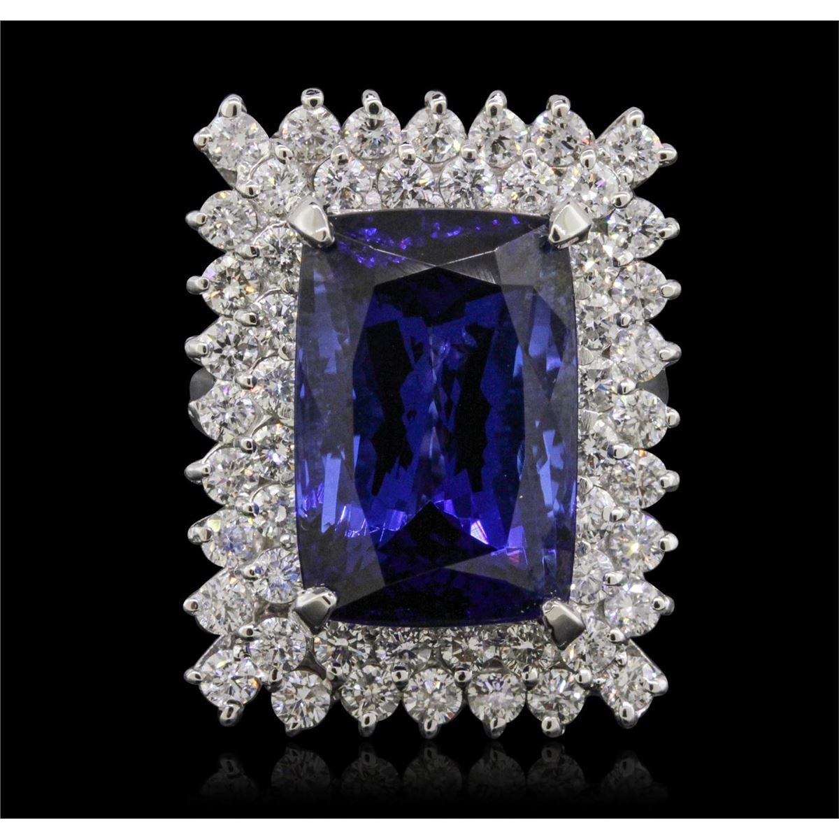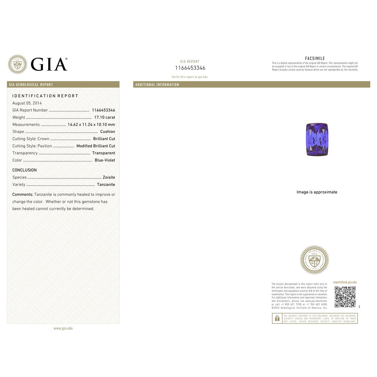 One electronically tested 14KT white gold ladies combination cast & assembled prong set ring with a flat shank with a bright polish finish. Identified with markings of "K14". Condition is new. Containing: One prong set rectangular cushion modified brilliant cut natural tanzanite, measuring 16.62 x 11.24 x 10.10mm, exact weight 17.10ct., clarity is eye clean, type I, medium dark, moderately strong, bluish violet color, (GIA bV 6/4), cut is very good. Graded loose prior to setting by GIA Gemological Laboratory. GIA Report # 1166453346. Fifty-Two prong set round brilliant cut diamonds, measuring 2.10 - 2.10 x 1.26mm (depth est.) approximate total weight of 52 Stones = 1.76ct. Clarity: SI-2 to I-2. Color: G - H, Cut is Good. Colored gemstones are presumed to have been subjected to commonly used enhancement processes. All diamonds and colored gemstones are graded in the mounting, unless otherwise stated. Total Weight of Colored Stones 17.10ct. Total Weight of Diamonds 1.76ct. Total Weight of Ring 12.80 grams. GGL Appraised at $37,250.00.