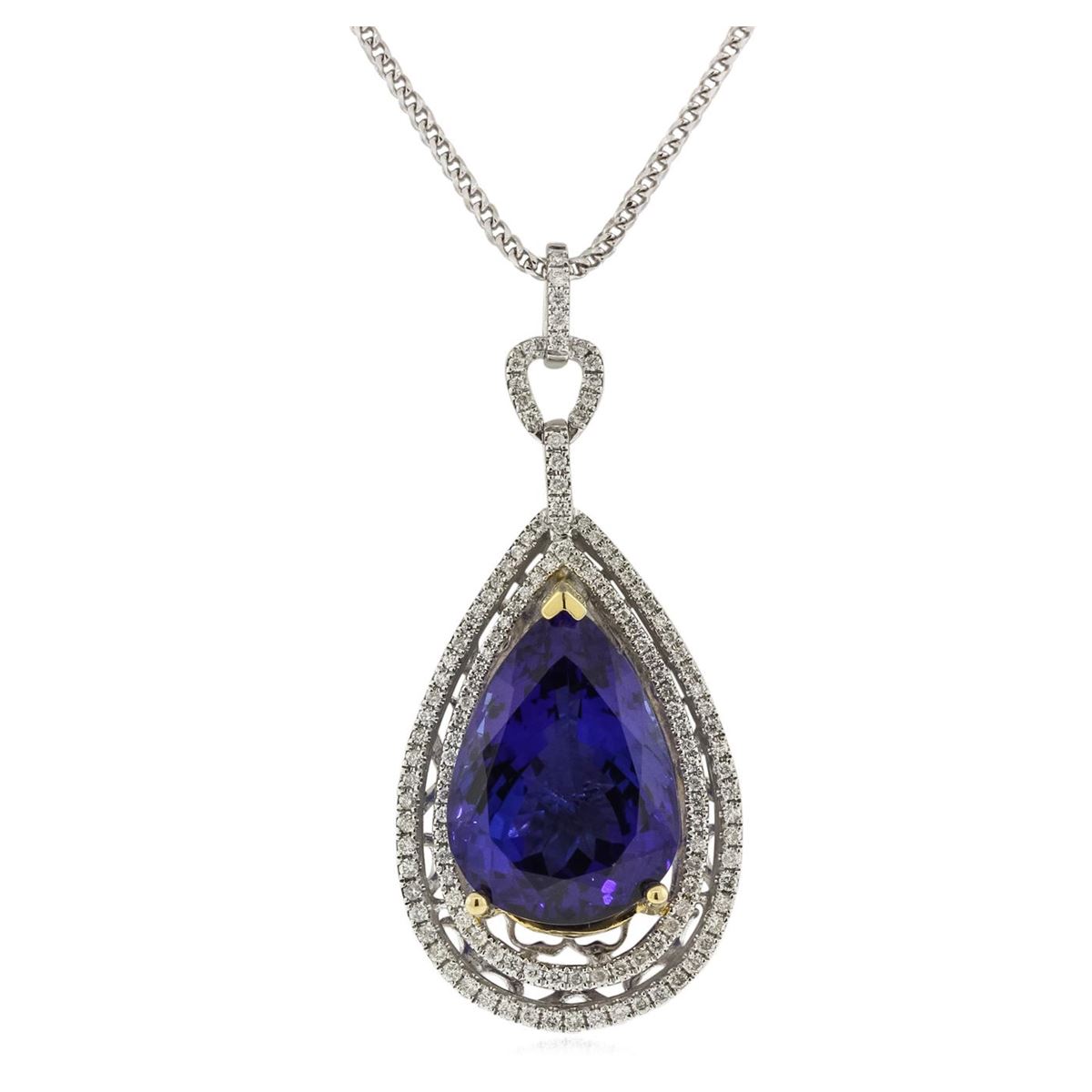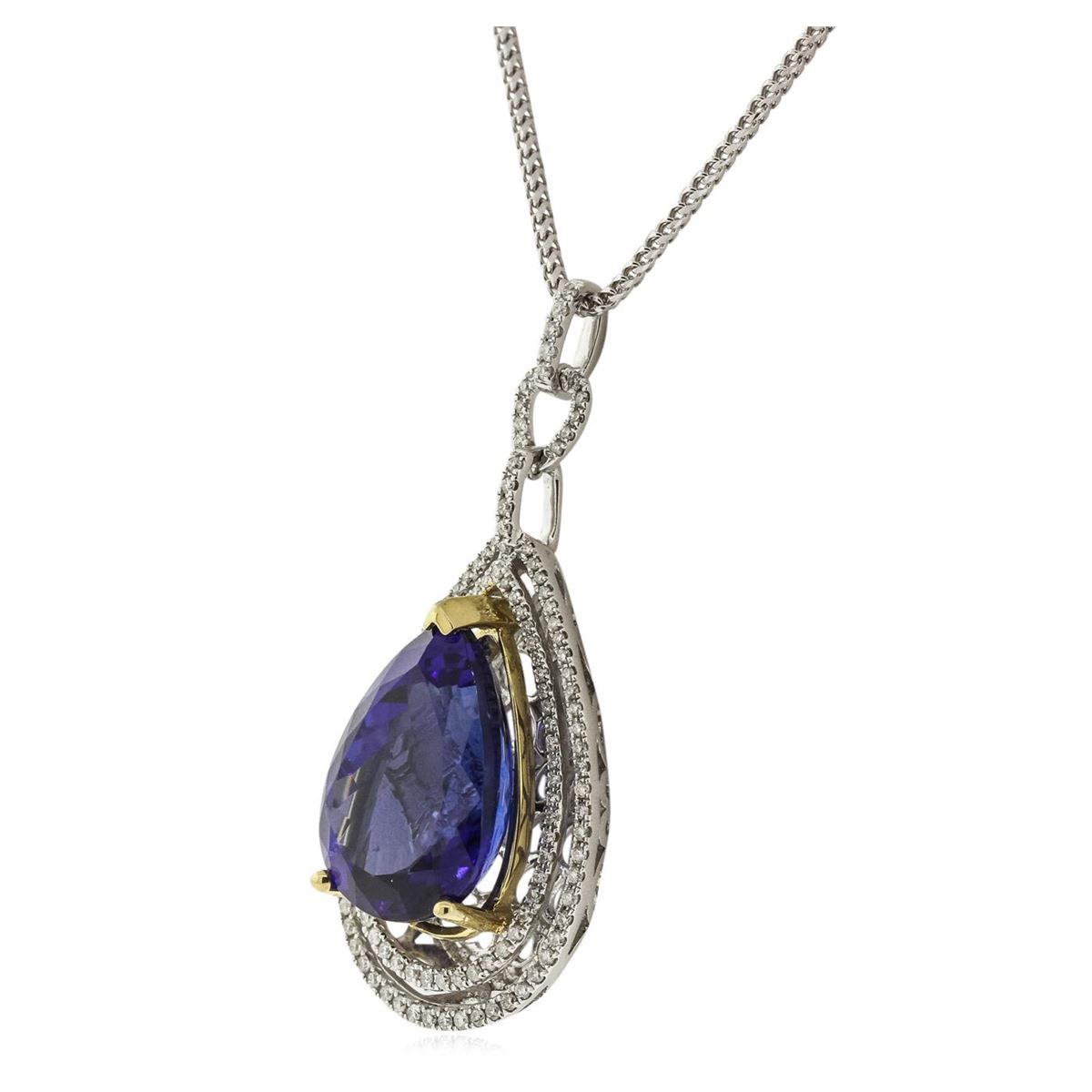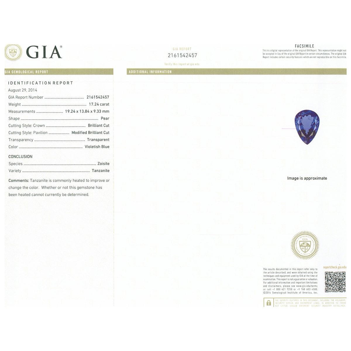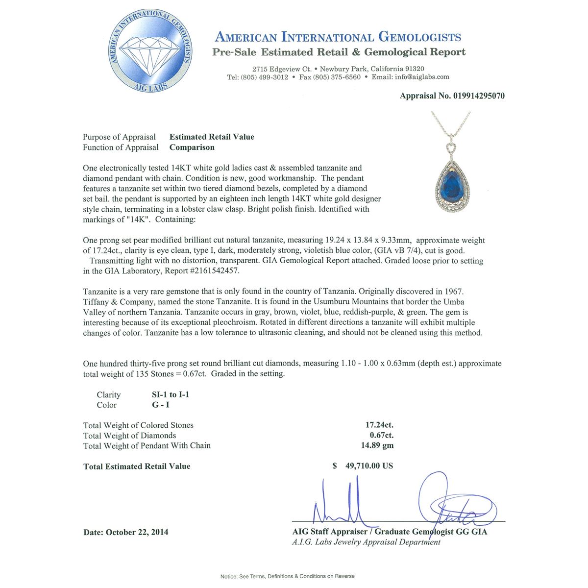 One electronically tested 14KT white gold ladies cast & assembled tanzanite and diamond pendant with chain. The pendant features a tanzanite set within two tiered diamond bezels, completed by a diamond set bail. the pendant is supported by an eighteen inch length 14KT white gold designer style chain, terminating in a lobster claw clasp. Bright polish finish. Identified with markings of 14K. Condition is new, good workmanship. Containing: One prong set pear modified brilliant cut natural tanzanite, measuring 19.24 x 13.84 x 9.33mm, approximate weight of 17.24ct., clarity is eye clean, type I, dark, moderately strong, violetish blue color, (GIA vB 7/4), cut is good. Transmitting light with no distortion, transparent. GIA Gemological Report attached. Graded loose prior to setting in the GIA Laboratory, Report #2161542457.Tanzanite is a very rare gemstone that is only found in the country of Tanzania. Originally discovered in 1967. Tiffany & Company, named the stone Tanzanite. It is found in the Usumburu Mountains that border the Umba Valley of northern Tanzania. Tanzanite occurs in gray, brown, violet, blue, reddish-purple, & green. The gem is interesting because of its exceptional pleochroism. Rotated in different directions a tanzanite will exhibit multiple changes of color. Tanzanite has a low tolerance to ultrasonic cleaning, and should not be cleaned using this method. One Hundred Thirty-Five prong set round brilliant cut diamonds, measuring 1.10 - 1.00 x 0.63mm (depth est.) approximate total weight of 135 Stones = 0.67ct. Graded in the setting. Clarity: SI-1 to I-1. Color: G - I. Total Weight of Colored Stones 17.24ct. Total Weight of Diamonds 0.67ct. Total Weight of Pendant With Chain 14.89 grams. AIG Appraised at $49,710.00.