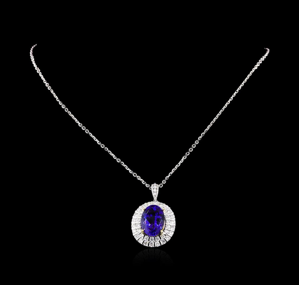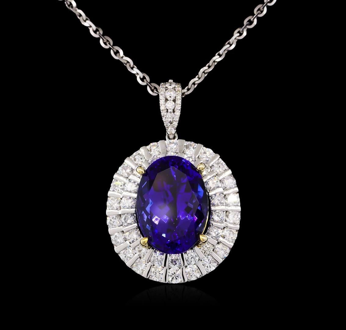 One electronically tested 14KT white gold cast & assembled tanzanite and diamond pendant/enhancer with chain. The pendant/enhancer features a tanzanite set within two tiered diamond bezels, completed by a diamond set bail with snap-locking clasp. The pendant is supported by an eighteen inch length 14KT white gold designer style chain, terminating in a lobster claw clasp. Bright polish finish. Identified with markings of 14K. Condition is new, good workmanship. Containing: One prong set oval modified brilliant cut natural tanzanite, measuring 18.16 x 13.23 x 10.16mm, exact weight 17.92ct., clarity is eye clean, type I, dark, moderately strong, bluish violet color, (GIA bV 7/4), cut is good. Transmitting light with no distortion, transparent. GIA Gemological Report attached. Graded loose prior to setting in the GIA Laboratory, Report #1166542784.Tanzanite is a very rare gemstone that is only found in the country of Tanzania. Originally discovered in 1967. Tiffany & Company, named the stone Tanzanite. It is found in the Usumburu Mountains that border the Umba Valley of northern Tanzania. Tanzanite occurs in gray, brown, violet, blue, reddish-purple, & green. The gem is interesting because of its exceptional pleochroism. Rotated in different directions a tanzanite will exhibit multiple changes of color. Tanzanite has a low tolerance to ultrasonic cleaning, and should not be cleaned using this method. Forty channel set round brilliant cut diamonds, measuring 3.00 - 2.90 x 1.77mm (depth est.) approximate total weight of 40 Stones = 3.85ct. Graded in the setting. Clarity: SI-1 to I-1. Color: G - I Twenty-Five prong set round brilliant cut diamonds, measuring 2.00 - 1.00 x 0.90mm (depth est.) approximate total weight of 25 Stones = 0.20ct. Graded in the setting. Clarity: SI-2 to I-1. Color: G - I. Total Weight of Colored Stones 17.92ct. Total Weight of Diamonds 4.05ct. Total Weight of Pendant/Enhancer With Chain 17.75 grams. AIG Appraised at $59,205.00.