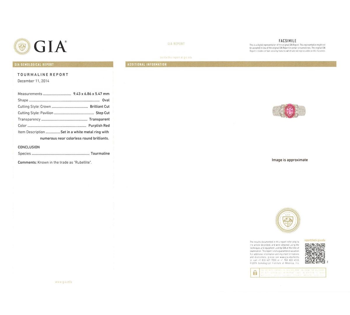 One electronically tested 14KT white gold ladies cast rubellite tourmaline and diamond ring. The featured rubellite tourmaline is supported by elaborate diamond set shoulders, completed by a patterned three and one-half millimeter wide band. Bright polish finish with milgrain detailing throughout. Identified with markings of "14K". Condition is good. Containing: One prong set oval mixed cut natural rubellite, measuring 9.43 x 6.86 x 5.47mm, 6% bulge factor, approximate weight of 2.35ct., clarity is slightly included, type III, dark, very slightly brownish, slightly purplish red color, (GIA slpR 7/3), cut is good. Transmitting light with a minimum of distortion, transparent. Naturally occurring internal & external characteristics are present. GIA Gemological Report attached. Graded for identification the GIA Laboratory, Report #1166833661.Twenty-Eight prong and channel set round brilliant cut diamonds, measuring 2.10 - 1.50 x 1.08mm (depth est.) approximate total weight of 28 Stones = 0.69ct. Graded in the setting. Clarity: VS-2 to SI-1. Color: G - I. Total Weight of Colored Stones 2.35ct. Total Weight of Diamonds 0.69ct. Total Weight of Ring 6.86 grams. AIG Appraised at $4,900.00.