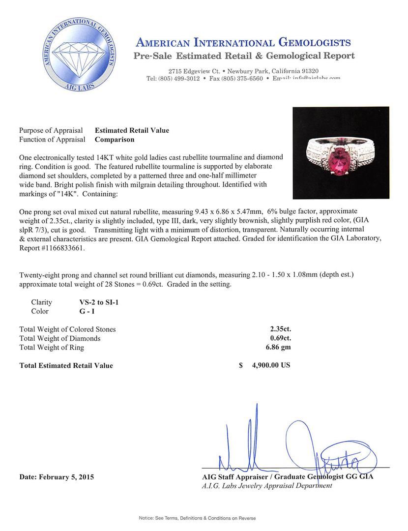 One electronically tested 14KT white gold ladies cast rubellite tourmaline and diamond ring. The featured rubellite tourmaline is supported by elaborate diamond set shoulders, completed by a patterned three and one-half millimeter wide band. Bright polish finish with milgrain detailing throughout. Identified with markings of "14K". Condition is good. Containing: One prong set oval mixed cut natural rubellite, measuring 9.43 x 6.86 x 5.47mm, 6% bulge factor, approximate weight of 2.35ct., clarity is slightly included, type III, dark, very slightly brownish, slightly purplish red color, (GIA slpR 7/3), cut is good. Transmitting light with a minimum of distortion, transparent. Naturally occurring internal & external characteristics are present. GIA Gemological Report attached. Graded for identification the GIA Laboratory, Report #1166833661.Twenty-Eight prong and channel set round brilliant cut diamonds, measuring 2.10 - 1.50 x 1.08mm (depth est.) approximate total weight of 28 Stones = 0.69ct. Graded in the setting. Clarity: VS-2 to SI-1. Color: G - I. Total Weight of Colored Stones 2.35ct. Total Weight of Diamonds 0.69ct. Total Weight of Ring 6.86 grams. AIG Appraised at $4,900.00.