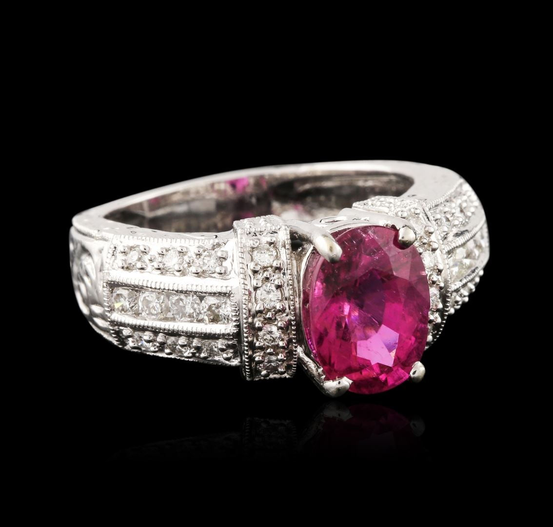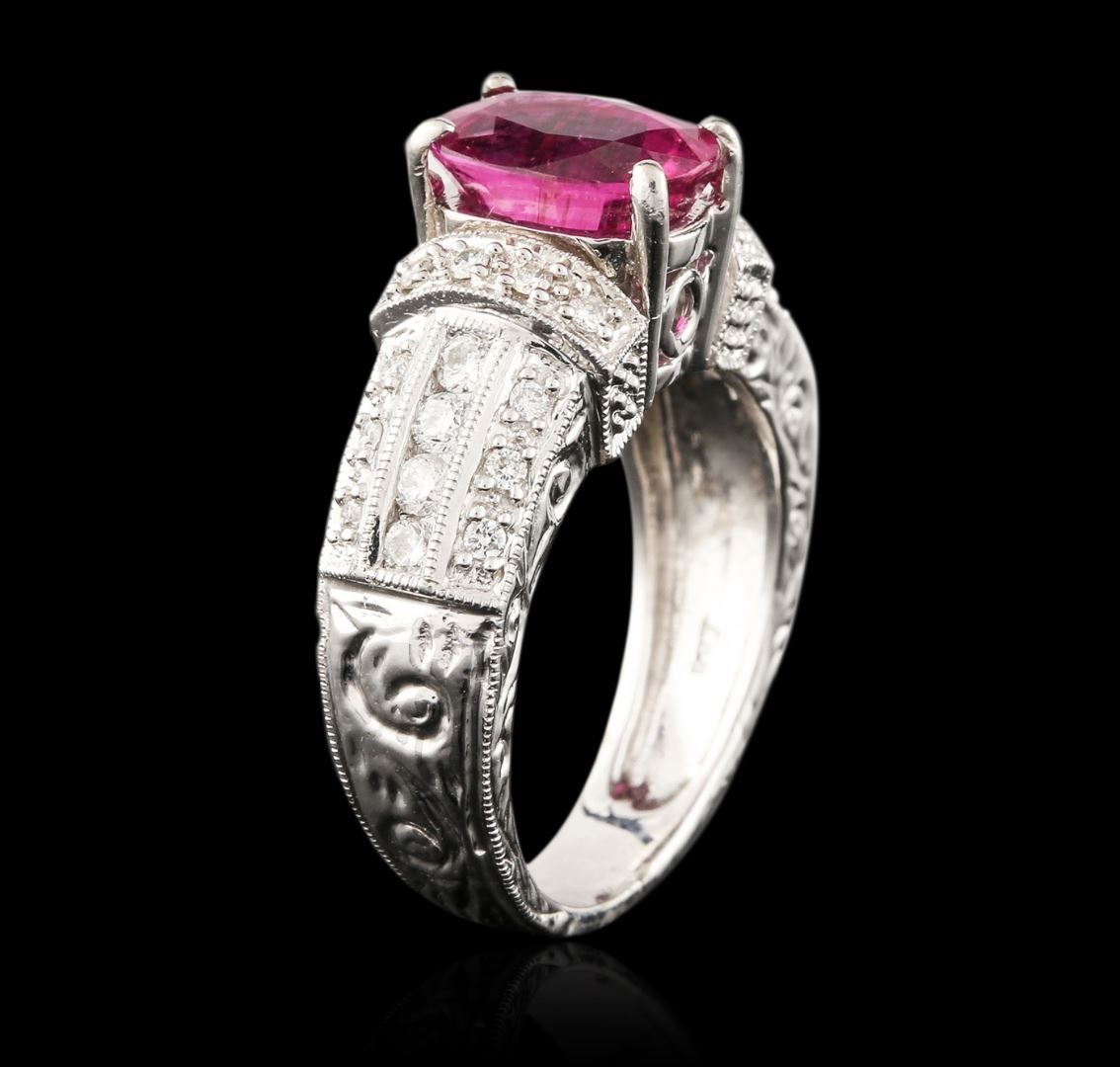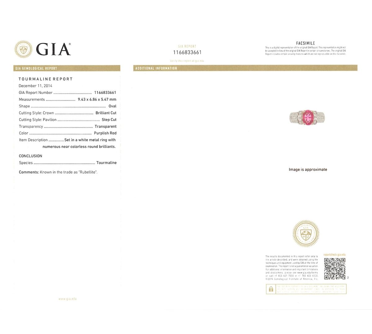 One electronically tested 14KT white gold ladies cast rubellite tourmaline and diamond ring. The featured rubellite tourmaline is supported by elaborate diamond set shoulders, completed by a patterned three and one-half millimeter wide band. Bright polish finish with milgrain detailing throughout. Identified with markings of "14K". Condition is good. Containing: One prong set oval mixed cut natural rubellite, measuring 9.43 x 6.86 x 5.47mm, 6% bulge factor, approximate weight of 2.35ct., clarity is slightly included, type III, dark, very slightly brownish, slightly purplish red color, (GIA slpR 7/3), cut is good. Transmitting light with a minimum of distortion, transparent. Naturally occurring internal & external characteristics are present. GIA Gemological Report attached. Graded for identification the GIA Laboratory, Report #1166833661.Twenty-Eight prong and channel set round brilliant cut diamonds, measuring 2.10 - 1.50 x 1.08mm (depth est.) approximate total weight of 28 Stones = 0.69ct. Graded in the setting. Clarity: VS-2 to SI-1. Color: G - I. Total Weight of Colored Stones 2.35ct. Total Weight of Diamonds 0.69ct. Total Weight of Ring 6.86 grams. AIG Appraised at $4,900.00.