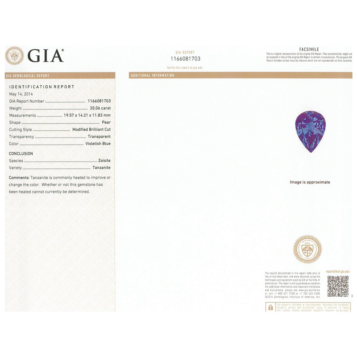 One electronically tested 14KT white gold ladies cast tanzanite and diamond ring with a bright polish finish. Condition is new, good workmanship. The featured tanzanite is set within a diamond bezel, completed by a two and one-half millimeter wide band. Identified with markings of "K14". Containing: One prong set pear modified brilliant cut natural tanzanite, measuring 19.57 x 14.21 x 11.83mm, exact weight 20.06ct., clarity is eye clean, type I, dark, moderately strong, violetish blue color, (GIA vB 7/4), cut is good. Transmitting light with no distortion, transparent. GIA Gemological Report attached. Graded loose prior to setting in the GIA Laboratory, Report #1166081703.Tanzanite is a very rare gemstone that is only found in the country of Tanzania. Originally discovered in 1967. Tiffany & Company, named the stone Tanzanite. It is found in the Usumburu Mountains that border the Umba Valley of northern Tanzania. Tanzanite occurs in gray, brown, violet, blue, reddish-purple, & green. The gem is interesting because of its exceptional pleochroism. Rotated in different directions a tanzanite will exhibit multiple changes of color. Tanzanite has a low tolerance to ultrasonic cleaning, and should not be cleaned using this method. Twenty prong set round brilliant cut diamonds, measuring 3.00 - 2.80 x 1.74mm (depth est.) approximate total weight of 20 Stones = 1.88ct. Graded in the setting. Clarity: SI-1 to I-1 . Color: G - I. Total Weight of Colored Stones 20.06ct. Total Weight of Diamonds 1.88ct. Total Weight of Ring 11.38 grams. AIG Appraised at $57,280.00.