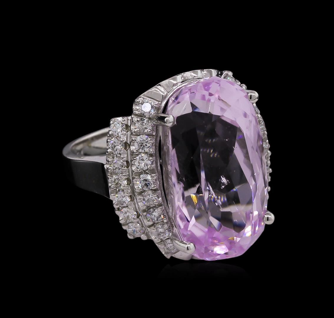 One electronically tested 14KT white gold Ladies combination cast & assembled ring with a bright polish finish. Condition is new. Identified with markings of "K14". Containing: One prong set rectangular cushion modified brilliant cut natural kunzite, measuring 20.13 x 11.68 x 10.12mm, exact weight 20.25ct., clarity is eye clean, type I, light, very slightly grayish, purple color, (GIA P 3/3), cut is good. GIA Report: 1156953488.Thirty-Two prong set round brilliant cut diamonds, measuring 1.70 - 1.70 x 1.02mm (depth est.) approximate. Total Weight of 32 Stones = 0.57ct. Clarity: I-1. Color: L - M, Cut is Good. Diamonds graded in the mounting. Total Weight of Colored Stones 20.25ct. Total Weight of Diamonds 0.57ct. Total Weight of Ring 11.30 grams. GGL Appraised at $11,490.00.