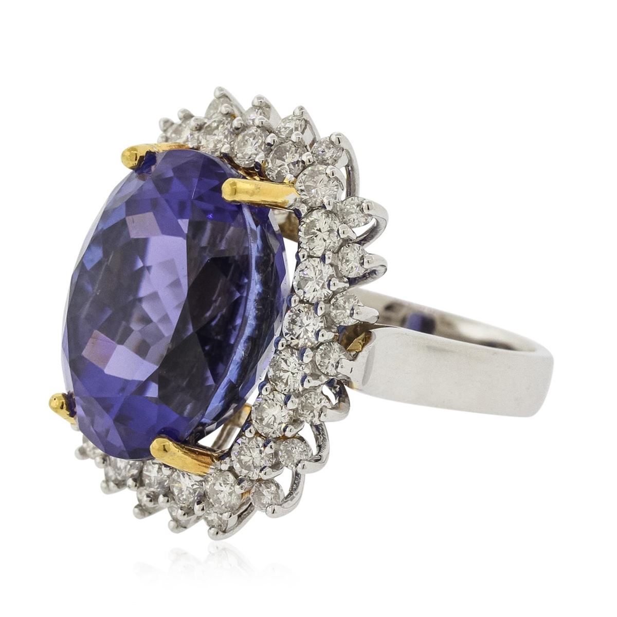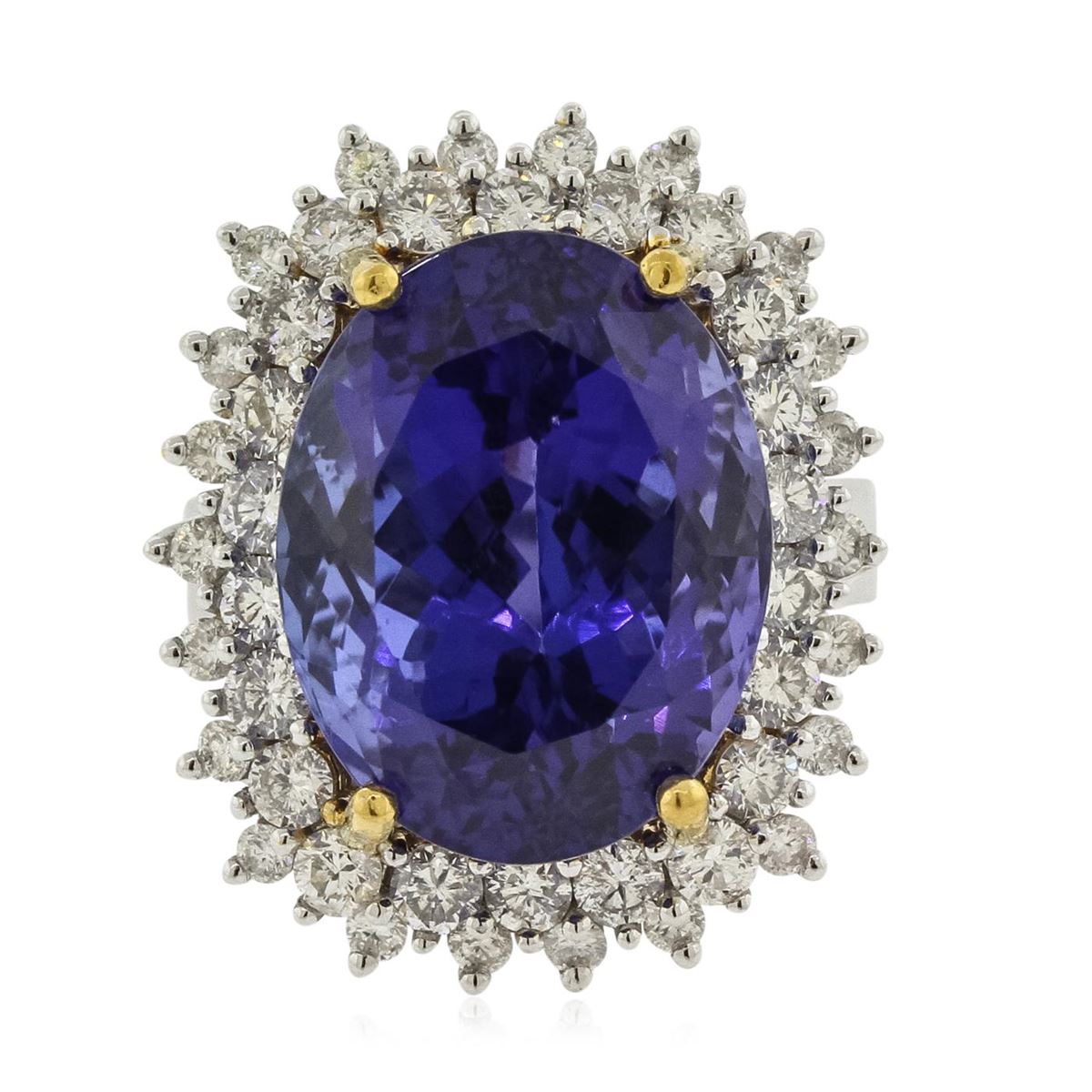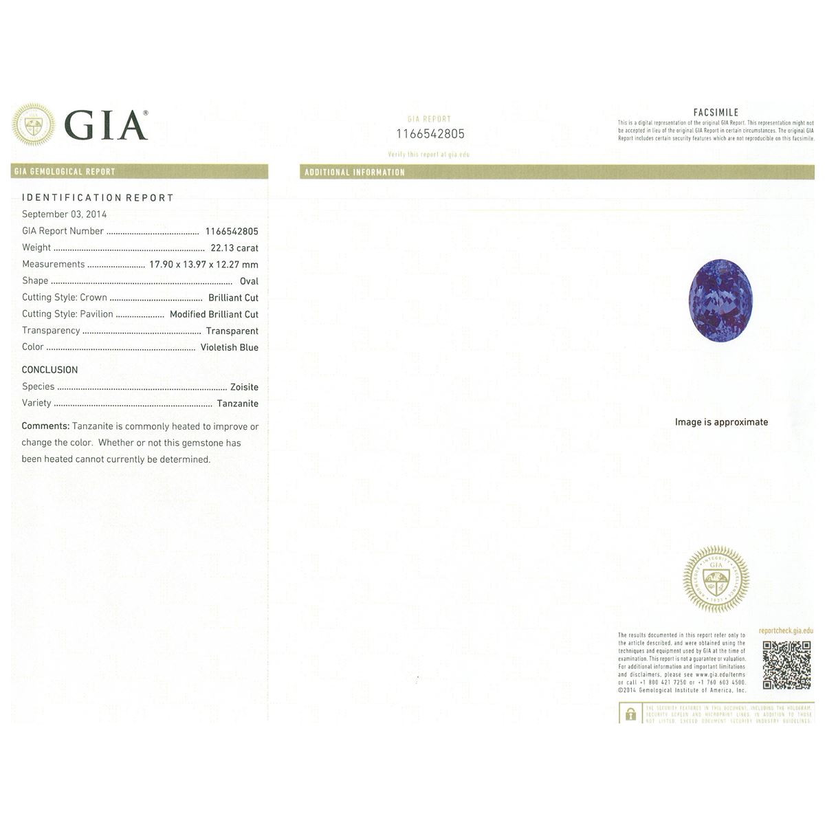 One electronically tested 14KT white gold ladies cast tanzanite and diamond ring. The featured tanzanite is set within a tiered diamond bezel, completed by a three and one-half millimeter wide band. Bright polish finish with yellow gold accents. Identified with markings of 14K. Condition is new, good workmanship. Containing: One prong set pear modified brilliant cut natural tanzanite, measuring 17.90 x 13.97 x 12.27mm, exact weight 22.13ct., clarity is eye clean, type I, dark, moderately strong, violetish blue color, (GIA vB 7/4), cut is good. Transmitting light with no distortion, transparent. GIA Gemological Report attached. Graded loose prior to setting in the GIA Laboratory, Report #1166542805.Tanzanite is a very rare gemstone that is only found in the country of Tanzania. Originally discovered in 1967. Tiffany & Company, named the stone Tanzanite. It is found in the Usumburu Mountains that border the Umba Valley of northern Tanzania. Tanzanite occurs in gray, brown, violet, blue, reddish-purple, & green. The gem is interesting because of its exceptional pleochroism. Rotated in different directions a tanzanite will exhibit multiple changes of color. Tanzanite has a low tolerance to ultrasonic cleaning, and should not be cleaned using this method. Twenty-Two prong set round brilliant cut diamonds, measuring 2.40 - 2.30 x 1.41mm (depth est.) approximate total weight of 22 Stones = 1.14ct. Graded in the setting. Clarity: SI-1 to I-1. Color: G - I Twenty-Two prong set round brilliant cut diamonds, measuring 1.80 - 1.70 x 1.05mm (depth est.) approximate total weight of 22 Stones = 0.53ct. Graded in the setting. Clarity: SI-1 to I-1. Color: G - I. Total Weight of Colored Stones 22.13ct. Total Weight of Diamonds 1.67ct. Total Weight of Ring 13.79 grams. AIG Appraised at $66,360.00.