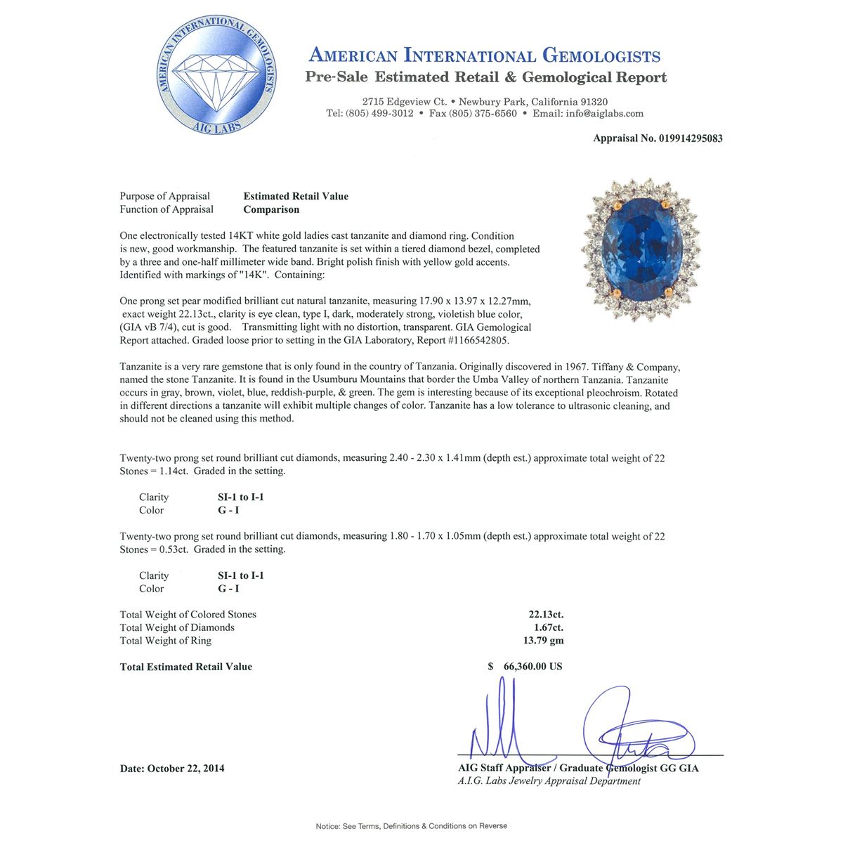 One electronically tested 14KT white gold ladies cast tanzanite and diamond ring. The featured tanzanite is set within a tiered diamond bezel, completed by a three and one-half millimeter wide band. Bright polish finish with yellow gold accents. Identified with markings of 14K. Condition is new, good workmanship. Containing: One prong set pear modified brilliant cut natural tanzanite, measuring 17.90 x 13.97 x 12.27mm, exact weight 22.13ct., clarity is eye clean, type I, dark, moderately strong, violetish blue color, (GIA vB 7/4), cut is good. Transmitting light with no distortion, transparent. GIA Gemological Report attached. Graded loose prior to setting in the GIA Laboratory, Report #1166542805.Tanzanite is a very rare gemstone that is only found in the country of Tanzania. Originally discovered in 1967. Tiffany & Company, named the stone Tanzanite. It is found in the Usumburu Mountains that border the Umba Valley of northern Tanzania. Tanzanite occurs in gray, brown, violet, blue, reddish-purple, & green. The gem is interesting because of its exceptional pleochroism. Rotated in different directions a tanzanite will exhibit multiple changes of color. Tanzanite has a low tolerance to ultrasonic cleaning, and should not be cleaned using this method. Twenty-Two prong set round brilliant cut diamonds, measuring 2.40 - 2.30 x 1.41mm (depth est.) approximate total weight of 22 Stones = 1.14ct. Graded in the setting. Clarity: SI-1 to I-1. Color: G - I Twenty-Two prong set round brilliant cut diamonds, measuring 1.80 - 1.70 x 1.05mm (depth est.) approximate total weight of 22 Stones = 0.53ct. Graded in the setting. Clarity: SI-1 to I-1. Color: G - I. Total Weight of Colored Stones 22.13ct. Total Weight of Diamonds 1.67ct. Total Weight of Ring 13.79 grams. AIG Appraised at $66,360.00.