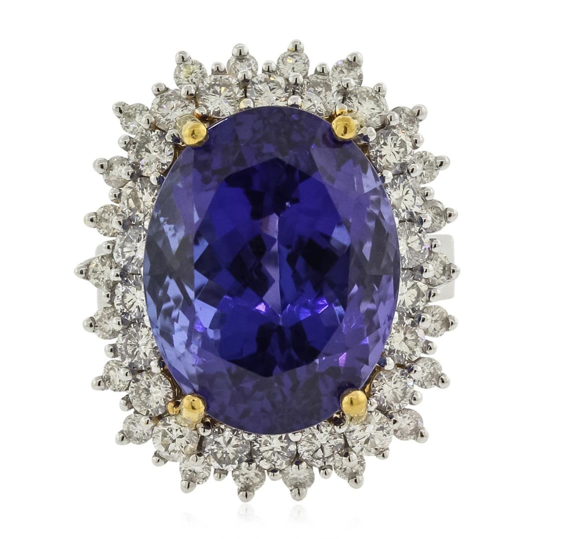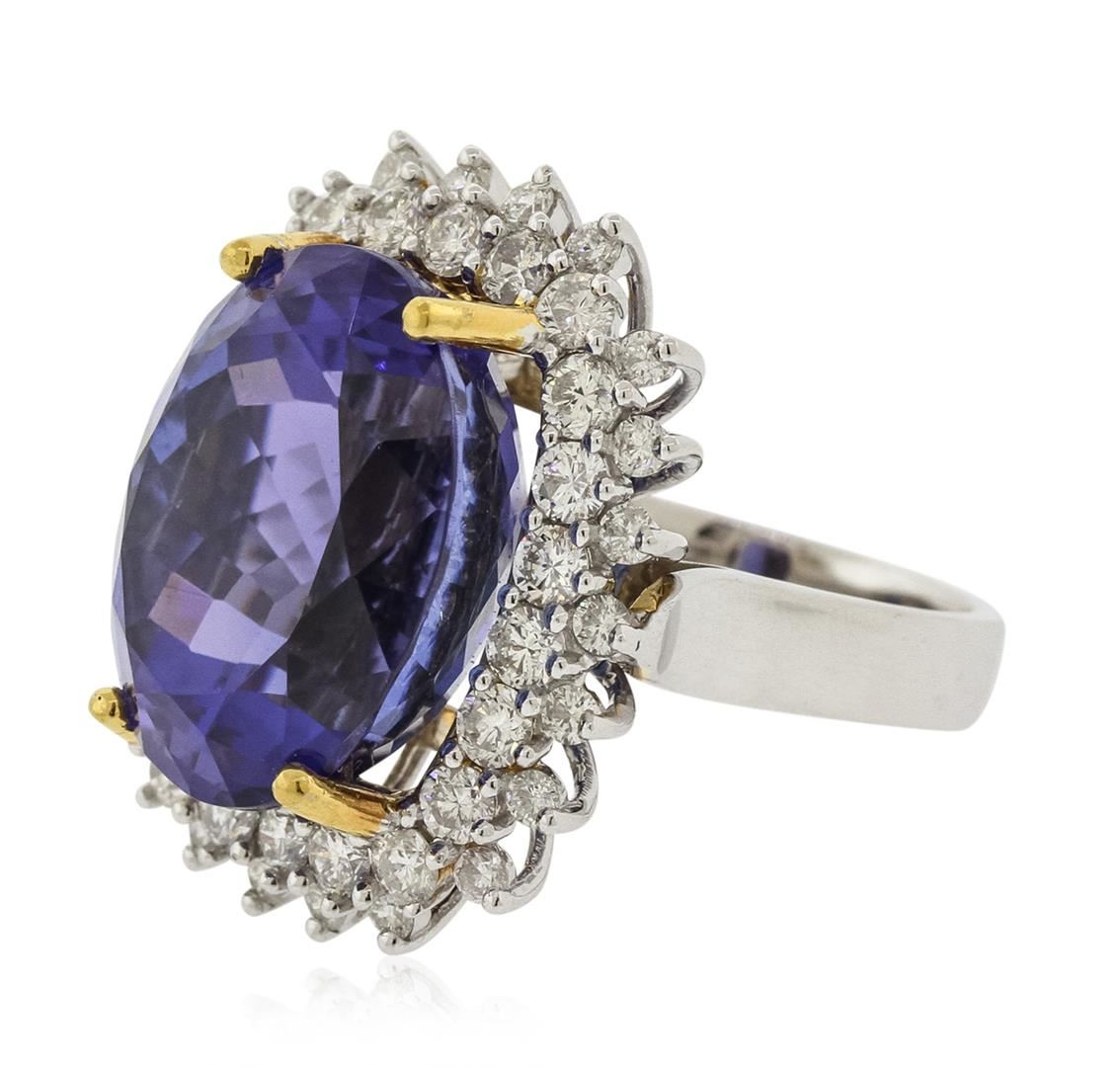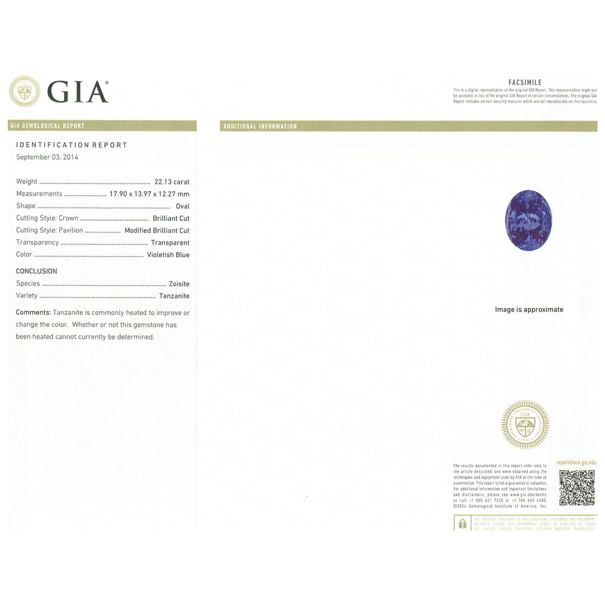 One electronically tested 14KT white gold ladies cast tanzanite and diamond ring. The featured tanzanite is set within a tiered diamond bezel, completed by a three and one-half millimeter wide band. Bright polish finish with yellow gold accents. Identified with markings of 14K. Condition is new, good workmanship. Containing: One prong set pear modified brilliant cut natural tanzanite, measuring 17.90 x 13.97 x 12.27mm, exact weight 22.13ct., clarity is eye clean, type I, dark, moderately strong, violetish blue color, (GIA vB 7/4), cut is good. Transmitting light with no distortion, transparent. GIA Gemological Report attached. Graded loose prior to setting in the GIA Laboratory, Report #1166542805.Tanzanite is a very rare gemstone that is only found in the country of Tanzania. Originally discovered in 1967. Tiffany & Company, named the stone Tanzanite. It is found in the Usumburu Mountains that border the Umba Valley of northern Tanzania. Tanzanite occurs in gray, brown, violet, blue, reddish-purple, & green. The gem is interesting because of its exceptional pleochroism. Rotated in different directions a tanzanite will exhibit multiple changes of color. Tanzanite has a low tolerance to ultrasonic cleaning, and should not be cleaned using this method. Twenty-Two prong set round brilliant cut diamonds, measuring 2.40 - 2.30 x 1.41mm (depth est.) approximate total weight of 22 Stones = 1.14ct. Graded in the setting. Clarity: SI-1 to I-1. Color: G - I Twenty-Two prong set round brilliant cut diamonds, measuring 1.80 - 1.70 x 1.05mm (depth est.) approximate total weight of 22 Stones = 0.53ct. Graded in the setting. Clarity: SI-1 to I-1. Color: G - I. Total Weight of Colored Stones 22.13ct. Total Weight of Diamonds 1.67ct. Total Weight of Ring 13.79 grams. AIG Appraised at $66,360.00.