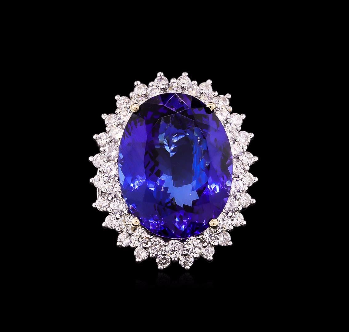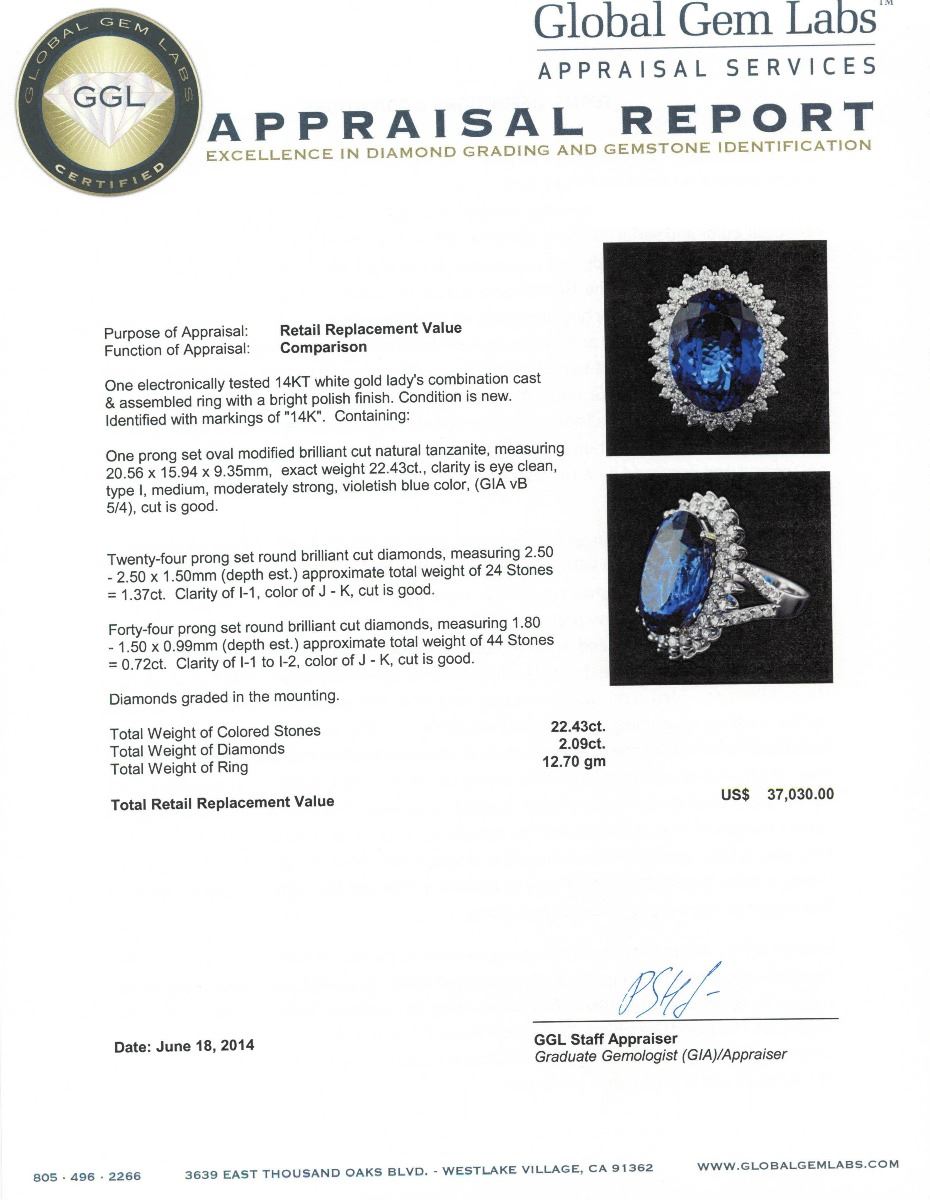 One electronically tested 14KT white gold Ladies combination cast & assembled ring with a bright polish finish. Condition is new. Identified with markings of "14K". Containing: One prong set oval modified brilliant cut natural tanzanite, measuring 20.56 x 15.94 x 9.35mm, exact weight 22.43ct., clarity is eye clean, type I, medium, moderately strong, violetish blue color, (GIA vB 5/4), cut is good. GIA Report: 216077781.Twenty-Four prong set round brilliant cut diamonds, measuring 2.50 - 2.50 x 1.50mm (depth est.) approximate. Total Weight of 24 Stones = 1.37ct. Clarity: I-1. Color: J - K, Cut is Good. Forty-Four prong set round brilliant cut diamonds, measuring 1.80 - 1.50 x 0.99mm (depth est.) approximate. Total Weight of 44 Stones = 0.72ct. Clarity: I-1 to I-2. Color: J - K, Cut is Good. Diamonds graded in the mounting. Total Weight of Colored Stones 22.43ct. Total Weight of Diamonds 2.09ct. Total Weight of Ring 12.70 grams. GGL Appraised at $37,030.00.