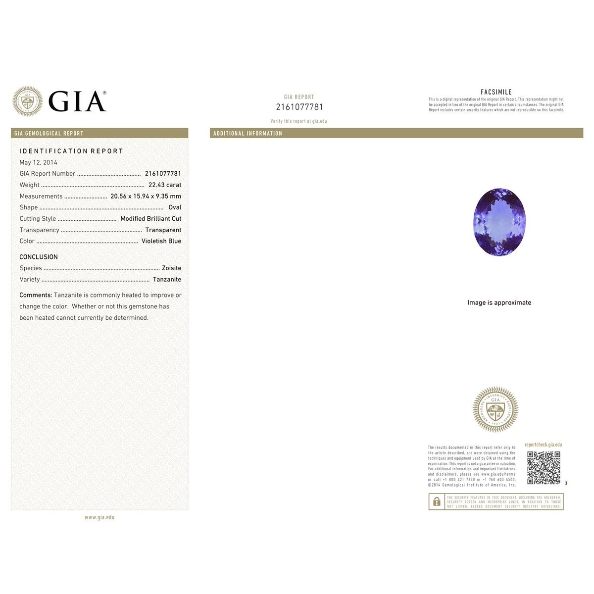 One electronically tested 14KT white gold Ladies combination cast & assembled ring with a bright polish finish. Condition is new. Identified with markings of "14K". Containing: One prong set oval modified brilliant cut natural tanzanite, measuring 20.56 x 15.94 x 9.35mm, exact weight 22.43ct., clarity is eye clean, type I, medium, moderately strong, violetish blue color, (GIA vB 5/4), cut is good. GIA Report: 216077781.Twenty-Four prong set round brilliant cut diamonds, measuring 2.50 - 2.50 x 1.50mm (depth est.) approximate. Total Weight of 24 Stones = 1.37ct. Clarity: I-1. Color: J - K, Cut is Good. Forty-Four prong set round brilliant cut diamonds, measuring 1.80 - 1.50 x 0.99mm (depth est.) approximate. Total Weight of 44 Stones = 0.72ct. Clarity: I-1 to I-2. Color: J - K, Cut is Good. Diamonds graded in the mounting. Total Weight of Colored Stones 22.43ct. Total Weight of Diamonds 2.09ct. Total Weight of Ring 12.70 grams. GGL Appraised at $37,030.00.