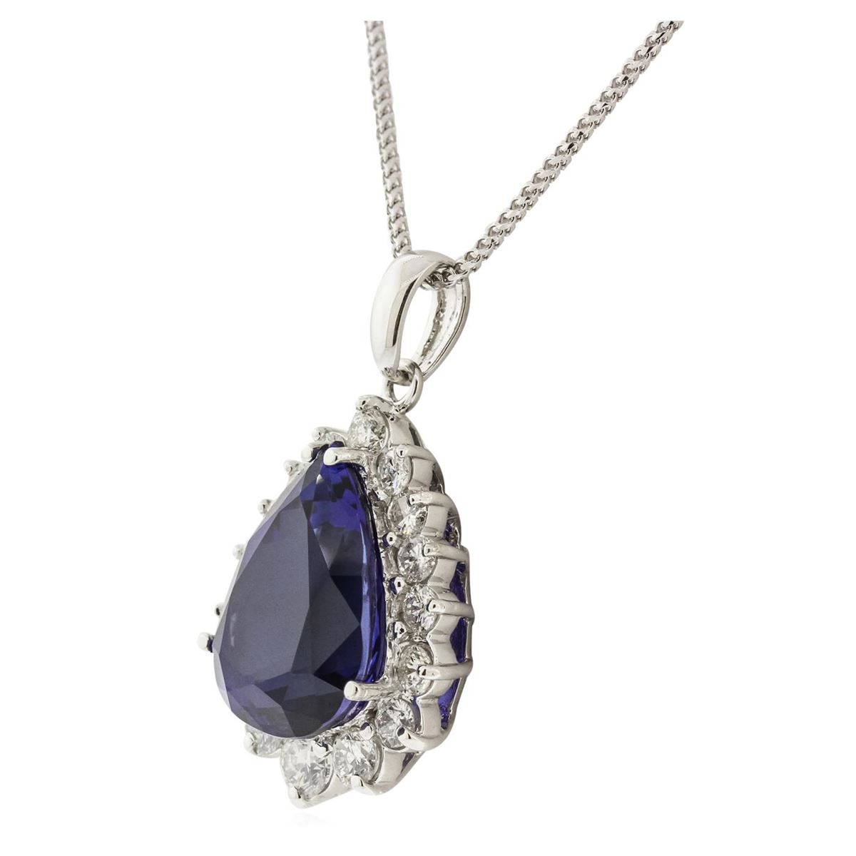 One electronically tested 14KT white gold ladies cast & assembled tanzanite and diamond pendant with chain. The pendant features a tanzanite set within a diamond bezel, completed by a white gold bail. The pendant is supported by an eighteen inch length 14KT white gold designer style chain, terminating in a lobster claw clasp. Bright polish finish. Identified with markings of 14K. Condition is new, good workmanship. Containing: One prong set pear modified brilliant cut natural tanzanite, measuring 20.95 x 15.50 x 11.20mm, exact weight 23.12ct., clarity is eye clean, type I, dark, moderately strong, bluish violet color, (GIA bV 7/4), cut is good. Transmitting light with no distortion, transparent. GIA Gemological Report attached. Graded loose prior to setting in the GIA Laboratory, Report #6167542851.Tanzanite is a very rare gemstone that is only found in the country of Tanzania. Originally discovered in 1967. Tiffany & Company, named the stone Tanzanite. It is found in the Usumburu Mountains that border the Umba Valley of northern Tanzania. Tanzanite occurs in gray, brown, violet, blue, reddish-purple, & green. The gem is interesting because of its exceptional pleochroism. Rotated in different directions a tanzanite will exhibit multiple changes of color. Tanzanite has a low tolerance to ultrasonic cleaning, and should not be cleaned using this method. One prong set round brilliant cut diamond, measuring 4.90 - 4.90 x 2.94mm (depth est.) approximate weight of 0.45ct. Graded in the setting. Clarity: I-1. Color: H Two prong set round brilliant cut diamonds, measuring 4.40 - 4.30 x 2.61mm (depth est.) approximate total weight of 2 Stones = 0.65ct. Graded in the setting. Clarity: SI-2. Color: H Twelve prong set round brilliant cut diamonds, measuring 3.70 - 3.30 x 2.10mm (depth est.) approximate total weight of 12 Stones = 1.98ct. Graded in the setting. Clarity: SI-1 to I-1. Color: H - I. Total Weight of Colored Stones 23.12ct. Total Weight of Diamonds 3.08ct. Total Weight of Pendant With Chain 17.84 grams. AIG Appraised at $76,455.00.