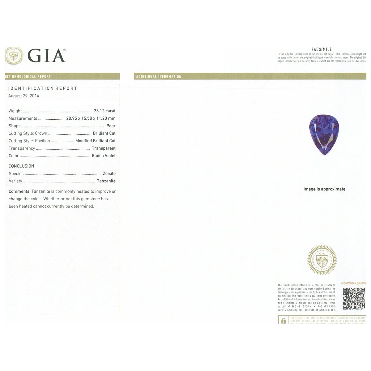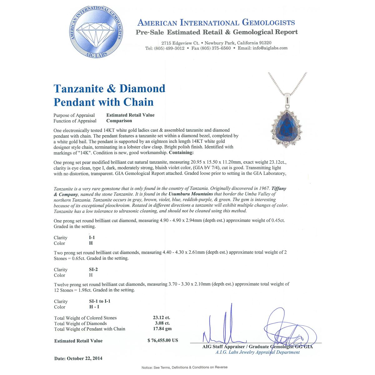 One electronically tested 14KT white gold ladies cast & assembled tanzanite and diamond pendant with chain. The pendant features a tanzanite set within a diamond bezel, completed by a white gold bail. The pendant is supported by an eighteen inch length 14KT white gold designer style chain, terminating in a lobster claw clasp. Bright polish finish. Identified with markings of 14K. Condition is new, good workmanship. Containing: One prong set pear modified brilliant cut natural tanzanite, measuring 20.95 x 15.50 x 11.20mm, exact weight 23.12ct., clarity is eye clean, type I, dark, moderately strong, bluish violet color, (GIA bV 7/4), cut is good. Transmitting light with no distortion, transparent. GIA Gemological Report attached. Graded loose prior to setting in the GIA Laboratory, Report #6167542851.Tanzanite is a very rare gemstone that is only found in the country of Tanzania. Originally discovered in 1967. Tiffany & Company, named the stone Tanzanite. It is found in the Usumburu Mountains that border the Umba Valley of northern Tanzania. Tanzanite occurs in gray, brown, violet, blue, reddish-purple, & green. The gem is interesting because of its exceptional pleochroism. Rotated in different directions a tanzanite will exhibit multiple changes of color. Tanzanite has a low tolerance to ultrasonic cleaning, and should not be cleaned using this method. One prong set round brilliant cut diamond, measuring 4.90 - 4.90 x 2.94mm (depth est.) approximate weight of 0.45ct. Graded in the setting. Clarity: I-1. Color: H Two prong set round brilliant cut diamonds, measuring 4.40 - 4.30 x 2.61mm (depth est.) approximate total weight of 2 Stones = 0.65ct. Graded in the setting. Clarity: SI-2. Color: H Twelve prong set round brilliant cut diamonds, measuring 3.70 - 3.30 x 2.10mm (depth est.) approximate total weight of 12 Stones = 1.98ct. Graded in the setting. Clarity: SI-1 to I-1. Color: H - I. Total Weight of Colored Stones 23.12ct. Total Weight of Diamonds 3.08ct. Total Weight of Pendant With Chain 17.84 grams. AIG Appraised at $76,455.00.