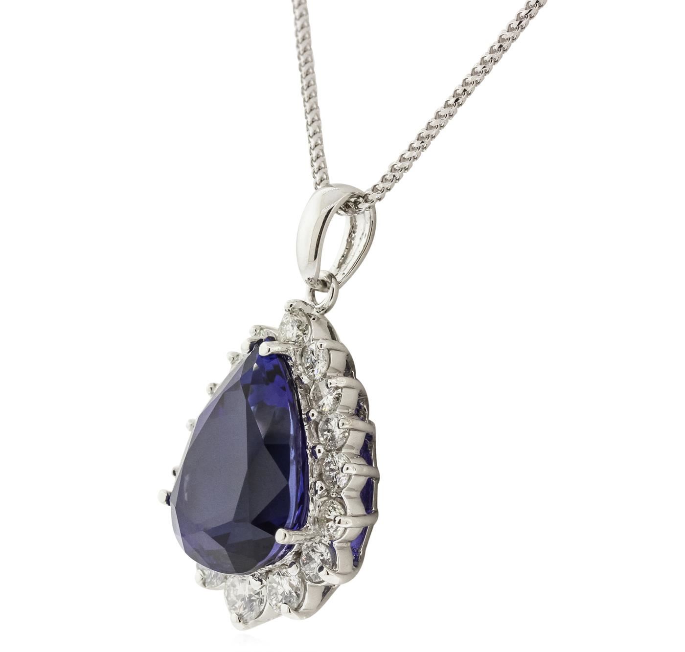 One electronically tested 14KT white gold ladies cast & assembled tanzanite and diamond pendant with chain. The pendant features a tanzanite set within a diamond bezel, completed by a white gold bail. The pendant is supported by an eighteen inch length 14KT white gold designer style chain, terminating in a lobster claw clasp. Bright polish finish. Identified with markings of 14K. Condition is new, good workmanship. Containing: One prong set pear modified brilliant cut natural tanzanite, measuring 20.95 x 15.50 x 11.20mm, exact weight 23.12ct., clarity is eye clean, type I, dark, moderately strong, bluish violet color, (GIA bV 7/4), cut is good. Transmitting light with no distortion, transparent. GIA Gemological Report attached. Graded loose prior to setting in the GIA Laboratory, Report #6167542851.Tanzanite is a very rare gemstone that is only found in the country of Tanzania. Originally discovered in 1967. Tiffany & Company, named the stone Tanzanite. It is found in the Usumburu Mountains that border the Umba Valley of northern Tanzania. Tanzanite occurs in gray, brown, violet, blue, reddish-purple, & green. The gem is interesting because of its exceptional pleochroism. Rotated in different directions a tanzanite will exhibit multiple changes of color. Tanzanite has a low tolerance to ultrasonic cleaning, and should not be cleaned using this method. One prong set round brilliant cut diamond, measuring 4.90 - 4.90 x 2.94mm (depth est.) approximate weight of 0.45ct. Graded in the setting. Clarity: I-1. Color: H Two prong set round brilliant cut diamonds, measuring 4.40 - 4.30 x 2.61mm (depth est.) approximate total weight of 2 Stones = 0.65ct. Graded in the setting. Clarity: SI-2. Color: H Twelve prong set round brilliant cut diamonds, measuring 3.70 - 3.30 x 2.10mm (depth est.) approximate total weight of 12 Stones = 1.98ct. Graded in the setting. Clarity: SI-1 to I-1. Color: H - I. Total Weight of Colored Stones 23.12ct. Total Weight of Diamonds 3.08ct. Total Weight of Pendant With Chain 17.84 grams. AIG Appraised at $76,455.00.