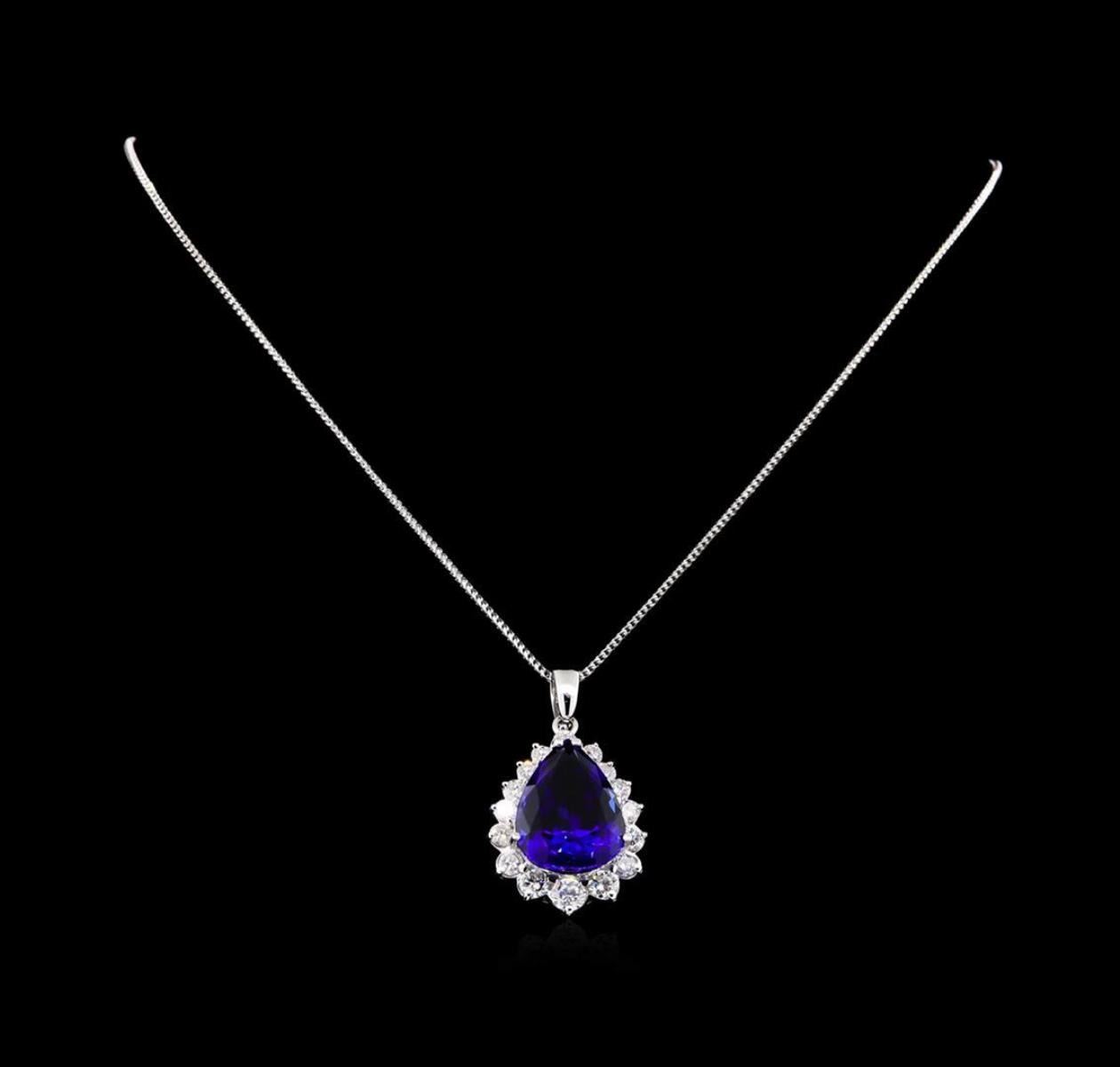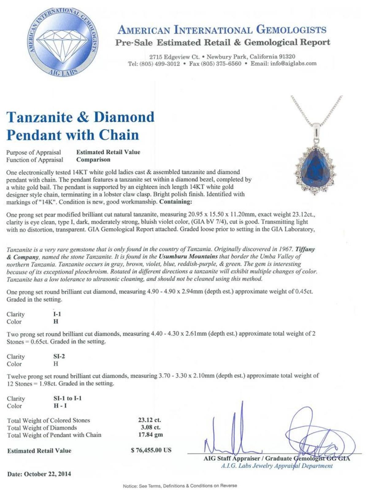 One electronically tested 14KT white gold ladies cast & assembled tanzanite and diamond pendant with chain. The pendant features a tanzanite set within a diamond bezel, completed by a white gold bail. The pendant is supported by an eighteen inch length 14KT white gold designer style chain, terminating in a lobster claw clasp. Bright polish finish. Identified with markings of 14K. Condition is new, good workmanship. Containing: One prong set pear modified brilliant cut natural tanzanite, measuring 20.95 x 15.50 x 11.20mm, exact weight 23.12ct., clarity is eye clean, type I, dark, moderately strong, bluish violet color, (GIA bV 7/4), cut is good. Transmitting light with no distortion, transparent. GIA Gemological Report attached. Graded loose prior to setting in the GIA Laboratory, Report #6167542851.Tanzanite is a very rare gemstone that is only found in the country of Tanzania. Originally discovered in 1967. Tiffany & Company, named the stone Tanzanite. It is found in the Usumburu Mountains that border the Umba Valley of northern Tanzania. Tanzanite occurs in gray, brown, violet, blue, reddish-purple, & green. The gem is interesting because of its exceptional pleochroism. Rotated in different directions a tanzanite will exhibit multiple changes of color. Tanzanite has a low tolerance to ultrasonic cleaning, and should not be cleaned using this method. One prong set round brilliant cut diamond, measuring 4.90 - 4.90 x 2.94mm (depth est.) approximate weight of 0.45ct. Graded in the setting. Clarity: I-1. Color: H Two prong set round brilliant cut diamonds, measuring 4.40 - 4.30 x 2.61mm (depth est.) approximate total weight of 2 Stones = 0.65ct. Graded in the setting. Clarity: SI-2. Color: H Twelve prong set round brilliant cut diamonds, measuring 3.70 - 3.30 x 2.10mm (depth est.) approximate total weight of 12 Stones = 1.98ct. Graded in the setting. Clarity: SI-1 to I-1. Color: H - I. Total Weight of Colored Stones 23.12ct. Total Weight of Diamonds 3.08ct. Total Weight of Pendant With Chain 17.84 grams. AIG Appraised.