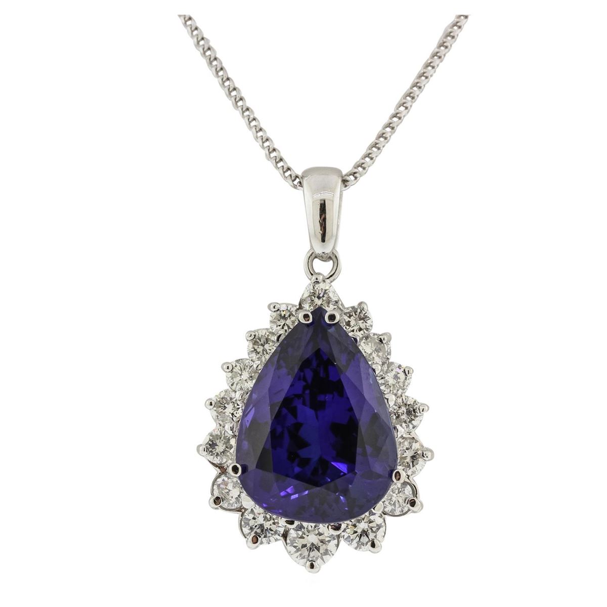 One electronically tested 14KT white gold ladies cast & assembled tanzanite and diamond pendant with chain. The pendant features a tanzanite set within a diamond bezel, completed by a white gold bail. The pendant is supported by an eighteen inch length 14KT white gold designer style chain, terminating in a lobster claw clasp. Bright polish finish. Identified with markings of 14K. Condition is new, good workmanship. Containing: One prong set pear modified brilliant cut natural tanzanite, measuring 20.95 x 15.50 x 11.20mm, exact weight 23.12ct., clarity is eye clean, type I, dark, moderately strong, bluish violet color, (GIA bV 7/4), cut is good. Transmitting light with no distortion, transparent. GIA Gemological Report attached. Graded loose prior to setting in the GIA Laboratory, Report #6167542851.Tanzanite is a very rare gemstone that is only found in the country of Tanzania. Originally discovered in 1967. Tiffany & Company, named the stone Tanzanite. It is found in the Usumburu Mountains that border the Umba Valley of northern Tanzania. Tanzanite occurs in gray, brown, violet, blue, reddish-purple, & green. The gem is interesting because of its exceptional pleochroism. Rotated in different directions a tanzanite will exhibit multiple changes of color. Tanzanite has a low tolerance to ultrasonic cleaning, and should not be cleaned using this method. One prong set round brilliant cut diamond, measuring 4.90 - 4.90 x 2.94mm (depth est.) approximate weight of 0.45ct. Graded in the setting. Clarity: I-1. Color: H Two prong set round brilliant cut diamonds, measuring 4.40 - 4.30 x 2.61mm (depth est.) approximate total weight of 2 Stones = 0.65ct. Graded in the setting. Clarity: SI-2. Color: H Twelve prong set round brilliant cut diamonds, measuring 3.70 - 3.30 x 2.10mm (depth est.) approximate total weight of 12 Stones = 1.98ct. Graded in the setting. Clarity: SI-1 to I-1. Color: H - I. Total Weight of Colored Stones 23.12ct. Total Weight of Diamonds 3.08ct. Total Weight of Pendant With Chain 17.84 grams. AIG Appraised at $76,455.00.