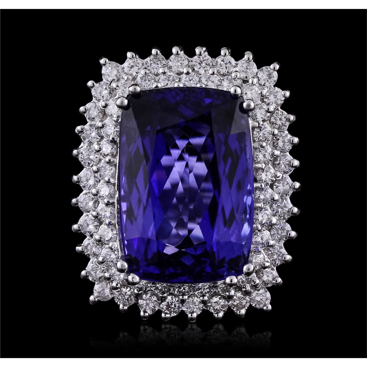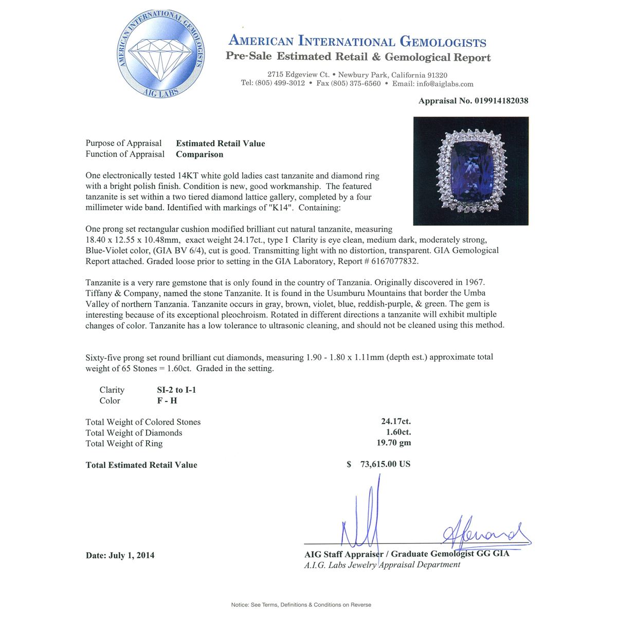 One electronically tested 14KT white gold ladies cast tanzanite and diamond ring with a bright polish finish. Condition is new, good workmanship. The featured tanzanite is set within a two tiered diamond lattice gallery, completed by a four millimeter wide band. Identified with markings of "K14". Containing: One prong set rectangular cushion modified brilliant cut natural tanzanite, measuring 18.40 x 12.55 x 10.48mm, exact weight 24.17ct., type I Clarity is eye clean, medium dark, moderately strong, Blue-Violet color, (GIA BV 6/4), cut is good. Transmitting light with no distortion, transparent. GIA Gemological Report attached. Graded loose prior to setting in the GIA Laboratory, Report # 6167077832.Tanzanite is a very rare gemstone that is only found in the country of Tanzania. Originally discovered in 1967. Tiffany & Company, named the stone Tanzanite. It is found in the Usumburu Mountains that border the Umba Valley of northern Tanzania. Tanzanite occurs in gray, brown, violet, blue, reddish-purple, & green. The gem is interesting because of its exceptional pleochroism. Rotated in different directions a tanzanite will exhibit multiple changes of color. Tanzanite has a low tolerance to ultrasonic cleaning, and should not be cleaned using this method. Sixty-Five prong set round brilliant cut diamonds, measuring 1.90 - 1.80 x 1.11mm (depth est.) approximate total weight of 65 Stones = 1.60ct. Graded in the setting. Clarity: SI-2 to I-1 . Color: F - H. Total Weight of Colored Stones 24.17ct. Total Weight of Diamonds 1.60ct. Total Weight of Ring 19.70 grams. AIG Appraised at $73,615.00.