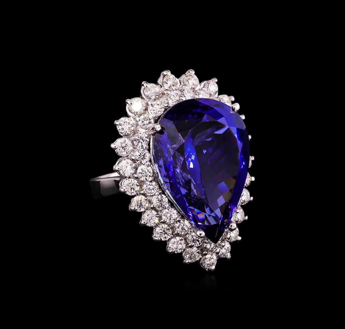 One electronically tested 14KT white gold ladies cast tanzanite and diamond ring with a bright polish finish. Condition is new, good workmanship. The featured tanzanite is set within two tiered diamond bezels, completed by a three millimeter wide band. Identified with markings of "K14". Containing: One prong set pear modified brilliant cut natural tanzanite, measuring 22.57 x 15.46 x 11.55mm, exact weight 24.90ct., clarity is eye clean, type I, dark, moderately strong, violetish blue color, (GIA vB 7/4), cut is good. Transmitting light with no distortion, transparent. GIA Gemological Report attached. Graded loose prior to setting in the GIA Laboratory, Report #2161077461.Tanzanite is a very rare gemstone that is only found in the country of Tanzania. Originally discovered in 1967. Tiffany & Company, named the stone Tanzanite. It is found in the Usumburu Mountains that border the Umba Valley of northern Tanzania. Tanzanite occurs in gray, brown, violet, blue, reddish-purple, & green. The gem is interesting because of its exceptional pleochroism. Rotated in different directions a tanzanite will exhibit multiple changes of color. Tanzanite has a low tolerance to ultrasonic cleaning, and should not be cleaned using this method. Forty-Seven prong set round brilliant cut diamonds, measuring 2.50 - 2.40 x 1.47mm (depth est.) approximate total weight of 47 Stones = 2.62ct. Graded in the setting. Clarity: SI-1 to I-1 . Color: G - I. Total Weight of Colored Stones 24.90ct. Total Weight of Diamonds 2.62ct. Total Weight of Ring 17.12 grams. AIG Appraised at $72,530.00.