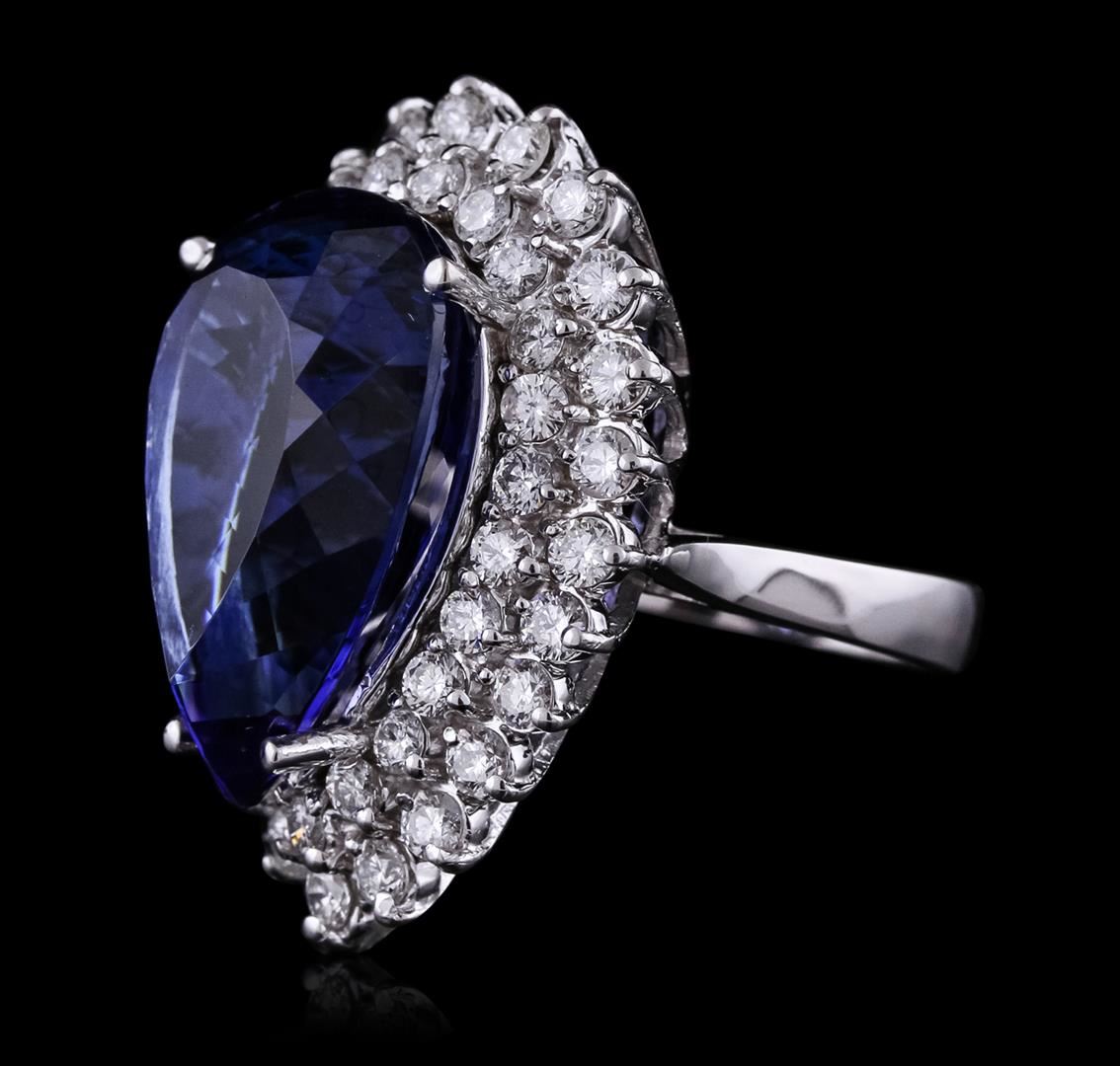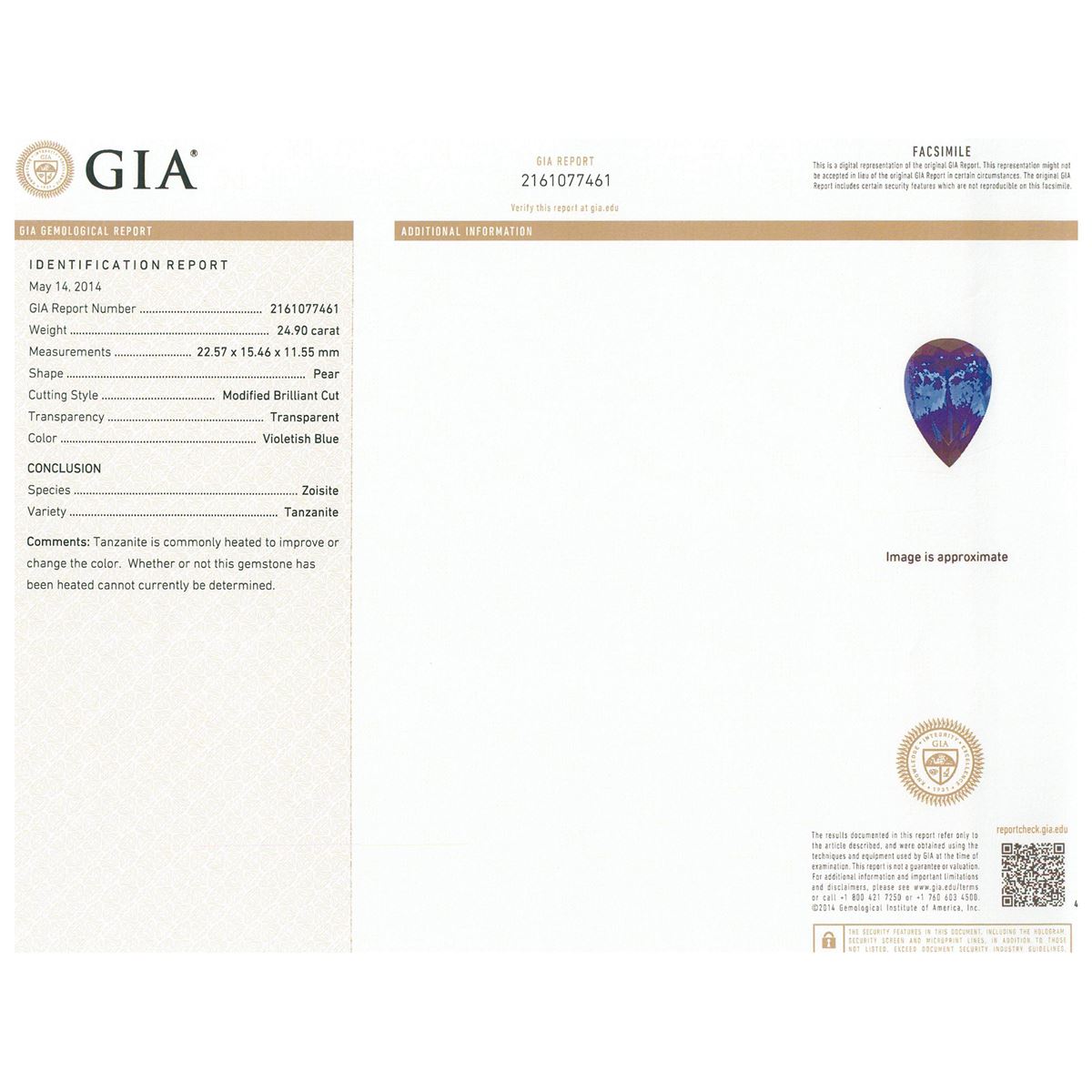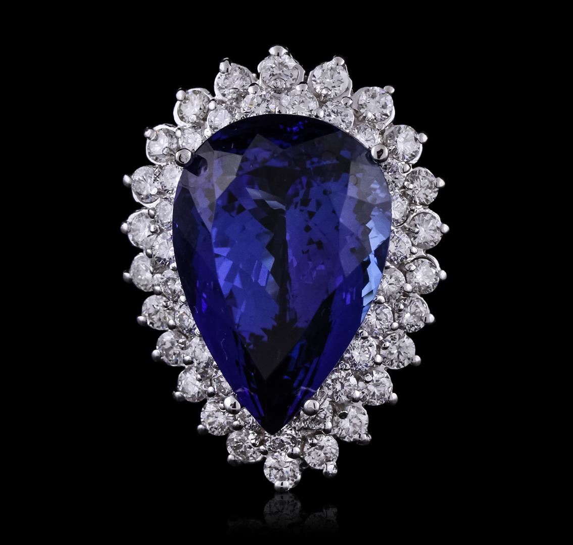 One electronically tested 14KT white gold ladies cast tanzanite and diamond ring with a bright polish finish. Condition is new, good workmanship. The featured tanzanite is set within two tiered diamond bezels, completed by a three millimeter wide band. Identified with markings of "K14". Containing: One prong set pear modified brilliant cut natural tanzanite, measuring 22.57 x 15.46 x 11.55mm, exact weight 24.90ct., clarity is eye clean, type I, dark, moderately strong, violetish blue color, (GIA vB 7/4), cut is good. Transmitting light with no distortion, transparent. GIA Gemological Report attached. Graded loose prior to setting in the GIA Laboratory, Report #2161077461.Tanzanite is a very rare gemstone that is only found in the country of Tanzania. Originally discovered in 1967. Tiffany & Company, named the stone Tanzanite. It is found in the Usumburu Mountains that border the Umba Valley of northern Tanzania. Tanzanite occurs in gray, brown, violet, blue, reddish-purple, & green. The gem is interesting because of its exceptional pleochroism. Rotated in different directions a tanzanite will exhibit multiple changes of color. Tanzanite has a low tolerance to ultrasonic cleaning, and should not be cleaned using this method. Forty-Seven prong set round brilliant cut diamonds, measuring 2.50 - 2.40 x 1.47mm (depth est.) approximate total weight of 47 Stones = 2.62ct. Graded in the setting. Clarity: SI-1 to I-1 . Color: G - I. Total Weight of Colored Stones 24.90ct. Total Weight of Diamonds 2.62ct. Total Weight of Ring 17.12 grams. AIG Appraised at $72,530.00.