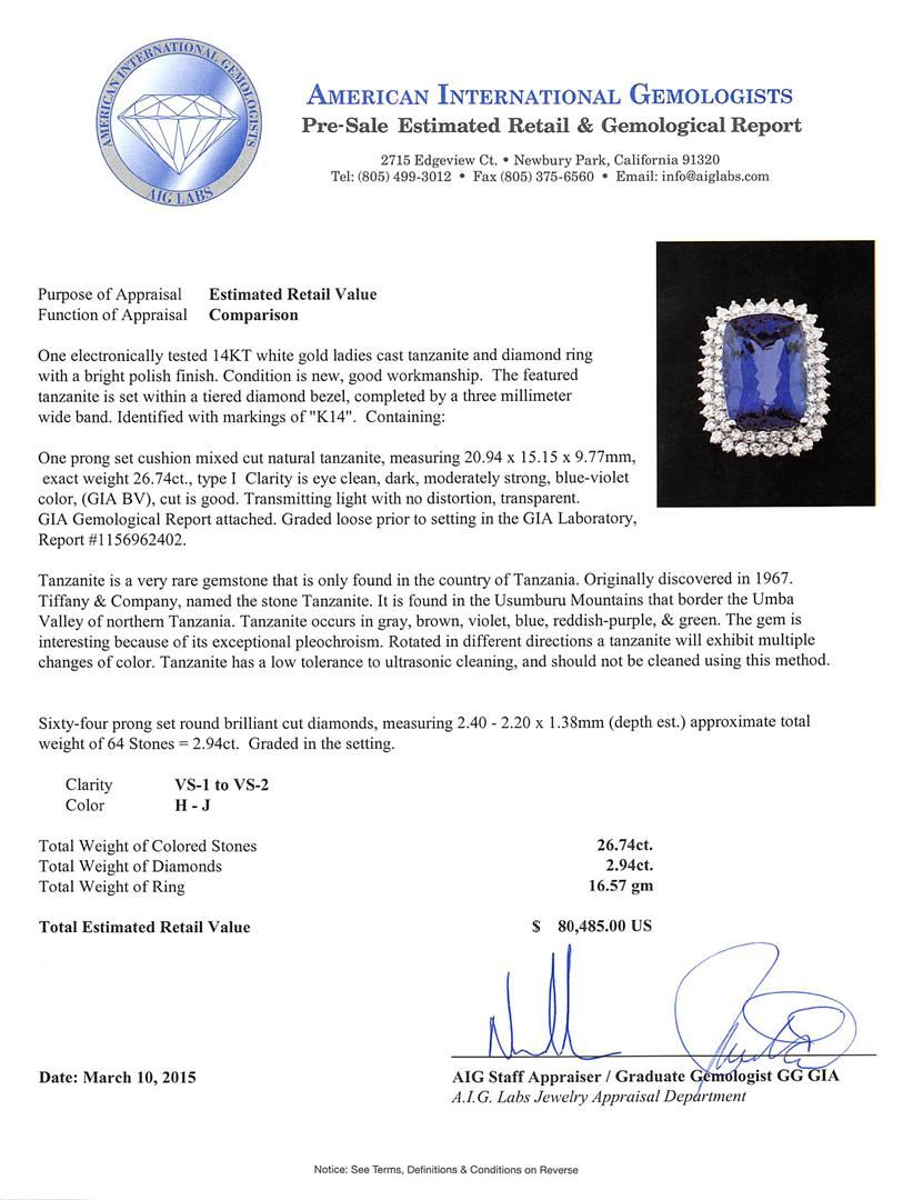 One electronically tested 14KT white gold ladies cast tanzanite and diamond ring with a bright polish finish. The featured tanzanite is set within a tiered diamond bezel, completed by a three millimeter wide band. Identified with markings of "K14". Condition is new, good workmanship. Containing: One prong set cushion mixed cut natural tanzanite, measuring 20.94 x 15.15 x 9.77mm, exact weight 26.74ct., type I Clarity is eye clean, dark, moderately strong, blue-violet color, (GIA BV), cut is good. Transmitting light with no distortion, transparent. GIA Gemological Report attached. Graded loose prior to setting in the GIA Laboratory, Report #1156962402. Tanzanite is a very rare gemstone that is only found in the country of Tanzania. Originally discovered in 1967. Tiffany & Company, named the stone Tanzanite. It is found in the Usumburu Mountains that border the Umba Valley of northern Tanzania. Tanzanite occurs in gray, brown, violet, blue, reddish-purple, & green. The gem is interesting because of its exceptional pleochroism. Rotated in different directions a tanzanite will exhibit multiple changes of color. Tanzanite has a low tolerance to ultrasonic cleaning, and should not be cleaned using this method.Sixty-Four prong set round brilliant cut diamonds, measuring 2.40 - 2.20 x 1.38mm (depth est.) approximate total weight of 64 Stones = 2.94ct. Graded in the setting. Clarity: VS-1 to VS-2. Color: H - J. Total Weight of Colored Stones 26.74ct. Total Weight of Diamonds 2.94ct. Total Weight of Ring 16.57 grams. AIG Appraised at $80,485.00.