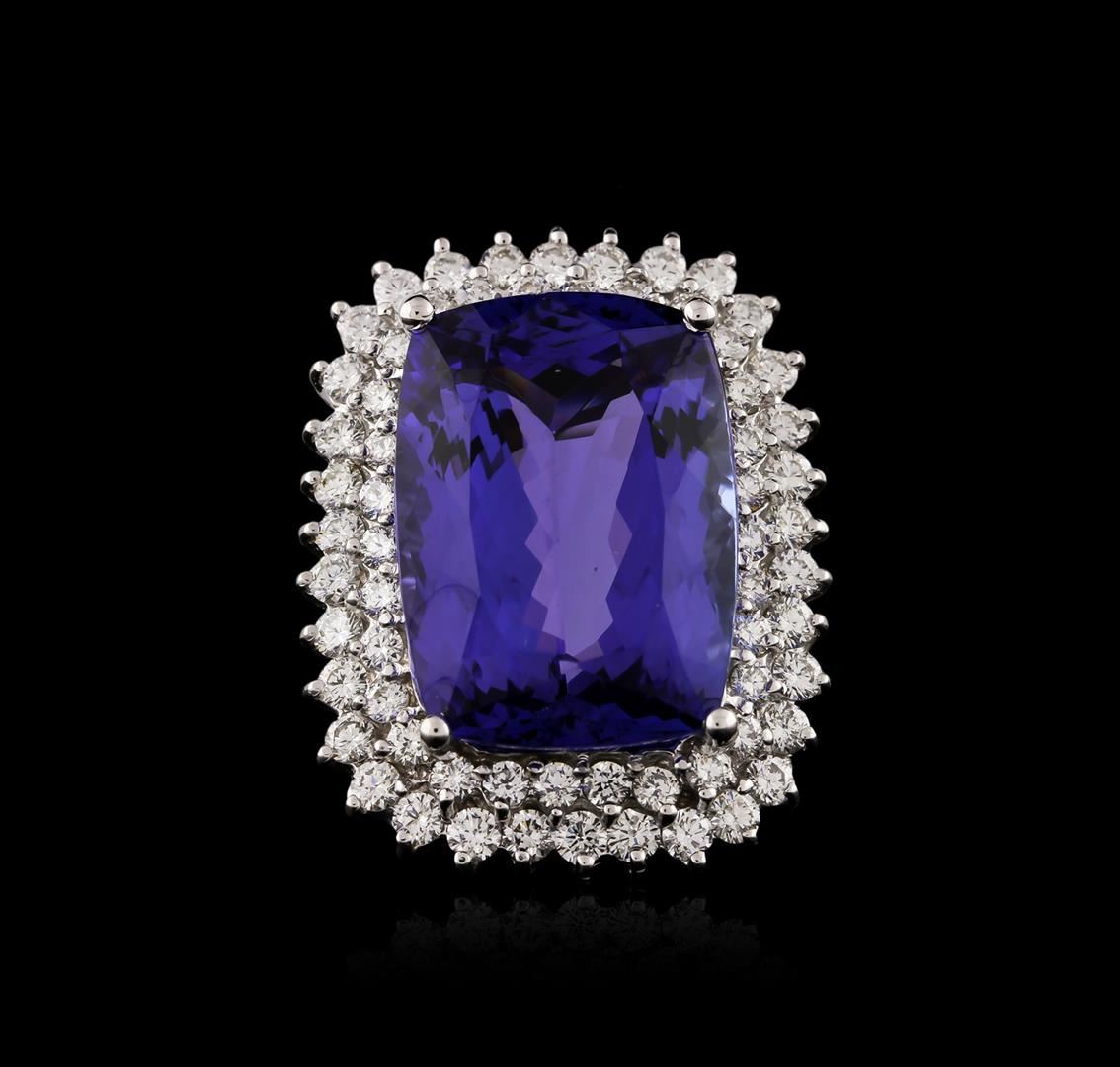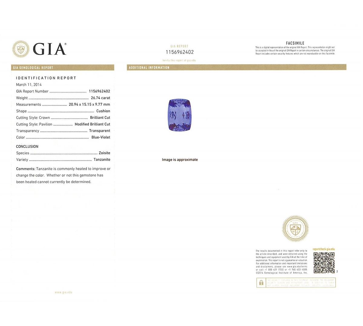 One electronically tested 14KT white gold ladies cast tanzanite and diamond ring with a bright polish finish. The featured tanzanite is set within a tiered diamond bezel, completed by a three millimeter wide band. Identified with markings of "K14". Condition is new, good workmanship. Containing: One prong set cushion mixed cut natural tanzanite, measuring 20.94 x 15.15 x 9.77mm, exact weight 26.74ct., type I Clarity is eye clean, dark, moderately strong, blue-violet color, (GIA BV), cut is good. Transmitting light with no distortion, transparent. GIA Gemological Report attached. Graded loose prior to setting in the GIA Laboratory, Report #1156962402. Tanzanite is a very rare gemstone that is only found in the country of Tanzania. Originally discovered in 1967. Tiffany & Company, named the stone Tanzanite. It is found in the Usumburu Mountains that border the Umba Valley of northern Tanzania. Tanzanite occurs in gray, brown, violet, blue, reddish-purple, & green. The gem is interesting because of its exceptional pleochroism. Rotated in different directions a tanzanite will exhibit multiple changes of color. Tanzanite has a low tolerance to ultrasonic cleaning, and should not be cleaned using this method.Sixty-Four prong set round brilliant cut diamonds, measuring 2.40 - 2.20 x 1.38mm (depth est.) approximate total weight of 64 Stones = 2.94ct. Graded in the setting. Clarity: VS-1 to VS-2. Color: H - J. Total Weight of Colored Stones 26.74ct. Total Weight of Diamonds 2.94ct. Total Weight of Ring 16.57 grams. AIG Appraised at $80,485.00.