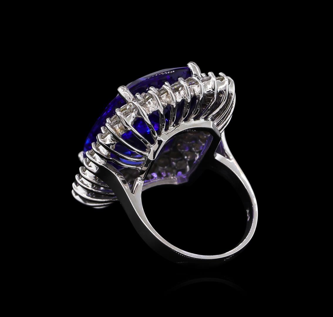 One electronically tested 14KT white gold ladies cast tanzanite and diamond ring with a bright polish finish. The featured tanzanite is set within a tiered diamond bezel, completed by a three millimeter wide band. Identified with markings of "K14". Condition is new, good workmanship. Containing: One prong set cushion mixed cut natural tanzanite, measuring 20.94 x 15.15 x 9.77mm, exact weight 26.74ct., type I Clarity is eye clean, dark, moderately strong, blue-violet color, (GIA BV), cut is good. Transmitting light with no distortion, transparent. GIA Gemological Report attached. Graded loose prior to setting in the GIA Laboratory, Report #1156962402. Tanzanite is a very rare gemstone that is only found in the country of Tanzania. Originally discovered in 1967. Tiffany & Company, named the stone Tanzanite. It is found in the Usumburu Mountains that border the Umba Valley of northern Tanzania. Tanzanite occurs in gray, brown, violet, blue, reddish-purple, & green. The gem is interesting because of its exceptional pleochroism. Rotated in different directions a tanzanite will exhibit multiple changes of color. Tanzanite has a low tolerance to ultrasonic cleaning, and should not be cleaned using this method.Sixty-Four prong set round brilliant cut diamonds, measuring 2.40 - 2.20 x 1.38mm (depth est.) approximate total weight of 64 Stones = 2.94ct. Graded in the setting. Clarity: VS-1 to VS-2. Color: H - J. Total Weight of Colored Stones 26.74ct. Total Weight of Diamonds 2.94ct. Total Weight of Ring 16.57 grams. AIG Appraised at $80,485.00.
