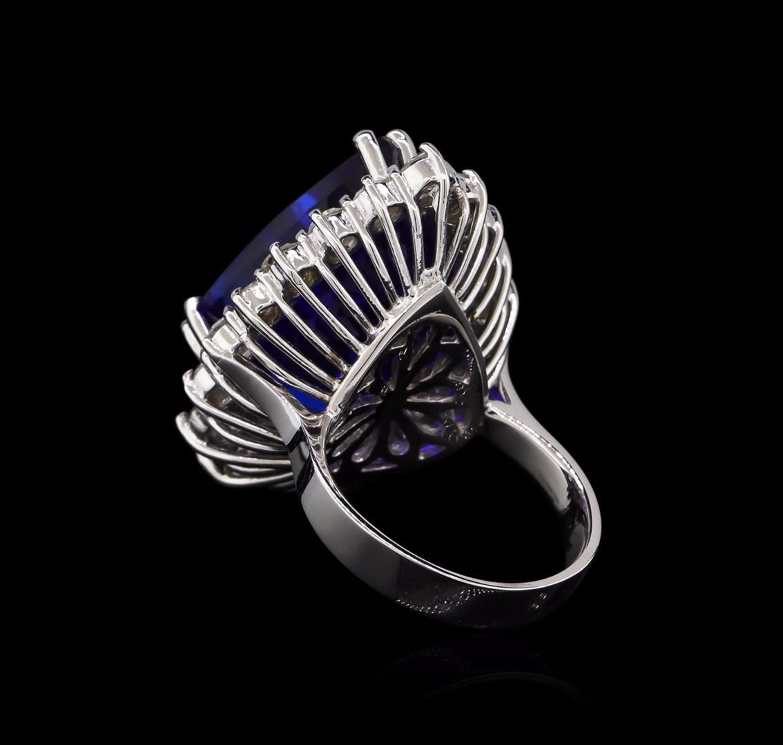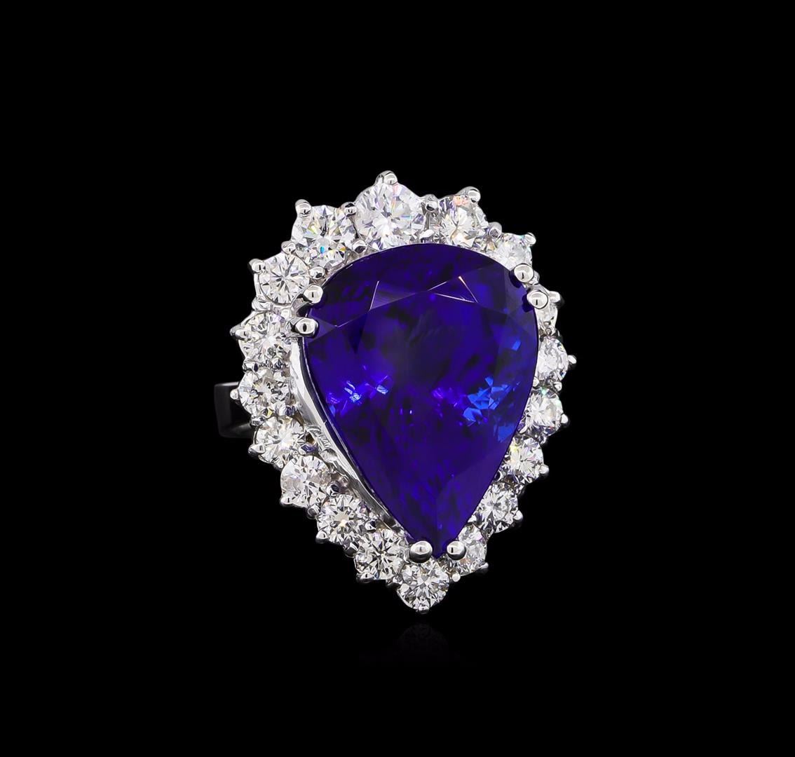 One electronically tested 14KT white gold ladies cast tanzanite and diamond ring with a bright polish finish. The featured tanzanite is set within a diamond bezel, completed by a three and one-half millimeter wide band. Identified with markings of "K14". Condition is new, good workmanship. Containing: One prong set pear modified brilliant cut natural tanzanite, measuring 21.01 x 15.89 x 12.91mm, approximate weight of 27.66ct., clarity is eye clean, type I, dark, moderately strong, violetish blue color, (GIA vB 7/4), cut is good. Transmitting light with no distortion, transparent. GIA Gemological Report attached. Graded loose prior to setting in the GIA Laboratory, Report#6157735078.Tanzanite is a very rare gemstone that is only found in the country of Tanzania. Originally discovered in 1967. Tiffany & Company, named the stone Tanzanite. It is found in the Usumburu Mountains that border the Umba Valley of northern Tanzania. Tanzanite occurs in gray, brown, violet, blue, reddish-purple, & green. The gem is interesting because of its exceptional pleochroism. Rotated in different directions a tanzanite will exhibit multiple changes of color. Tanzanite has a low tolerance to ultrasonic cleaning, and should not be cleaned using this method. Three prong set round brilliant cut diamonds, measuring 4.70 - 4.20 x 2.67mm (depth est.) approximate total weight of 3 Stones = 1.06ct. Graded in the setting. Clarity: SI-2 to I-1. Color: G - H Fifteen prong set round brilliant cut diamonds, measuring 3.60 - 3.50 x 2.13mm (depth est.) approximate total weight of 15 Stones = 2.55ct. Graded in the setting. Clarity: SI-2 to I-1. Color: G - I. Total Weight of Colored Stones 27.66ct. Total Weight of Diamonds 3.61ct. Total Weight of Ring 17.62 grams. AIG Appraised at $84,640.00.