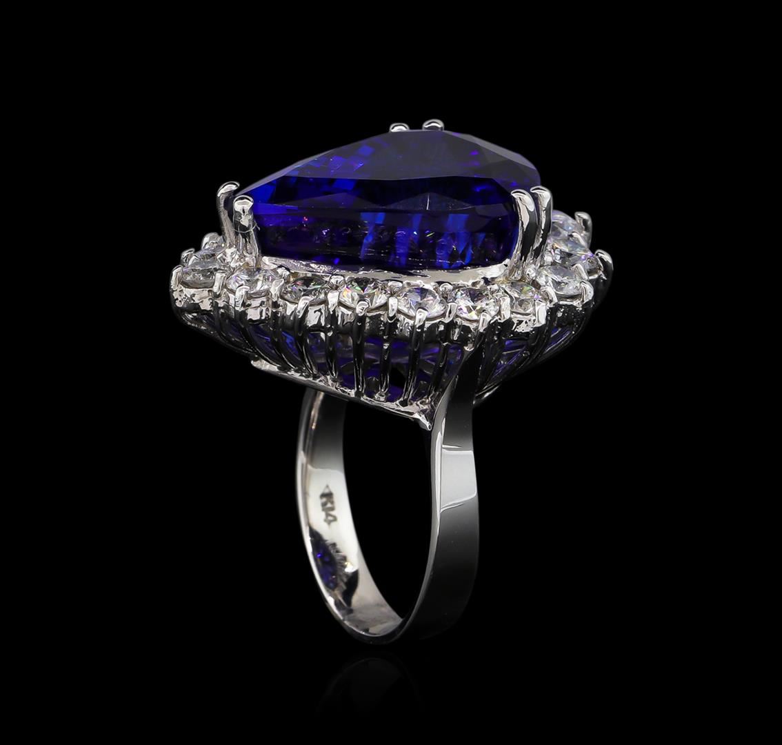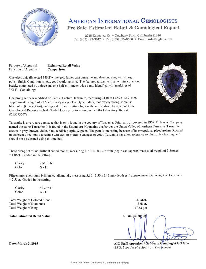 One electronically tested 14KT white gold ladies cast tanzanite and diamond ring with a bright polish finish. The featured tanzanite is set within a diamond bezel, completed by a three and one-half millimeter wide band. Identified with markings of "K14". Condition is new, good workmanship. Containing: One prong set pear modified brilliant cut natural tanzanite, measuring 21.01 x 15.89 x 12.91mm, approximate weight of 27.66ct., clarity is eye clean, type I, dark, moderately strong, violetish blue color, (GIA vB 7/4), cut is good. Transmitting light with no distortion, transparent. GIA Gemological Report attached. Graded loose prior to setting in the GIA Laboratory, Report#6157735078.Tanzanite is a very rare gemstone that is only found in the country of Tanzania. Originally discovered in 1967. Tiffany & Company, named the stone Tanzanite. It is found in the Usumburu Mountains that border the Umba Valley of northern Tanzania. Tanzanite occurs in gray, brown, violet, blue, reddish-purple, & green. The gem is interesting because of its exceptional pleochroism. Rotated in different directions a tanzanite will exhibit multiple changes of color. Tanzanite has a low tolerance to ultrasonic cleaning, and should not be cleaned using this method. Three prong set round brilliant cut diamonds, measuring 4.70 - 4.20 x 2.67mm (depth est.) approximate total weight of 3 Stones = 1.06ct. Graded in the setting. Clarity: SI-2 to I-1. Color: G - H Fifteen prong set round brilliant cut diamonds, measuring 3.60 - 3.50 x 2.13mm (depth est.) approximate total weight of 15 Stones = 2.55ct. Graded in the setting. Clarity: SI-2 to I-1. Color: G - I. Total Weight of Colored Stones 27.66ct. Total Weight of Diamonds 3.61ct. Total Weight of Ring 17.62 grams. AIG Appraised at $84,640.00.