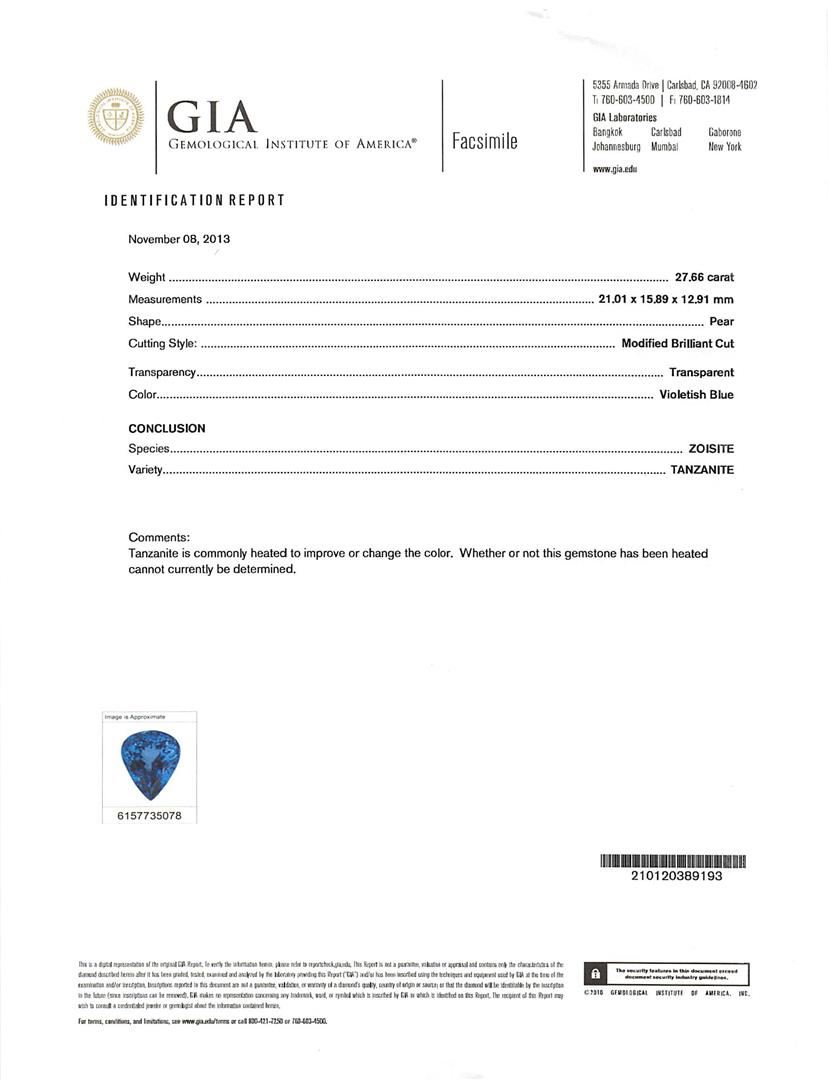 One electronically tested 14KT white gold ladies cast tanzanite and diamond ring with a bright polish finish. The featured tanzanite is set within a diamond bezel, completed by a three and one-half millimeter wide band. Identified with markings of "K14". Condition is new, good workmanship. Containing: One prong set pear modified brilliant cut natural tanzanite, measuring 21.01 x 15.89 x 12.91mm, approximate weight of 27.66ct., clarity is eye clean, type I, dark, moderately strong, violetish blue color, (GIA vB 7/4), cut is good. Transmitting light with no distortion, transparent. GIA Gemological Report attached. Graded loose prior to setting in the GIA Laboratory, Report#6157735078.Tanzanite is a very rare gemstone that is only found in the country of Tanzania. Originally discovered in 1967. Tiffany & Company, named the stone Tanzanite. It is found in the Usumburu Mountains that border the Umba Valley of northern Tanzania. Tanzanite occurs in gray, brown, violet, blue, reddish-purple, & green. The gem is interesting because of its exceptional pleochroism. Rotated in different directions a tanzanite will exhibit multiple changes of color. Tanzanite has a low tolerance to ultrasonic cleaning, and should not be cleaned using this method. Three prong set round brilliant cut diamonds, measuring 4.70 - 4.20 x 2.67mm (depth est.) approximate total weight of 3 Stones = 1.06ct. Graded in the setting. Clarity: SI-2 to I-1. Color: G - H Fifteen prong set round brilliant cut diamonds, measuring 3.60 - 3.50 x 2.13mm (depth est.) approximate total weight of 15 Stones = 2.55ct. Graded in the setting. Clarity: SI-2 to I-1. Color: G - I. Total Weight of Colored Stones 27.66ct. Total Weight of Diamonds 3.61ct. Total Weight of Ring 17.62 grams. AIG Appraised at $84,640.00.