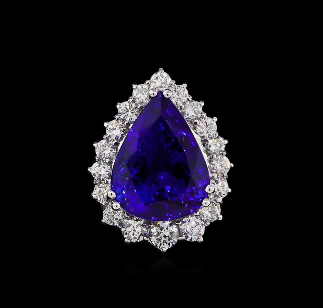 One electronically tested 14KT white gold ladies cast tanzanite and diamond ring with a bright polish finish. The featured tanzanite is set within a diamond bezel, completed by a three and one-half millimeter wide band. Identified with markings of "K14". Condition is new, good workmanship. Containing: One prong set pear modified brilliant cut natural tanzanite, measuring 21.01 x 15.89 x 12.91mm, approximate weight of 27.66ct., clarity is eye clean, type I, dark, moderately strong, violetish blue color, (GIA vB 7/4), cut is good. Transmitting light with no distortion, transparent. GIA Gemological Report attached. Graded loose prior to setting in the GIA Laboratory, Report#6157735078.Tanzanite is a very rare gemstone that is only found in the country of Tanzania. Originally discovered in 1967. Tiffany & Company, named the stone Tanzanite. It is found in the Usumburu Mountains that border the Umba Valley of northern Tanzania. Tanzanite occurs in gray, brown, violet, blue, reddish-purple, & green. The gem is interesting because of its exceptional pleochroism. Rotated in different directions a tanzanite will exhibit multiple changes of color. Tanzanite has a low tolerance to ultrasonic cleaning, and should not be cleaned using this method. Three prong set round brilliant cut diamonds, measuring 4.70 - 4.20 x 2.67mm (depth est.) approximate total weight of 3 Stones = 1.06ct. Graded in the setting. Clarity: SI-2 to I-1. Color: G - H Fifteen prong set round brilliant cut diamonds, measuring 3.60 - 3.50 x 2.13mm (depth est.) approximate total weight of 15 Stones = 2.55ct. Graded in the setting. Clarity: SI-2 to I-1. Color: G - I. Total Weight of Colored Stones 27.66ct. Total Weight of Diamonds 3.61ct. Total Weight of Ring 17.62 grams. AIG Appraised at $84,640.00.