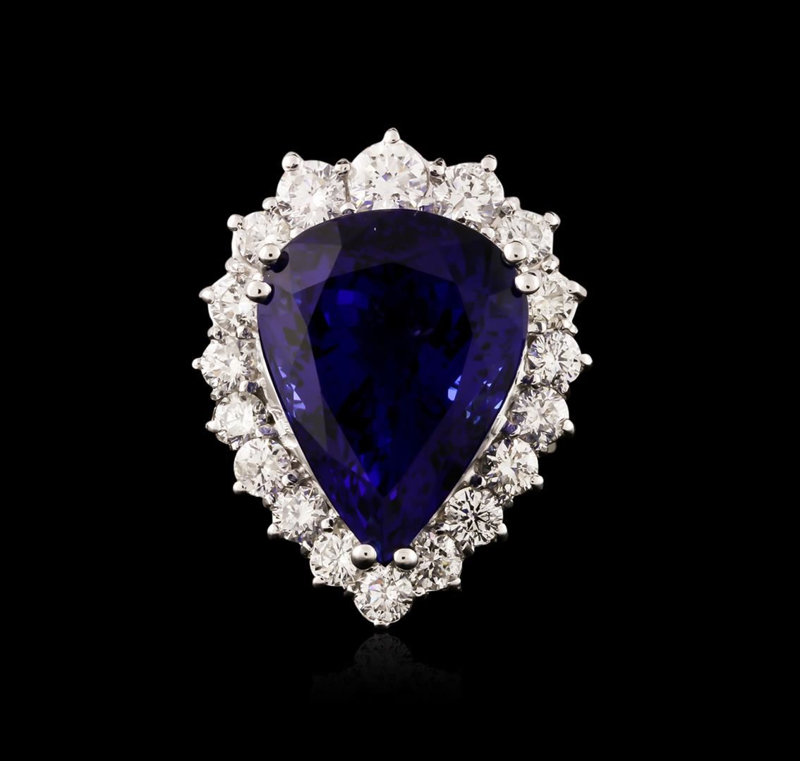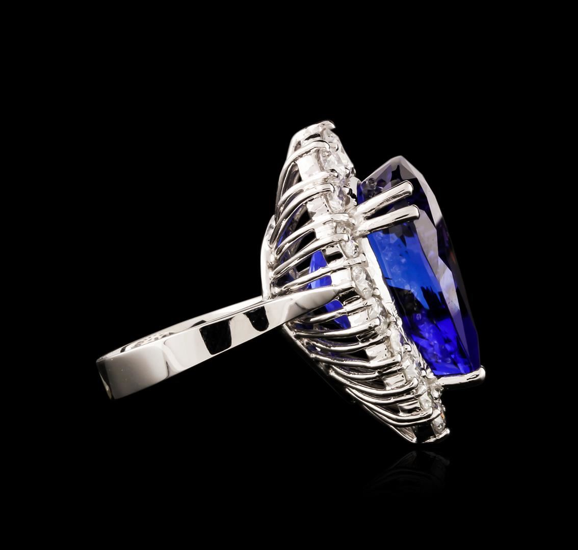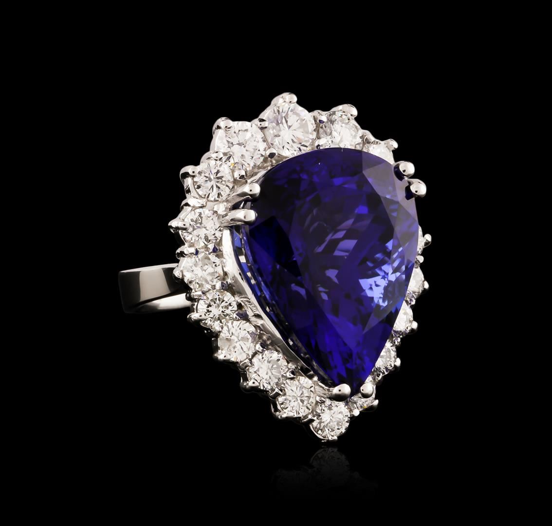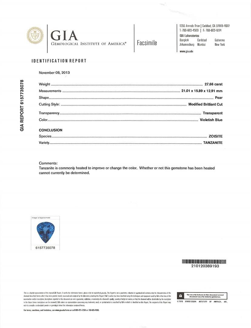 One electronically tested 14KT white gold ladies cast tanzanite and diamond ring with a bright polish finish. The featured tanzanite is set within a diamond bezel, completed by a three and one-half millimeter wide band. Identified with markings of "K14". Condition is new, good workmanship. Containing: One prong set pear modified brilliant cut natural tanzanite, measuring 21.01 x 15.89 x 12.91mm, approximate weight of 27.66ct., clarity is eye clean, type I, dark, moderately strong, violetish blue color, (GIA vB 7/4), cut is good. Transmitting light with no distortion, transparent. GIA Gemological Report attached. Graded loose prior to setting in the GIA Laboratory, Report#6157735078.Tanzanite is a very rare gemstone that is only found in the country of Tanzania. Originally discovered in 1967. Tiffany & Company, named the stone Tanzanite. It is found in the Usumburu Mountains that border the Umba Valley of northern Tanzania. Tanzanite occurs in gray, brown, violet, blue, reddish-purple, & green. The gem is interesting because of its exceptional pleochroism. Rotated in different directions a tanzanite will exhibit multiple changes of color. Tanzanite has a low tolerance to ultrasonic cleaning, and should not be cleaned using this method. Three prong set round brilliant cut diamonds, measuring 4.70 - 4.20 x 2.67mm (depth est.) approximate total weight of 3 Stones = 1.06ct. Graded in the setting. Clarity: SI-2 to I-1. Color: G - H Fifteen prong set round brilliant cut diamonds, measuring 3.60 - 3.50 x 2.13mm (depth est.) approximate total weight of 15 Stones = 2.55ct. Graded in the setting. Clarity: SI-2 to I-1. Color: G - I. Total Weight of Colored Stones 27.66ct. Total Weight of Diamonds 3.61ct. Total Weight of Ring 17.62 grams. AIG Appraised at $84,640.00.