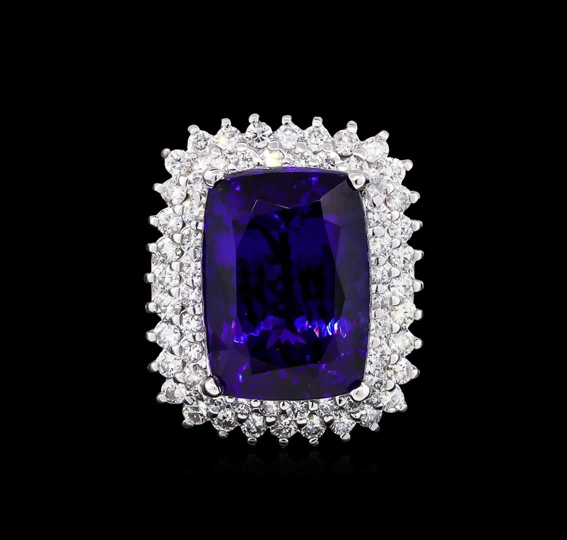 One electronically tested 14KT white gold ladies cast tanzanite and diamond ring with a bright polish finish. Condition is new, good workmanship. The featured tanzanite is set within a diamond lattice gallery, completed by a three millimeter wide. Identified with markings of "K14". Containing: One prong set rectangular cushion modified brilliant cut natural tanzanite, measuring 19.52 x 14.23 x 11.45mm, approximate weight of 27.79ct., clarity is eye clean, type I, medium dark, moderately strong, bluish violet color, (GIA bV 6/4), cut is good. Transmitting light with no distortion, transparent. GIA Gemological Report attached. Graded loose prior to setting in the GIA Laboratory, Report # 6167077697.Tanzanite is a very rare gemstone that is only found in the country of Tanzania. Originally discovered in 1967. Tiffany & Company, named the stone Tanzanite. It is found in the Usumburu Mountains that border the Umba Valley of northern Tanzania. Tanzanite occurs in gray, brown, violet, blue, reddish-purple, & green. The gem is interesting because of its exceptional pleochroism. Rotated in different directions a tanzanite will exhibit multiple changes of color. Tanzanite has a low tolerance to ultrasonic cleaning, and should not be cleaned using this method. Sixty prong set round brilliant cut diamonds, measuring 2.30 - 2.20 x 1.35mm (depth est.) approximate total weight of 60 Stones = 2.59ct. Graded in the setting. Clarity: I-1 to I-2 . Color: F - H. Total Weight of Colored Stones 27.79ct. Total Weight of Diamonds 2.59ct. Total Weight of Ring 19.40 grams. AIG Appraised at $86,785.00.