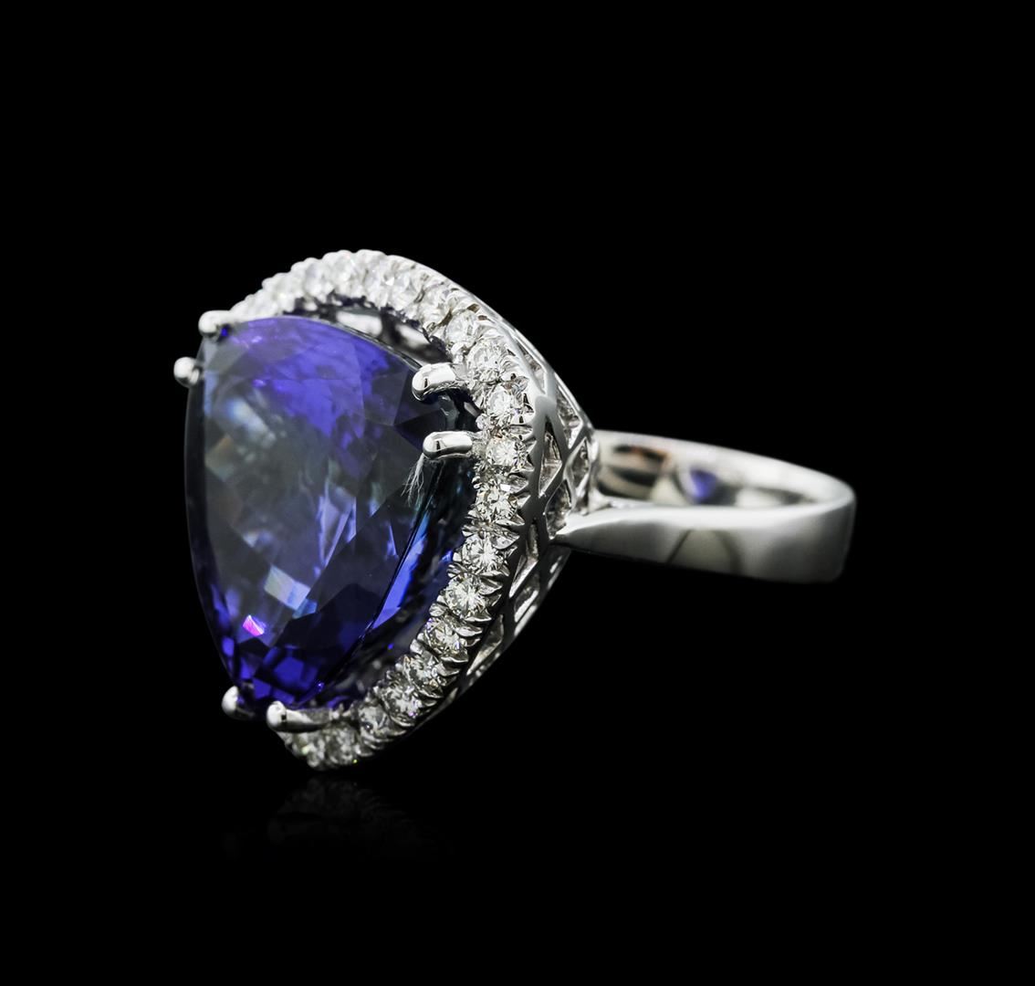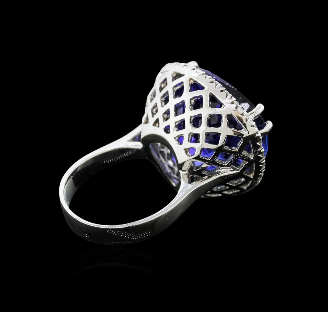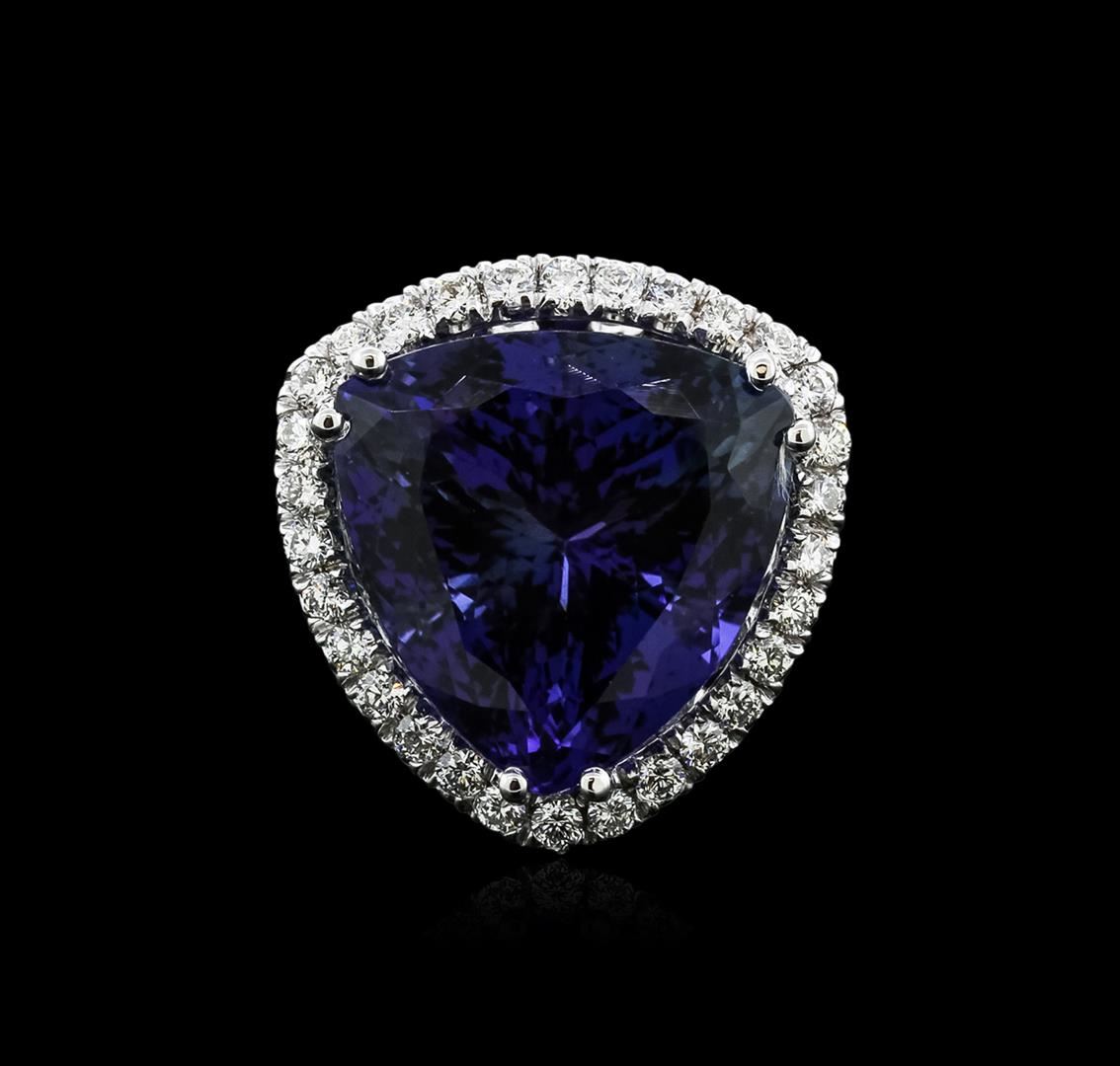 One electronically tested 14KT white gold ladies cast tanzanite and diamond ring with a bright polish finish. The featured tanzanite is set within a diamond bezel supported by a lattice under gallery, completed by a four millimeter wide band. Identified with markings of "K14". Condition is new, good workmanship. Containing: One prong set triangular modified brilliant cut natural tanzanite, measuring 18.81 x 19.00 x 13.47mm, exact weight 28.41ct., clarity is eye clean, type I, dark, moderately strong, bluish violet color, (GIA bV 7/4), cut is good. Transmitting light with no distortion, transparent. GIA Gemological Report attached. Graded loose prior to setting in the GIA Laboratory, Report #6157962263.Tanzanite is a very rare gemstone that is only found in the country of Tanzania. Originally discovered in 1967. Tiffany & Company, named the stone Tanzanite. It is found in the Usumburu Mountains that border the Umba Valley of northern Tanzania. Tanzanite occurs in gray, brown, violet, blue, reddish-purple, & green. The gem is interesting because of its exceptional pleochroism. Rotated in different directions a tanzanite will exhibit multiple changes of color. Tanzanite has a low tolerance to ultrasonic cleaning, and should not be cleaned using this method. Thirty prong set round brilliant cut diamonds, measuring 2.10 - 2.00 x 1.23mm (depth est.) approximate total weight of 30 Stones = 1.05ct. Graded in the setting. Clarity: VS-2 to SI-1. Color: H - J. Total Weight of Colored Stones 28.41ct. Total Weight of Diamonds 1.05ct. Total Weight of Ring 15.87 grams. AIG Appraised at $77,775.00.