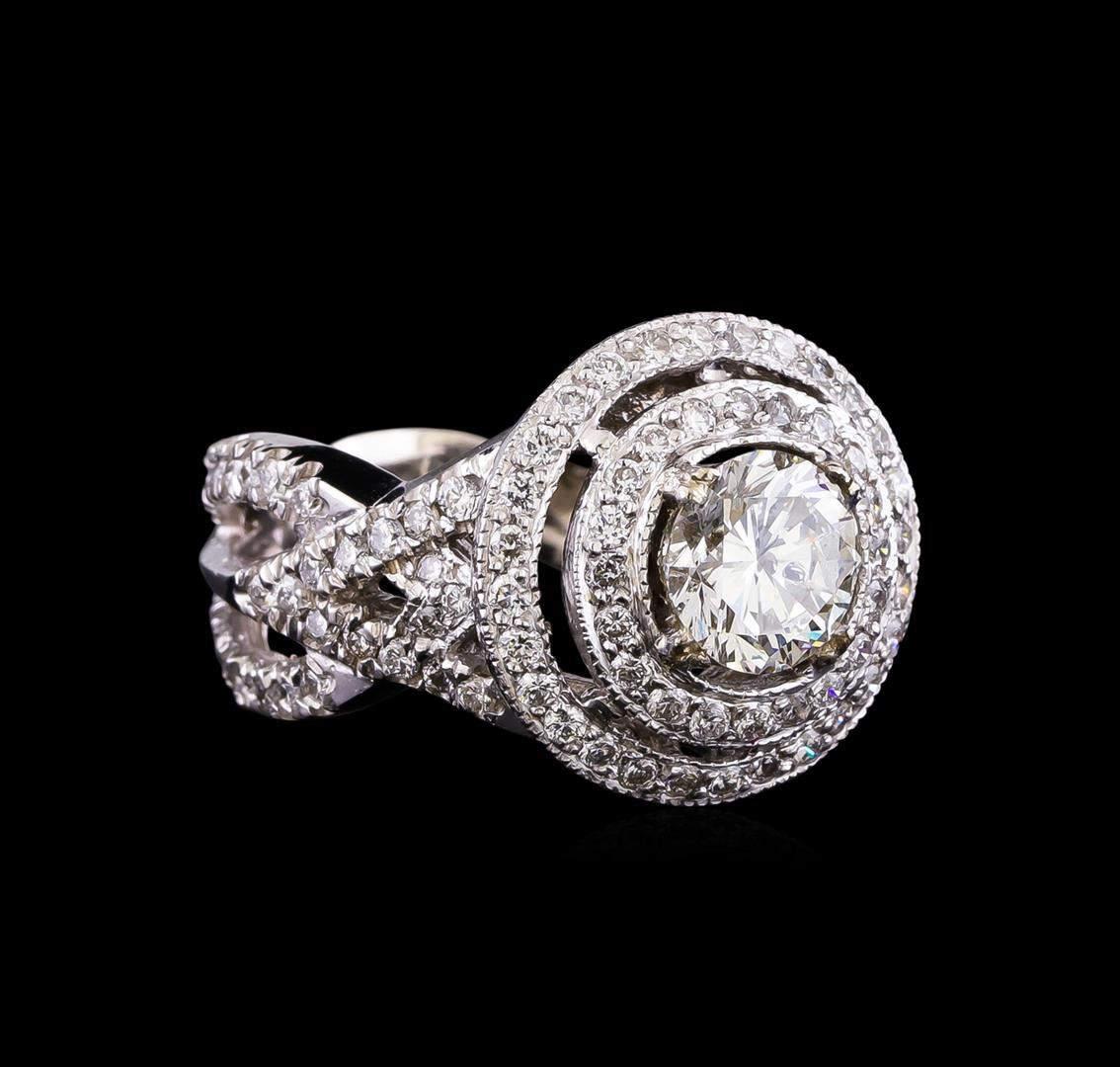 One electronically tested 14KT white gold ladies cast diamond unity ring. The featured diamond is set within two tiered diamond bezels supported by elaborate diamond set intertwining shoulders, completed by a five and one-half millimeter wide band. Bright polish finish with milgrain detailing. Identified with markings of "14K". Condition is new, good workmanship. Containing: One prong set round brilliant cut diamond, measuring 7.39 - 7.44 x 4.53mm exact weight 1.51ct. GIA Diamond Grading Report attached. Graded loose prior to setting in the GIA Laboratory, Report #13447777. Clarity: SI-1. Color: I. Depth 61.1%. Table 59.0%. One Hundred Eight prong set round brilliant cut diamonds, measuring 1.60 - 1.50 x 0.93mm (depth est.) approximate total weight of 108 Stones = 1.50ct. Graded in the setting. Clarity: SI-1 to I-1. Color: G - I. Total Weight of Diamonds 3.01ct. Total Weight of Ring 9.65 grams. AIG Appraised at $29,905.00.