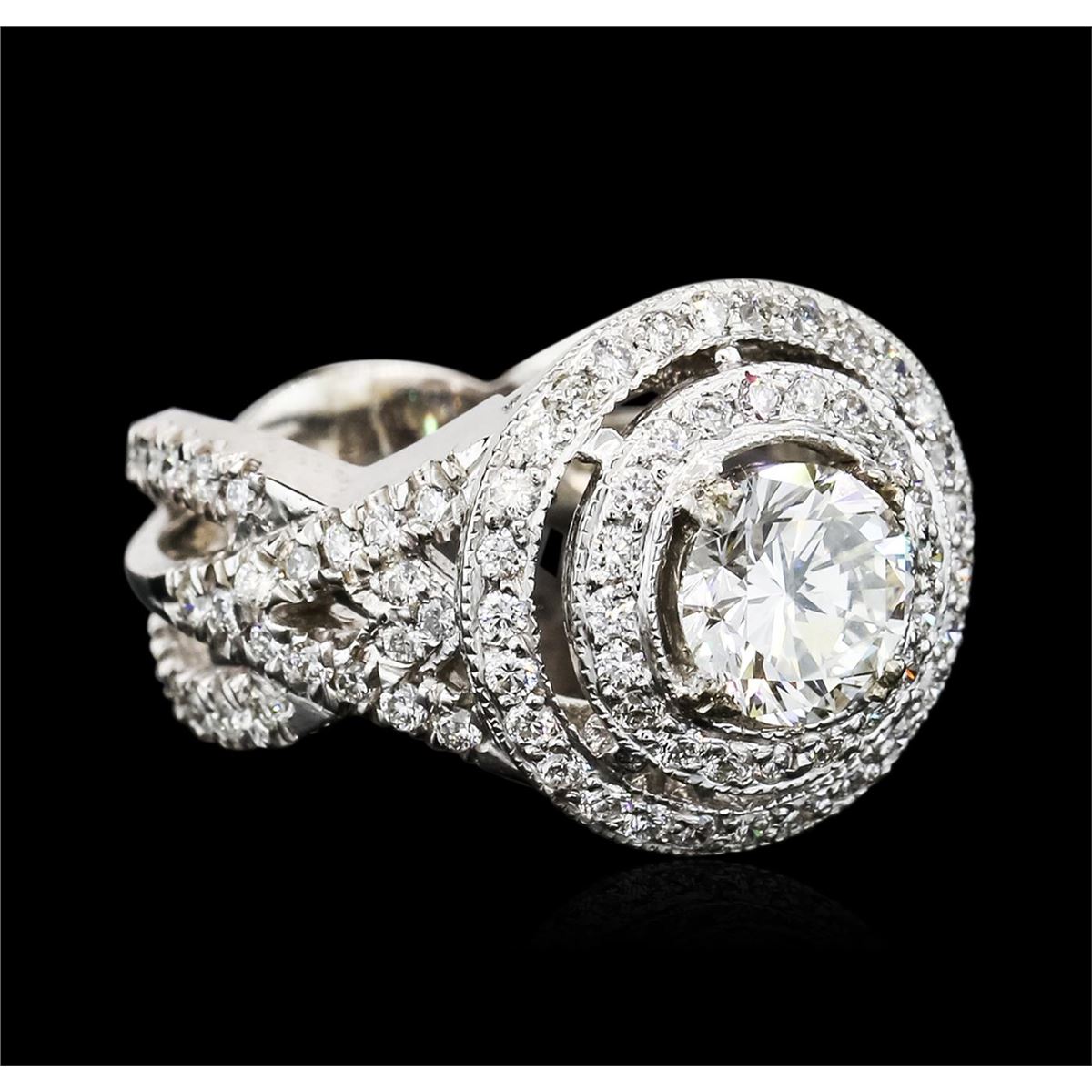 One electronically tested 14KT white gold ladies cast diamond unity ring. The featured diamond is set within two tiered diamond bezels supported by elaborate diamond set intertwining shoulders, completed by a five and one-half millimeter wide band. Bright polish finish with milgrain detailing. Identified with markings of "14K". Condition is new, good workmanship. Containing: One prong set round brilliant cut diamond, measuring 7.39 - 7.44 x 4.53mm exact weight 1.51ct. GIA Diamond Grading Report attached. Graded loose prior to setting in the GIA Laboratory, Report #13447777. Clarity: SI-1. Color: I. Depth 61.1%. Table 59.0%. One Hundred Eight prong set round brilliant cut diamonds, measuring 1.60 - 1.50 x 0.93mm (depth est.) approximate total weight of 108 Stones = 1.50ct. Graded in the setting. Clarity: SI-1 to I-1. Color: G - I. Total Weight of Diamonds 3.01ct. Total Weight of Ring 9.65 grams. AIG Appraised at $29,905.00.