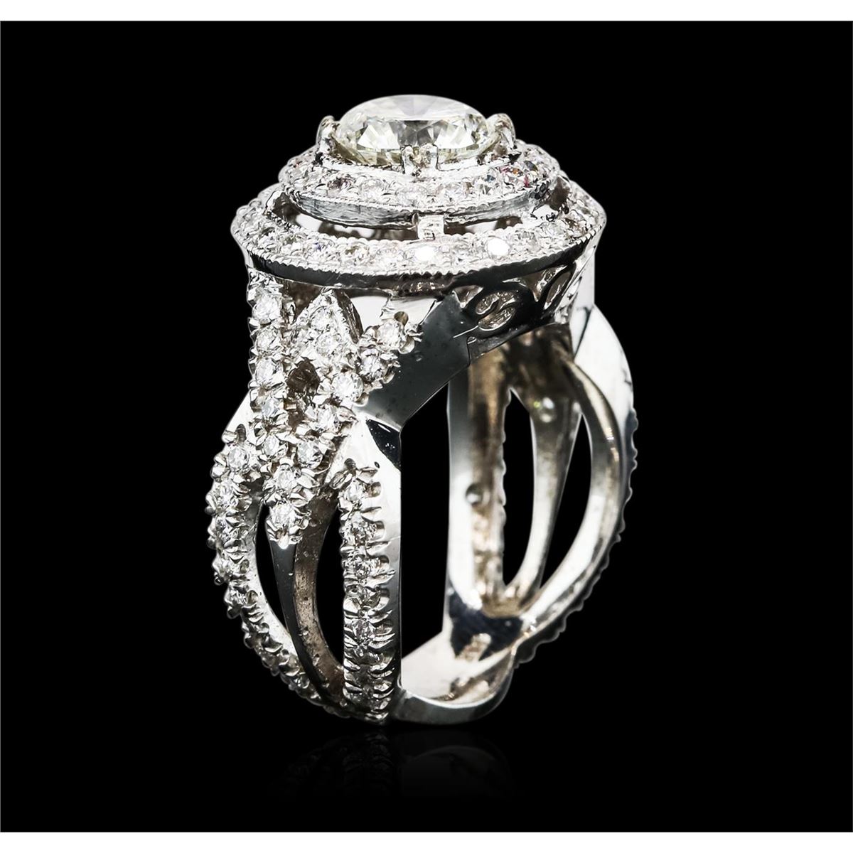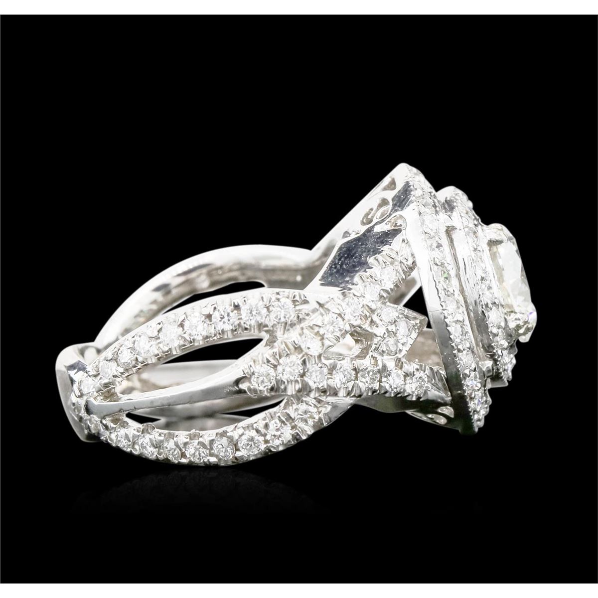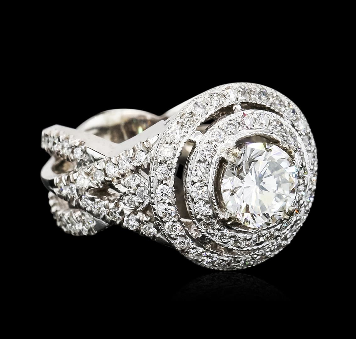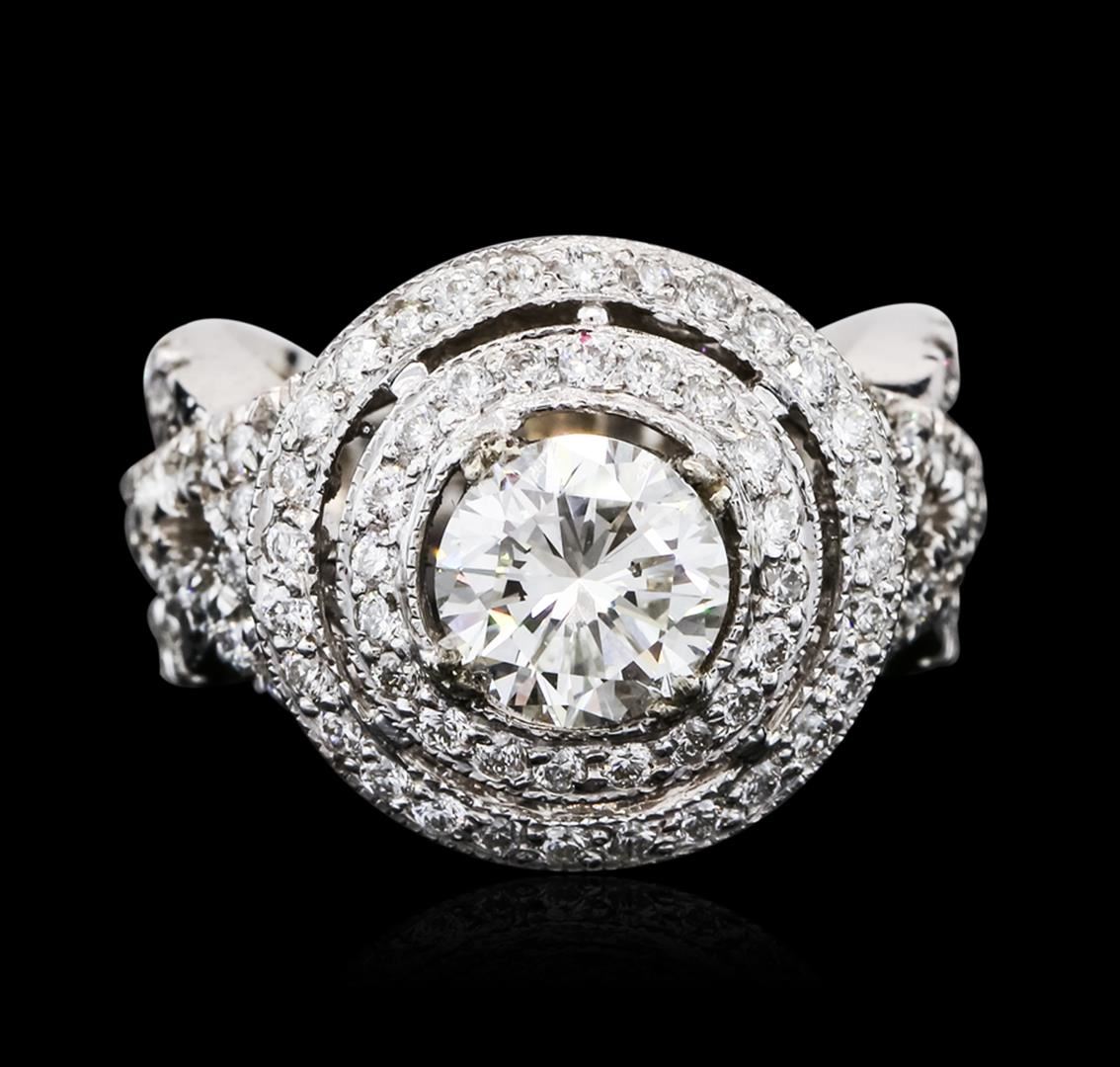 One electronically tested 14KT white gold ladies cast diamond unity ring. The featured diamond is set within two tiered diamond bezels supported by elaborate diamond set intertwining shoulders, completed by a five and one-half millimeter wide band. Bright polish finish with milgrain detailing. Identified with markings of "14K". Condition is new, good workmanship. Containing: One prong set round brilliant cut diamond, measuring 7.39 - 7.44 x 4.53mm exact weight 1.51ct. GIA Diamond Grading Report attached. Graded loose prior to setting in the GIA Laboratory, Report #13447777. Clarity: SI-1. Color: I. Depth 61.1%. Table 59.0%. One Hundred Eight prong set round brilliant cut diamonds, measuring 1.60 - 1.50 x 0.93mm (depth est.) approximate total weight of 108 Stones = 1.50ct. Graded in the setting. Clarity: SI-1 to I-1. Color: G - I. Total Weight of Diamonds 3.01ct. Total Weight of Ring 9.65 grams. AIG Appraised at $29,905.00.