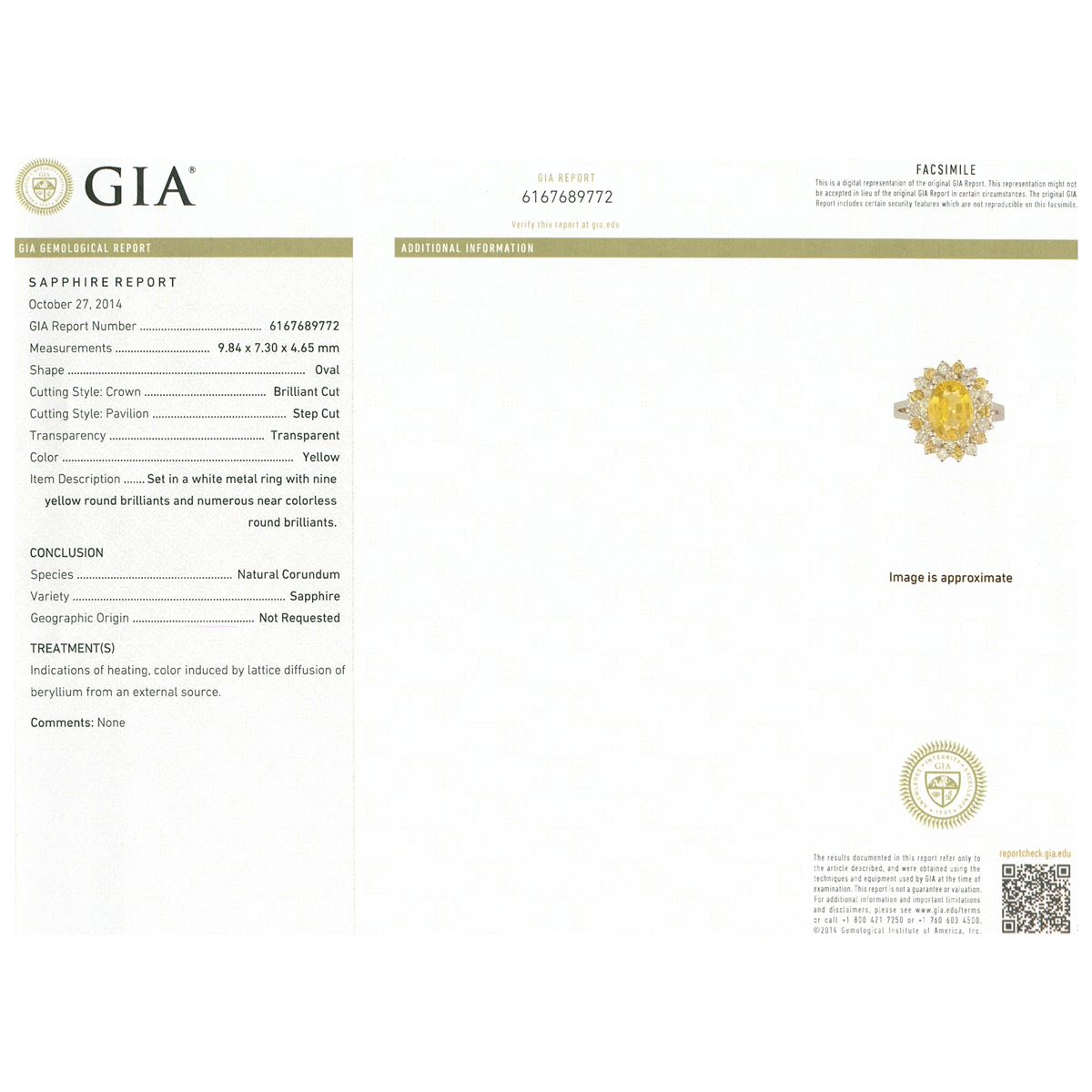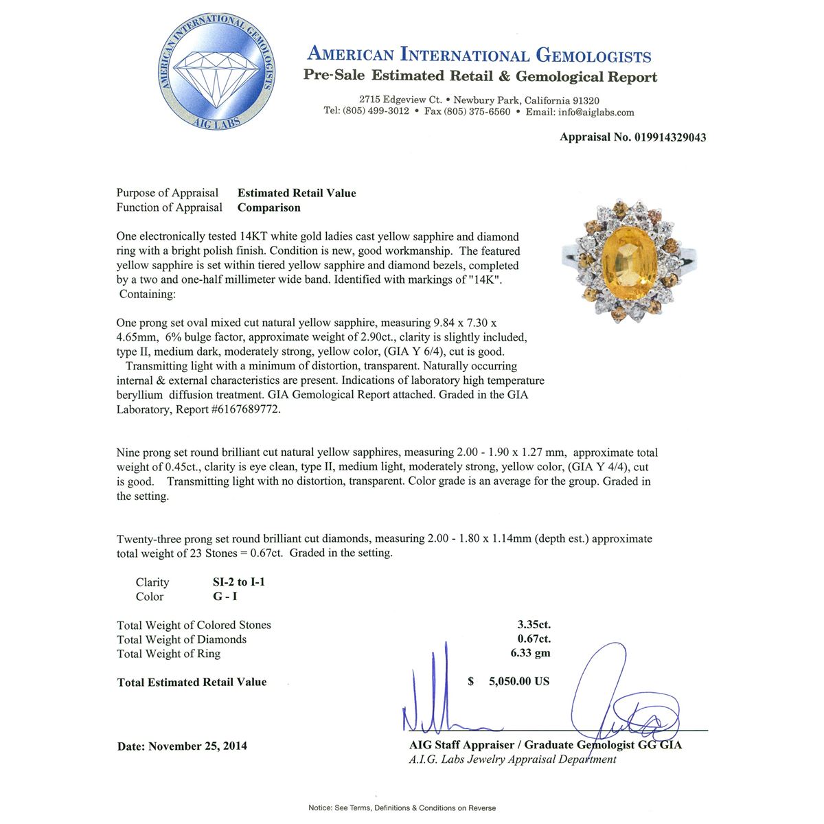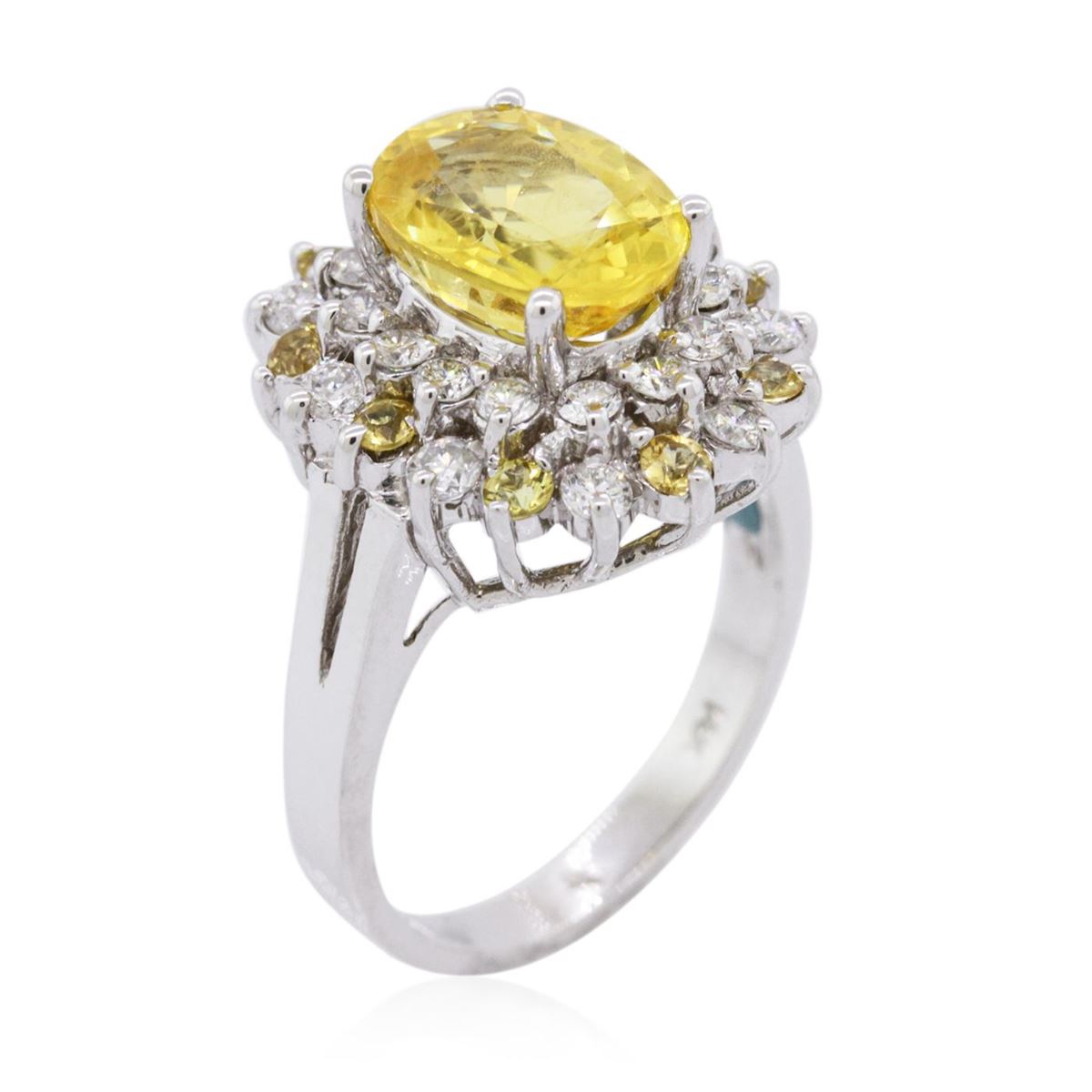 One electronically tested 14KT white gold ladies cast yellow sapphire and diamond ring with a bright polish finish. The featured yellow sapphire is set within tiered yellow sapphire and diamond bezels, completed by a two and one-half millimeter wide band. Identified with markings of "14K". Condition is new, good workmanship. Containing: One prong set oval mixed cut natural yellow sapphire, measuring 9.84 x 7.30 x 4.65mm, 6%. bulge factor, approximate weight of 2.90ct., clarity is slightly included, type II, medium dark, moderately strong, yellow color, (GIA Y 6/4), cut is good. Transmitting light with a minimum of distortion, transparent. Naturally occurring internal & external characteristics are present. Indications of laboratory high temperature beryllium diffusion treatment. GIA Gemological Report attached. Graded in the GIA Laboratory, Report #6167689772.Nine prong set round brilliant cut natural yellow sapphires, measuring 2.00 - 1.90 x 1.27 mm, approximate total weight of 0.45ct., clarity is eye clean, type II, medium light, moderately strong, yellow color, (GIA Y 4/4), cut is good. Transmitting light with no distortion, transparent. Color grade is an average for the group. Graded in the setting. Twenty-Three prong set round brilliant cut diamonds, measuring 2.00 - 1.80 x 1.14mm (depth est.) approximate total weight of 23 Stones = 0.67ct. Graded in the setting. Clarity: SI-2 to I-1. Color: G - I. Total Weight of Colored Stones 3.35ct. Total Weight of Diamonds 0.67ct. Total Weight of Ring 6.33 grams. AIG Appraised at $5,050.00.