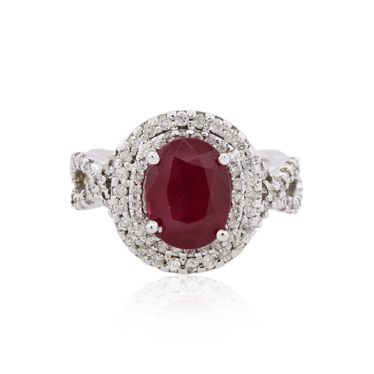 One electronically tested 14KT white gold ladies cast ruby and diamond ring with a bright polish finish. The featured ruby is set within two tiered diamond bezels supported by intertwining diamond set shoulders, completed by a four millimeter wide band. Identified with markings of "14K". Condition is new, good workmanship. Containing: One prong set oval mixed cut natural ruby, measuring 9.89 x 7.65 x 5.88mm, 6% bulge factor, approximate weight of 3.84ct., clarity is heavily included, type II, dark, very slightly brownish, slightly purplish red color, (GIA slpR 7/3), cut is good. Transmitting light somewhat diffusely, transparent to translucent. Naturally occurring internal & external characteristics are present. Indications of heating with moderate residues in fissures. GIA Ruby Report attached. Graded in the GIA Laboratory, Report #6167650560.Ninety-Two prong set round brilliant cut diamonds, measuring 1.30 - 1.10 x 0.72mm (depth est.) approximate total weight of 92 Stones = 0.68ct. Graded in the setting. Clarity: I-1 to I-2. Color: G - I. Total Weight of Colored Stones 3.84ct. Total Weight of Diamonds 0.68ct. Total Weight of Ring 7.47 grams. AIG Appraised at $4,350.00.