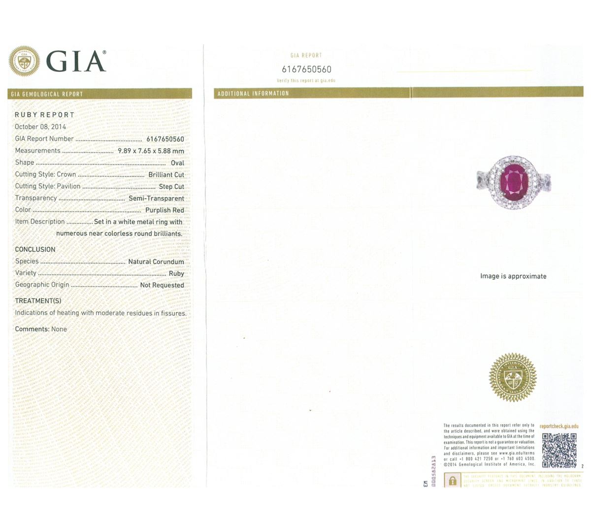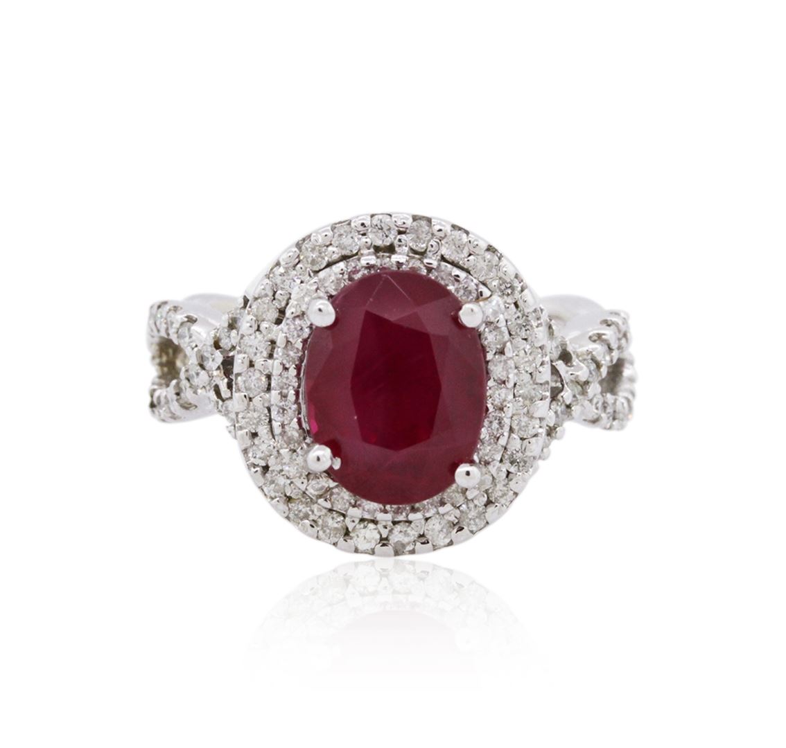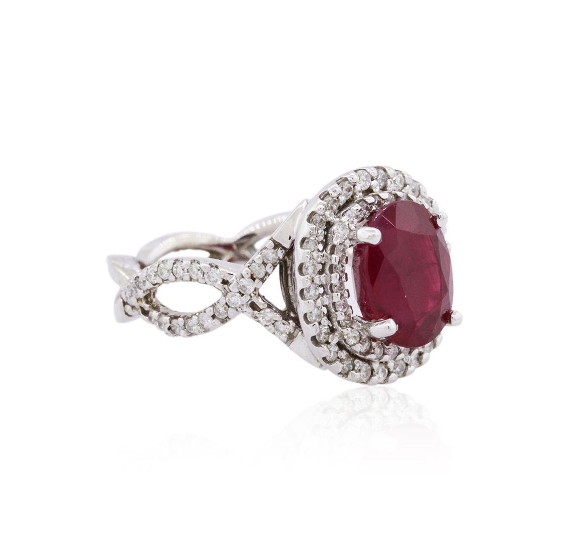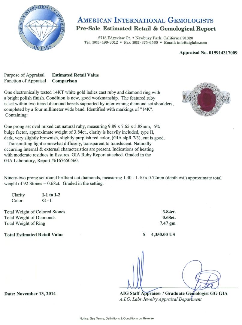 One electronically tested 14KT white gold ladies cast ruby and diamond ring with a bright polish finish. The featured ruby is set within two tiered diamond bezels supported by intertwining diamond set shoulders, completed by a four millimeter wide band. Identified with markings of "14K". Condition is new, good workmanship. Containing: One prong set oval mixed cut natural ruby, measuring 9.89 x 7.65 x 5.88mm, 6% bulge factor, approximate weight of 3.84ct., clarity is heavily included, type II, dark, very slightly brownish, slightly purplish red color, (GIA slpR 7/3), cut is good. Transmitting light somewhat diffusely, transparent to translucent. Naturally occurring internal & external characteristics are present. Indications of heating with moderate residues in fissures. GIA Ruby Report attached. Graded in the GIA Laboratory, Report #6167650560.Ninety-Two prong set round brilliant cut diamonds, measuring 1.30 - 1.10 x 0.72mm (depth est.) approximate total weight of 92 Stones = 0.68ct. Graded in the setting. Clarity: I-1 to I-2. Color: G - I. Total Weight of Colored Stones 3.84ct. Total Weight of Diamonds 0.68ct. Total Weight of Ring 7.47 grams. AIG Appraised at $4,350.00.