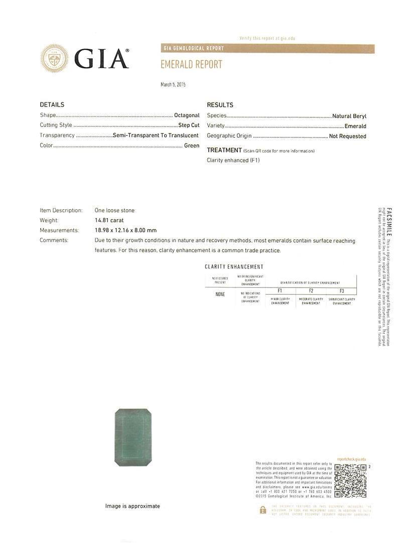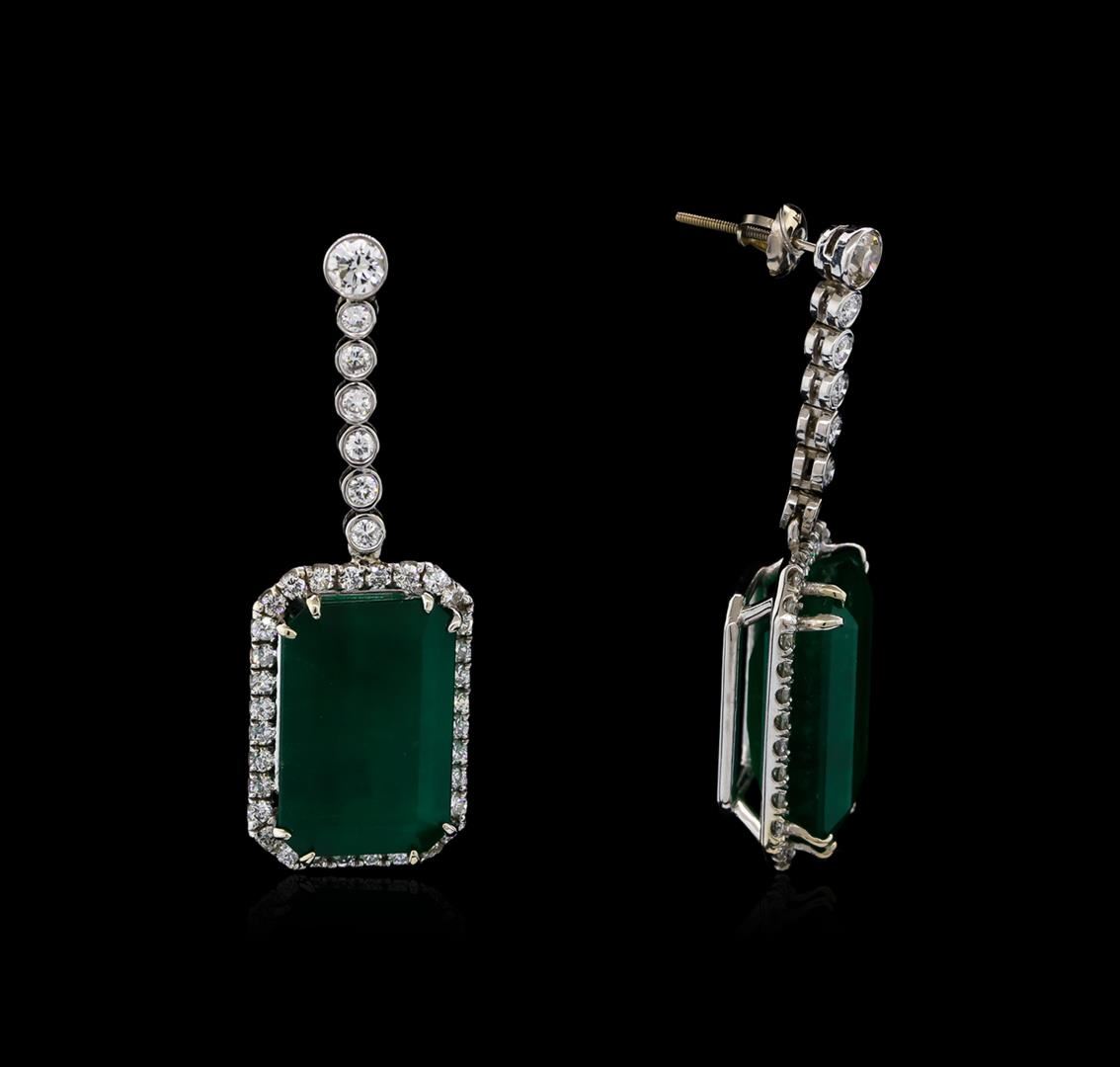 One pair electronically tested 14KT white gold ladies cast & assembled emerald and diamond dangle earrings. Bright polish finish. Condition is new, good workmanship. Containing: One prong set octagonal step cut natural emerald, measuring 18.86 x 12.30 x 8.31mm, exact weight 15.65ct., clarity is heavily included, type III, dark, very slightly grayish, green color, (GIA G 7/3), cut is good. Transmitting light somewhat diffusely, semi-transparent to translucent. Naturally occurring internal & external characteristics are present. No indications of clarity enhancement. GIA Gemological Report attached. Graded loose prior to setting in the GIA Laboratory, Report #1176049233.One prong set octagonal step cut natural emerald, measuring 18.98 x 12.16 x 8.00mm, exact weight 14.81ct., clarity is heavily included, type III, dark, very slightly grayish, green color, (GIA G 7/3), cut is good. Transmitting light somewhat diffusely, semi-transparent to translucent. Naturally occurring internal & external characteristics are present. Clarity enhancement. GIA Gemological Report attached. Graded loose prior to setting in the GIA Laboratory, Report #2175051780.Two bezel set round brilliant cut diamonds, measuring 4.00 - 4.00 x 2.40mm (depth est.) approximate total weight of 2 Stones = 0.48ct. Graded in the setting. Clarity: SI-1 to SI-2. Color: G - H Twelve bezel set round brilliant cut diamonds, measuring 2.20 - 2.10 x 1.29mm (depth est.) approximate total weight of 12 Stones = 0.53ct. Graded in the setting. Clarity: SI-2 to I-1. Color: G - I Sixty-Four prong set round brilliant cut diamonds, measuring 1.80 - 1.70 x 1.05mm (depth est.) approximate total weight of 64 Stones = 1.35ct. Graded in the setting. Clarity: SI-1 to SI-2. Color: G - I. Total Weight of Colored Stones 30.46ct. Total Weight of Diamonds 2.36ct. AIG Appraised at $43,855.00.