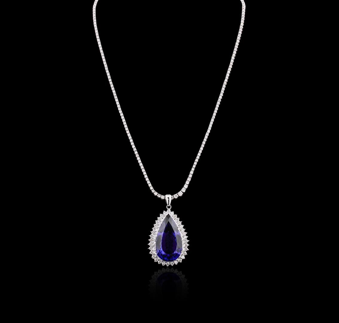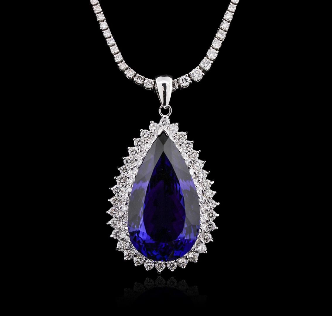 One electronically tested 14KT white gold ladies cast & assembled tanzanite and diamond pendant with chain. Condition is new, good workmanship. The pendant features a tanzanite set within two tiered diamond bezels, completed by a white gold bail. The pendant is supported by a flexible sixteen and three-quarter inch length 18KT white gold diamond ribbon, terminating in a concealed clasp with safety. Bright polish finish. Condition is new, good workmanship. Identified with markings of "K14". Containing: One prong set pear modified brilliant cut natural tanzanite, measuring 29.79 x 16.65 x 9.06mm, exact weight 31.37ct., type I Clarity is eye clean, dark, moderately strong, violet-blue color, (GIA VB), cut is good. Transmitting light with no distortion, transparent. GIA Gemological Report attached. Graded loose prior to setting in the GIA Laboratory, Report #2161077538.Tanzanite is a very rare gemstone that is only found in the country of Tanzania. Originally discovered in 1967. Tiffany & Company, named the stone Tanzanite. It is found in the Usumburu Mountains that border the Umba Valley of northern Tanzania. Tanzanite occurs in gray, brown, violet, blue, reddish-purple, & green. The gem is interesting because of its exceptional pleochroism. Rotated in different directions a tanzanite will exhibit multiple changes of color. Tanzanite has a low tolerance to ultrasonic cleaning, and should not be cleaned using this method. Sixty-Seven prong set round brilliant cut diamonds, measuring 2.40 - 2.00 x 1.32mm (depth est.) approximate total weight of 67 Stones = 2.70ct. Graded in the setting. Clarity: SI-1 to I-1 . Color: G - I One Hundred Eighty-Nine prong set round brilliant cut diamonds, measuring 2.70 - 1.70 x 1.32mm (depth est.) approximate total weight of 189 Stones = 4.17ct. Graded in the setting. Clarity: SI-1 to I-1 . Color: G - I. Total Weight of Colored Stones 31.37ct. Total Weight of Diamonds 6.87ct. Total Weight of Pendant With Chain 30.54 grams. AIG Appraised at $103,245.00.