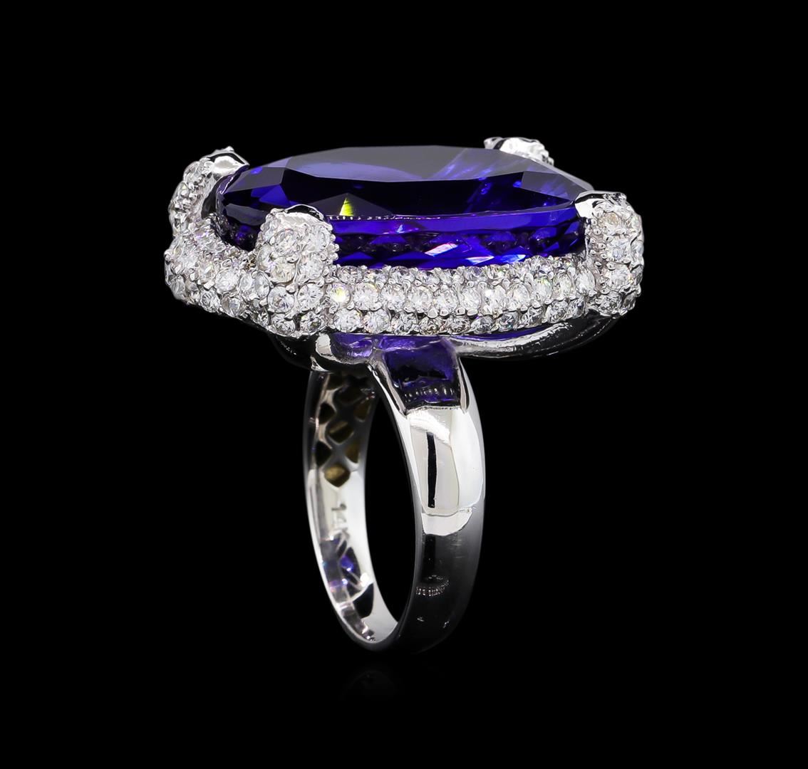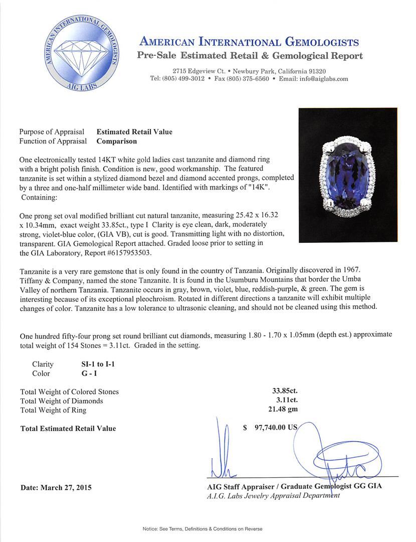 One electronically tested 14KT white gold ladies cast tanzanite and diamond ring with a bright polish finish. The featured tanzanite is set within a stylized diamond bezel and diamond accented prongs, completed by a three and one-half millimeter wide band. Identified with markings of "14K". Condition is new, good workmanship. Containing: One prong set oval modified brilliant cut natural tanzanite, measuring 25.42 x 16.32 x 10.34mm, exact weight 33.85ct., type I Clarity is eye clean, dark, moderately strong, violet-blue color, (GIA VB), cut is good. Transmitting light with no distortion, transparent. GIA Gemological Report attached. Graded loose prior to setting in the GIA Laboratory, Report #6157953503.Tanzanite is a very rare gemstone that is only found in the country of Tanzania. Originally discovered in 1967. Tiffany & Company, named the stone Tanzanite. It is found in the Usumburu Mountains that border the Umba Valley of northern Tanzania. Tanzanite occurs in gray, brown, violet, blue, reddish-purple, & green. The gem is interesting because of its exceptional pleochroism. Rotated in different directions a tanzanite will exhibit multiple changes of color. Tanzanite has a low tolerance to ultrasonic cleaning, and should not be cleaned using this method. One Hundred Fifty-Four prong set round brilliant cut diamonds, measuring 1.80 - 1.70 x 1.05mm (depth est.) approximate total weight of 154 Stones = 3.11ct. Graded in the setting. Clarity: SI-1 to I-1. Color: G - I. Total Weight of Colored Stones 33.85ct. Total Weight of Diamonds 3.11ct. Total Weight of Ring 21.48 grams. AIG Appraised at $97,740.00.