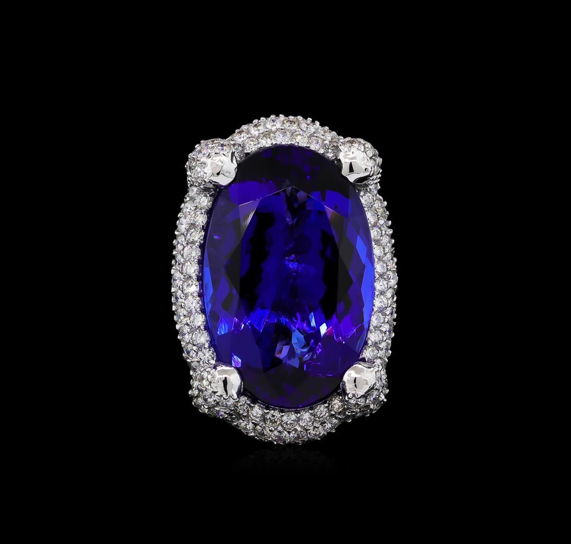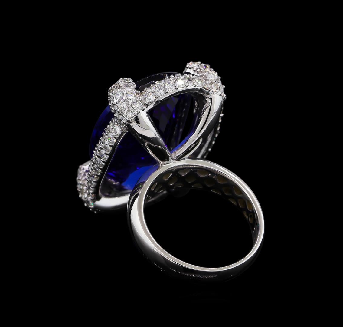 One electronically tested 14KT white gold ladies cast tanzanite and diamond ring with a bright polish finish. The featured tanzanite is set within a stylized diamond bezel and diamond accented prongs, completed by a three and one-half millimeter wide band. Identified with markings of "14K". Condition is new, good workmanship. Containing: One prong set oval modified brilliant cut natural tanzanite, measuring 25.42 x 16.32 x 10.34mm, exact weight 33.85ct., type I Clarity is eye clean, dark, moderately strong, violet-blue color, (GIA VB), cut is good. Transmitting light with no distortion, transparent. GIA Gemological Report attached. Graded loose prior to setting in the GIA Laboratory, Report #6157953503.Tanzanite is a very rare gemstone that is only found in the country of Tanzania. Originally discovered in 1967. Tiffany & Company, named the stone Tanzanite. It is found in the Usumburu Mountains that border the Umba Valley of northern Tanzania. Tanzanite occurs in gray, brown, violet, blue, reddish-purple, & green. The gem is interesting because of its exceptional pleochroism. Rotated in different directions a tanzanite will exhibit multiple changes of color. Tanzanite has a low tolerance to ultrasonic cleaning, and should not be cleaned using this method. One Hundred Fifty-Four prong set round brilliant cut diamonds, measuring 1.80 - 1.70 x 1.05mm (depth est.) approximate total weight of 154 Stones = 3.11ct. Graded in the setting. Clarity: SI-1 to I-1. Color: G - I. Total Weight of Colored Stones 33.85ct. Total Weight of Diamonds 3.11ct. Total Weight of Ring 21.48 grams. AIG Appraised at $97,740.00.