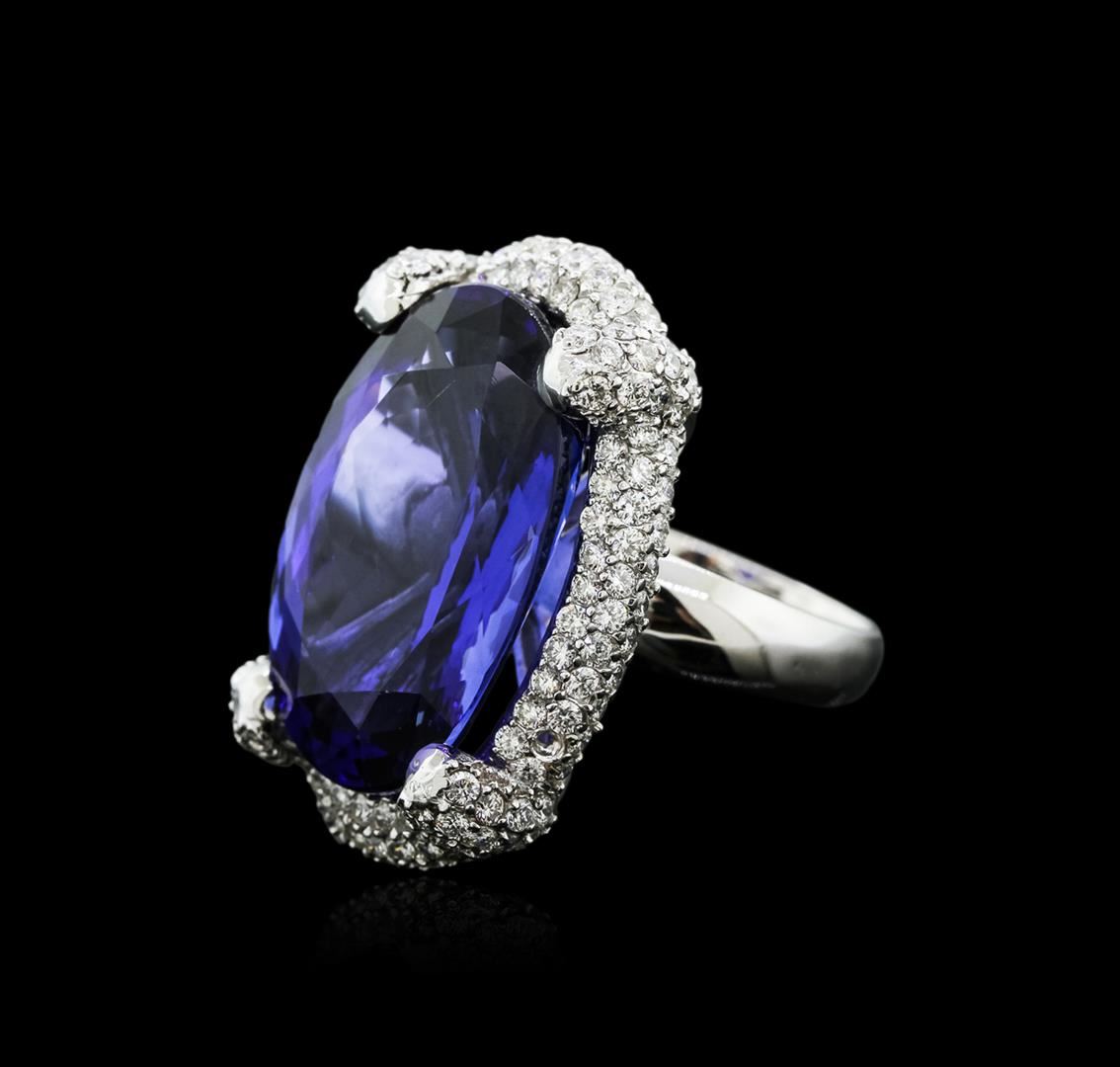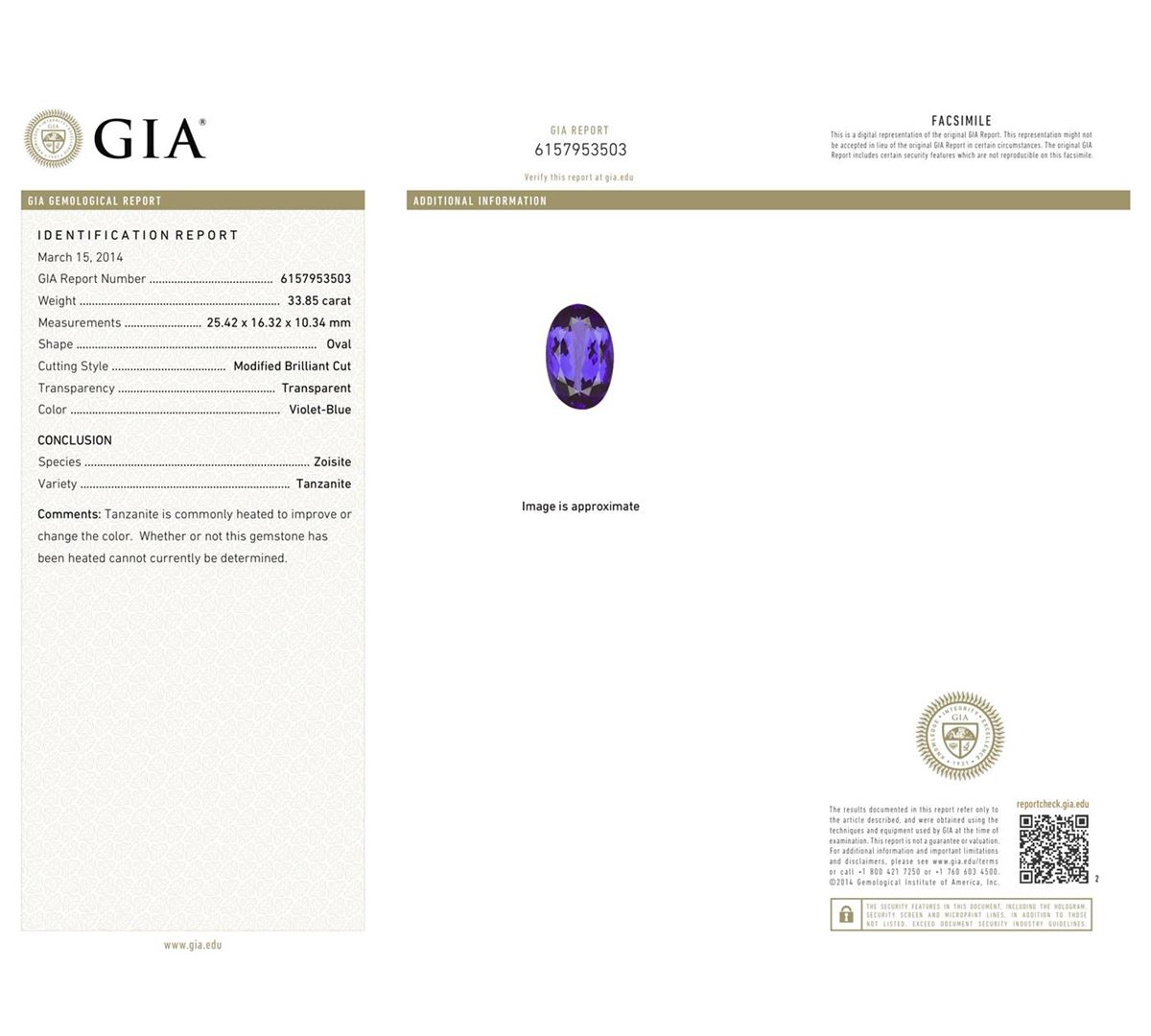 One electronically tested 14KT white gold ladies cast tanzanite and diamond ring with a bright polish finish. The featured tanzanite is set within a stylized diamond bezel and diamond accented prongs, completed by a three and one-half millimeter wide band. Identified with markings of "14K". Condition is new, good workmanship. Containing: One prong set oval modified brilliant cut natural tanzanite, measuring 25.42 x 16.32 x 10.34mm, exact weight 33.85ct., type I Clarity is eye clean, dark, moderately strong, violet-blue color, (GIA VB), cut is good. Transmitting light with no distortion, transparent. GIA Gemological Report attached. Graded loose prior to setting in the GIA Laboratory, Report #6157953503.Tanzanite is a very rare gemstone that is only found in the country of Tanzania. Originally discovered in 1967. Tiffany & Company, named the stone Tanzanite. It is found in the Usumburu Mountains that border the Umba Valley of northern Tanzania. Tanzanite occurs in gray, brown, violet, blue, reddish-purple, & green. The gem is interesting because of its exceptional pleochroism. Rotated in different directions a tanzanite will exhibit multiple changes of color. Tanzanite has a low tolerance to ultrasonic cleaning, and should not be cleaned using this method. One Hundred Fifty-Four prong set round brilliant cut diamonds, measuring 1.80 - 1.70 x 1.05mm (depth est.) approximate total weight of 154 Stones = 3.11ct. Graded in the setting. Clarity: SI-1 to I-1. Color: G - I. Total Weight of Colored Stones 33.85ct. Total Weight of Diamonds 3.11ct. Total Weight of Ring 21.48 grams. AIG Appraised at $97,740.00.