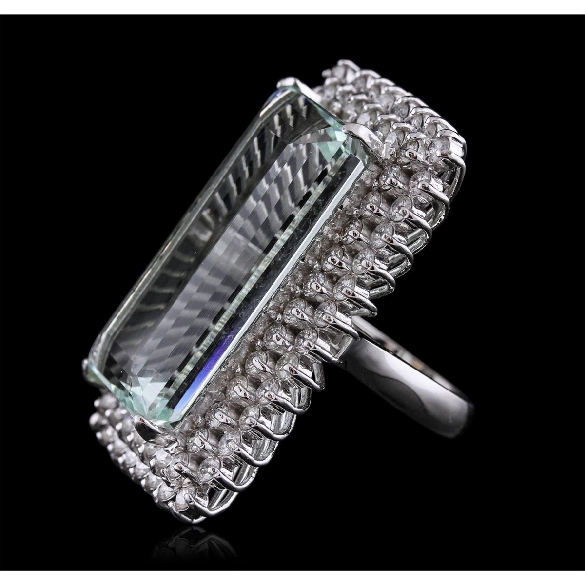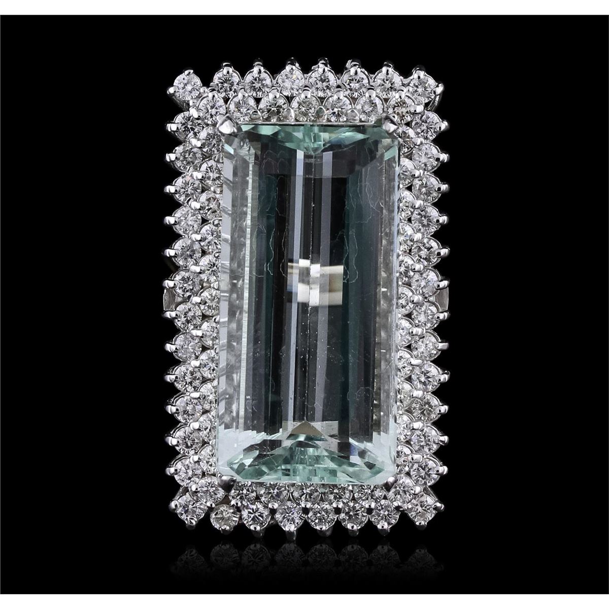 One electronically tested 14KT white gold ladies cast aquamarine and diamond ring with a bright polish finish. Condition is new, good workmanship. The featured aquamarine is set within two tiered diamond bezels, completed by a four millimeter wide band. Identified with markings of "K14". Containing: One prong set octagonal step cut natural aquamarine, measuring 30.20 x 15.12 x 10.46mm, exact weight 37.30ct., type I Clarity is slightly included, light, very slightly grayish, blue-green color, (GIA GB 3/3), cut is good. Transmitting light with a minimum of distortion, transparent. Naturally occurring internal & external characteristics are present. GIA Gemological Report attached. Graded loose prior to setting in the GIA Laboratory, Report #2161001546.Seventy-Six prong set round brilliant cut diamonds, measuring 2.60 - 2.50 x 1.53mm (depth est.) approximate total weight of 76 Stones = 4.70ct. Graded in the setting. Clarity: SI-1 to I-1. Color: G - I. Total Weight of Colored Stones 37.30ct. Total Weight of Diamonds 4.70ct. Total Weight of Ring 25.14 grams. AIG Appraised at $35,400.00.