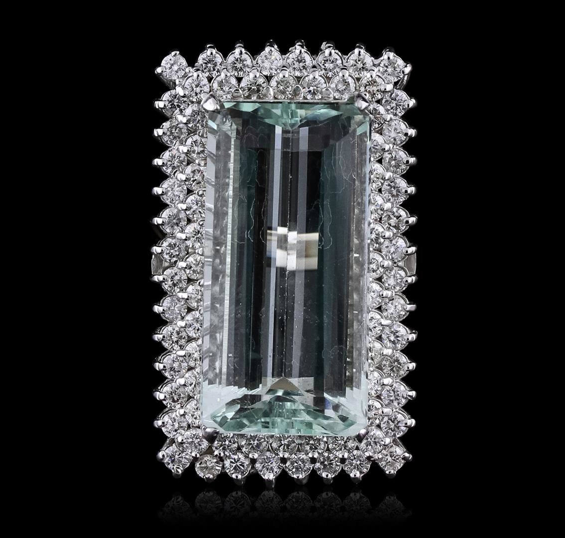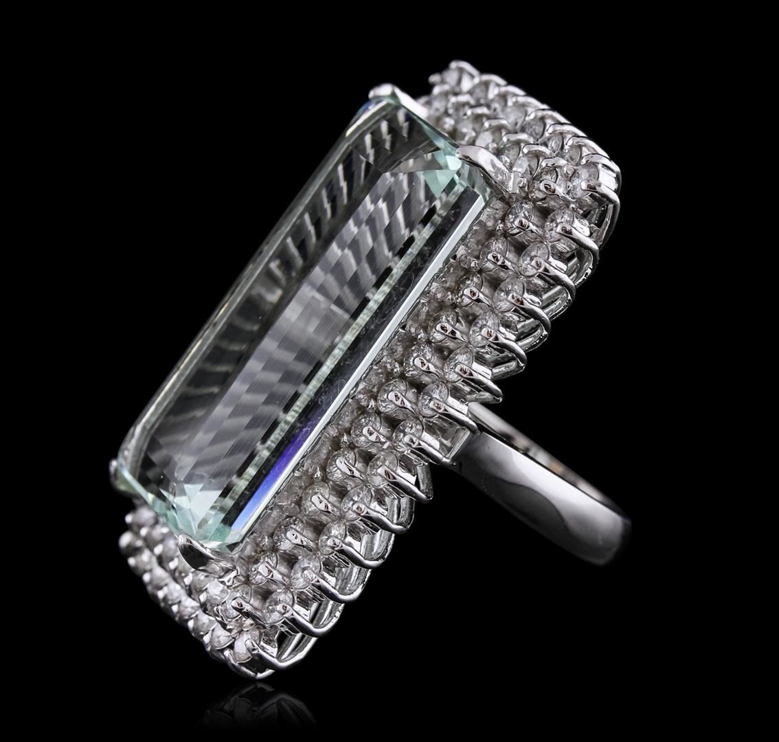 One electronically tested 14KT white gold ladies cast aquamarine and diamond ring with a bright polish finish. Condition is new, good workmanship. The featured aquamarine is set within two tiered diamond bezels, completed by a four millimeter wide band. Identified with markings of "K14". Containing: One prong set octagonal step cut natural aquamarine, measuring 30.20 x 15.12 x 10.46mm, exact weight 37.30ct., type I Clarity is slightly included, light, very slightly grayish, blue-green color, (GIA GB 3/3), cut is good. Transmitting light with a minimum of distortion, transparent. Naturally occurring internal & external characteristics are present. GIA Gemological Report attached. Graded loose prior to setting in the GIA Laboratory, Report #2161001546.Seventy-Six prong set round brilliant cut diamonds, measuring 2.60 - 2.50 x 1.53mm (depth est.) approximate total weight of 76 Stones = 4.70ct. Graded in the setting. Clarity: SI-1 to I-1. Color: G - I. Total Weight of Colored Stones 37.30ct. Total Weight of Diamonds 4.70ct. Total Weight of Ring 25.14 grams. AIG Appraised at $35,400.00.
