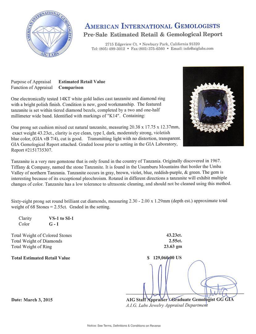 One electronically tested 14KT white gold ladies cast tanzanite and diamond ring with a bright polish finish. The featured tanzanite is set within tiered diamond bezels, completed by a two and one-half millimeter wide band. Identified with markings of "K14". Condition is new, good workmanship. Containing: One prong set cushion mixed cut natural tanzanite, measuring 20.38 x 17.75 x 12.37mm, exact weight 43.23ct., clarity is eye clean, type I, dark, moderately strong, violetish blue color, (GIA vB 7/4), cut is good. Transmitting light with no distortion, transparent. GIA Gemological Report attached. Graded loose prior to setting in the GIA Laboratory, Report #2151735307.Tanzanite is a very rare gemstone that is only found in the country of Tanzania. Originally discovered in 1967. Tiffany & Company, named the stone Tanzanite. It is found in the Usumburu Mountains that border the Umba Valley of northern Tanzania. Tanzanite occurs in gray, brown, violet, blue, reddish-purple, & green. The gem is interesting because of its exceptional pleochroism. Rotated in different directions a tanzanite will exhibit multiple changes of color. Tanzanite has a low tolerance to ultrasonic cleaning, and should not be cleaned using this method. Sixty-Eight prong set round brilliant cut diamonds, measuring 2.30 - 2.00 x 1.29mm (depth est.) approximate total weight of 68 Stones = 2.55ct. Graded in the setting. Clarity: VS-1 to SI-1. Color: G - I. Total Weight of Colored Stones 43.23ct. Total Weight of Diamonds 2.55ct. Total Weight of Ring 23.63 grams. AIG Appraised at $129,060.00.
