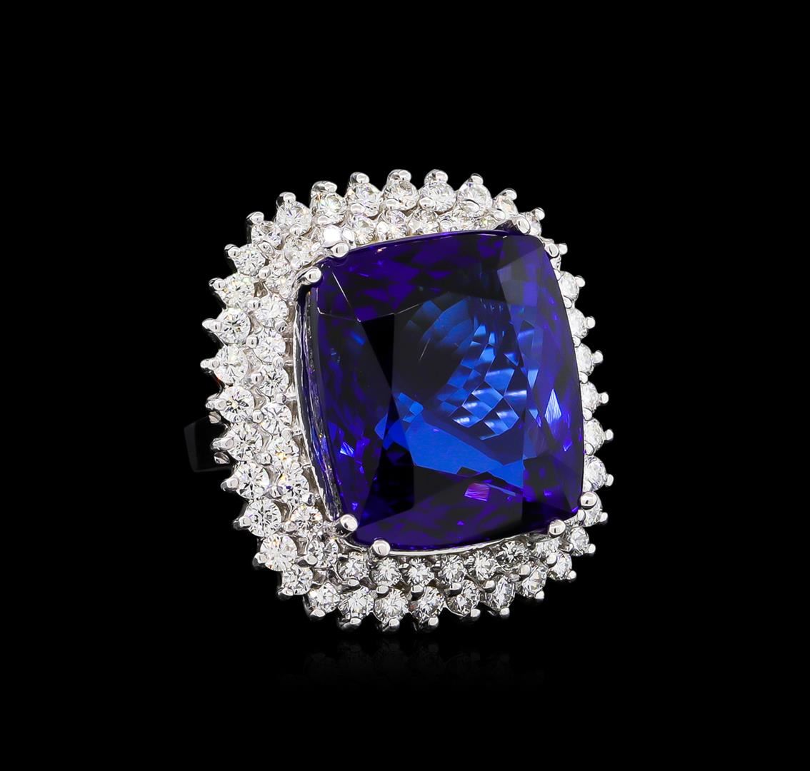 One electronically tested 14KT white gold ladies cast tanzanite and diamond ring with a bright polish finish. The featured tanzanite is set within tiered diamond bezels, completed by a two and one-half millimeter wide band. Identified with markings of "K14". Condition is new, good workmanship. Containing: One prong set cushion mixed cut natural tanzanite, measuring 20.38 x 17.75 x 12.37mm, exact weight 43.23ct., clarity is eye clean, type I, dark, moderately strong, violetish blue color, (GIA vB 7/4), cut is good. Transmitting light with no distortion, transparent. GIA Gemological Report attached. Graded loose prior to setting in the GIA Laboratory, Report #2151735307.Tanzanite is a very rare gemstone that is only found in the country of Tanzania. Originally discovered in 1967. Tiffany & Company, named the stone Tanzanite. It is found in the Usumburu Mountains that border the Umba Valley of northern Tanzania. Tanzanite occurs in gray, brown, violet, blue, reddish-purple, & green. The gem is interesting because of its exceptional pleochroism. Rotated in different directions a tanzanite will exhibit multiple changes of color. Tanzanite has a low tolerance to ultrasonic cleaning, and should not be cleaned using this method. Sixty-Eight prong set round brilliant cut diamonds, measuring 2.30 - 2.00 x 1.29mm (depth est.) approximate total weight of 68 Stones = 2.55ct. Graded in the setting. Clarity: VS-1 to SI-1. Color: G - I. Total Weight of Colored Stones 43.23ct. Total Weight of Diamonds 2.55ct. Total Weight of Ring 23.63 grams. AIG Appraised at $129,060.00.