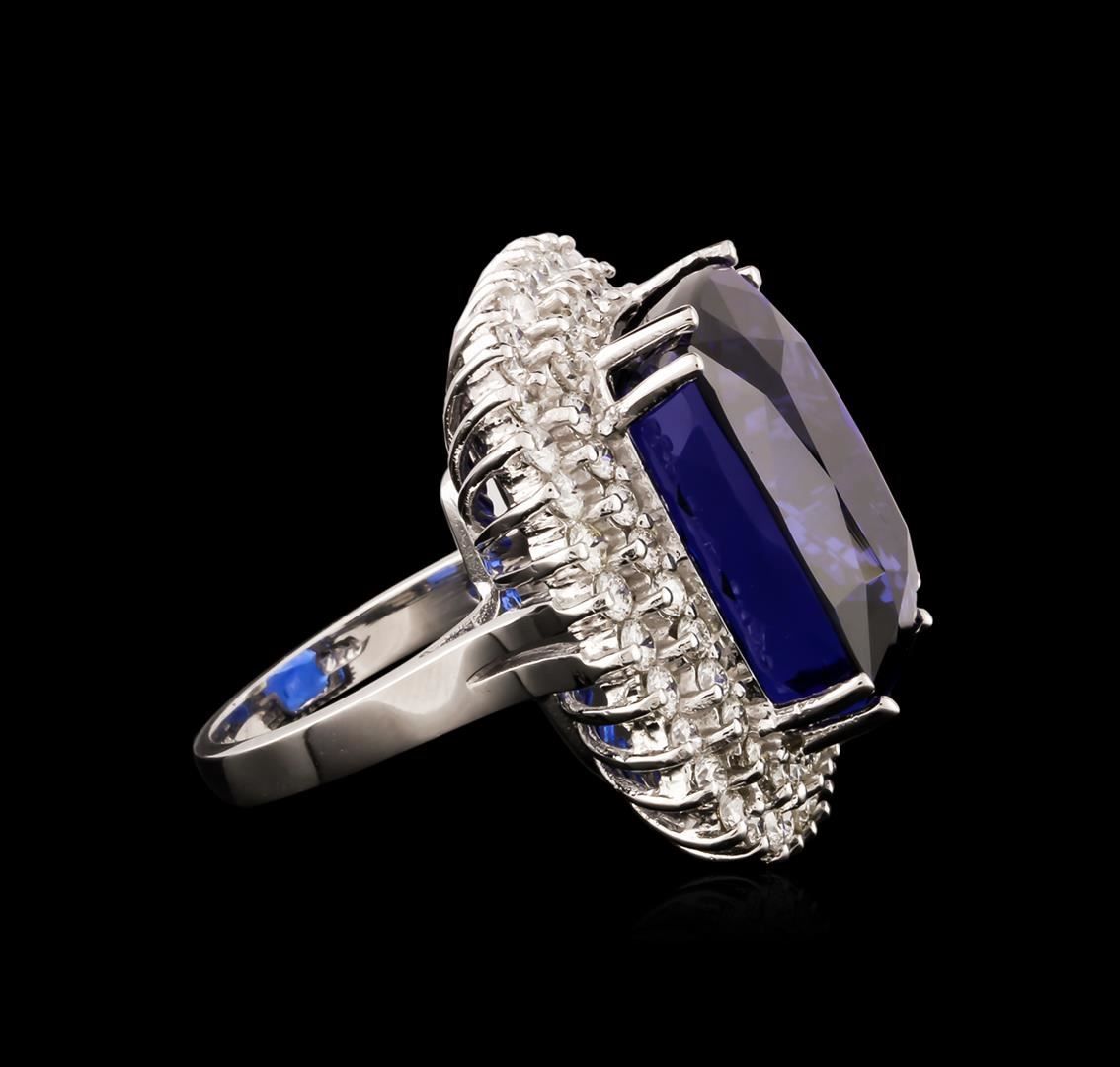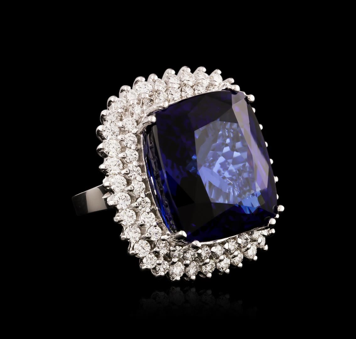 One electronically tested 14KT white gold ladies cast tanzanite and diamond ring with a bright polish finish. The featured tanzanite is set within tiered diamond bezels, completed by a two and one-half millimeter wide band. Identified with markings of "K14". Condition is new, good workmanship. Containing: One prong set cushion mixed cut natural tanzanite, measuring 20.38 x 17.75 x 12.37mm, exact weight 43.23ct., clarity is eye clean, type I, dark, moderately strong, violetish blue color, (GIA vB 7/4), cut is good. Transmitting light with no distortion, transparent. GIA Gemological Report attached. Graded loose prior to setting in the GIA Laboratory, Report #2151735307.Tanzanite is a very rare gemstone that is only found in the country of Tanzania. Originally discovered in 1967. Tiffany & Company, named the stone Tanzanite. It is found in the Usumburu Mountains that border the Umba Valley of northern Tanzania. Tanzanite occurs in gray, brown, violet, blue, reddish-purple, & green. The gem is interesting because of its exceptional pleochroism. Rotated in different directions a tanzanite will exhibit multiple changes of color. Tanzanite has a low tolerance to ultrasonic cleaning, and should not be cleaned using this method. Sixty-Eight prong set round brilliant cut diamonds, measuring 2.30 - 2.00 x 1.29mm (depth est.) approximate total weight of 68 Stones = 2.55ct. Graded in the setting. Clarity: VS-1 to SI-1. Color: G - I. Total Weight of Colored Stones 43.23ct. Total Weight of Diamonds 2.55ct. Total Weight of Ring 23.63 grams. AIG Appraised at $129,060.00.