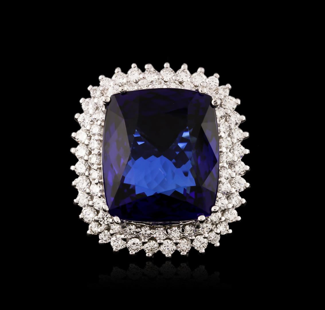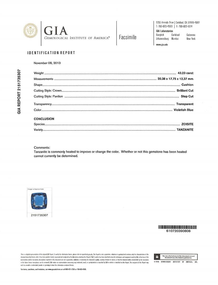 One electronically tested 14KT white gold ladies cast tanzanite and diamond ring with a bright polish finish. The featured tanzanite is set within tiered diamond bezels, completed by a two and one-half millimeter wide band. Identified with markings of "K14". Condition is new, good workmanship. Containing: One prong set cushion mixed cut natural tanzanite, measuring 20.38 x 17.75 x 12.37mm, exact weight 43.23ct., clarity is eye clean, type I, dark, moderately strong, violetish blue color, (GIA vB 7/4), cut is good. Transmitting light with no distortion, transparent. GIA Gemological Report attached. Graded loose prior to setting in the GIA Laboratory, Report #2151735307.Tanzanite is a very rare gemstone that is only found in the country of Tanzania. Originally discovered in 1967. Tiffany & Company, named the stone Tanzanite. It is found in the Usumburu Mountains that border the Umba Valley of northern Tanzania. Tanzanite occurs in gray, brown, violet, blue, reddish-purple, & green. The gem is interesting because of its exceptional pleochroism. Rotated in different directions a tanzanite will exhibit multiple changes of color. Tanzanite has a low tolerance to ultrasonic cleaning, and should not be cleaned using this method. Sixty-Eight prong set round brilliant cut diamonds, measuring 2.30 - 2.00 x 1.29mm (depth est.) approximate total weight of 68 Stones = 2.55ct. Graded in the setting. Clarity: VS-1 to SI-1. Color: G - I. Total Weight of Colored Stones 43.23ct. Total Weight of Diamonds 2.55ct. Total Weight of Ring 23.63 grams. AIG Appraised at $129,060.00.