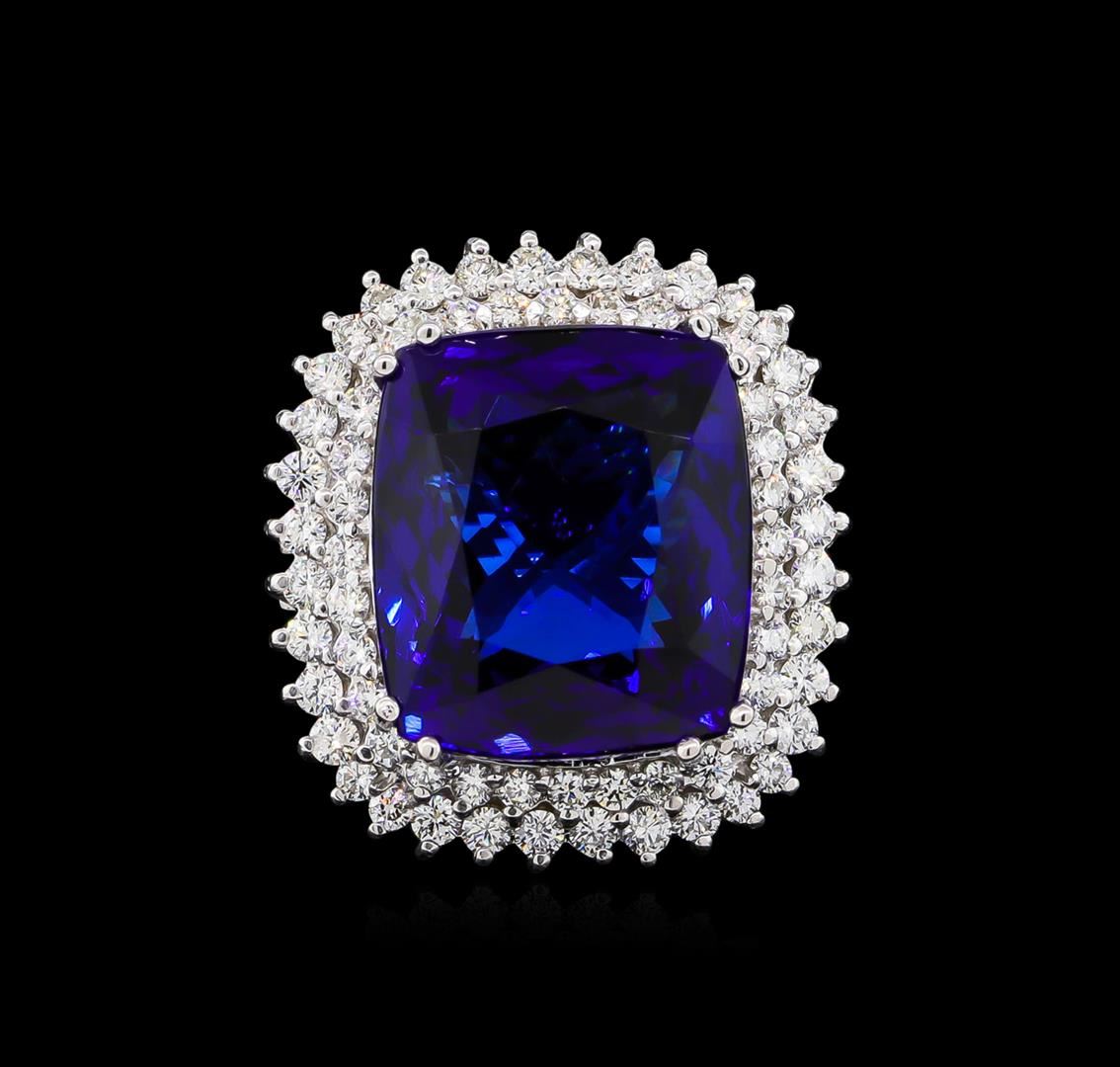 One electronically tested 14KT white gold ladies cast tanzanite and diamond ring with a bright polish finish. The featured tanzanite is set within tiered diamond bezels, completed by a two and one-half millimeter wide band. Identified with markings of "K14". Condition is new, good workmanship. Containing: One prong set cushion mixed cut natural tanzanite, measuring 20.38 x 17.75 x 12.37mm, exact weight 43.23ct., clarity is eye clean, type I, dark, moderately strong, violetish blue color, (GIA vB 7/4), cut is good. Transmitting light with no distortion, transparent. GIA Gemological Report attached. Graded loose prior to setting in the GIA Laboratory, Report #2151735307.Tanzanite is a very rare gemstone that is only found in the country of Tanzania. Originally discovered in 1967. Tiffany & Company, named the stone Tanzanite. It is found in the Usumburu Mountains that border the Umba Valley of northern Tanzania. Tanzanite occurs in gray, brown, violet, blue, reddish-purple, & green. The gem is interesting because of its exceptional pleochroism. Rotated in different directions a tanzanite will exhibit multiple changes of color. Tanzanite has a low tolerance to ultrasonic cleaning, and should not be cleaned using this method. Sixty-Eight prong set round brilliant cut diamonds, measuring 2.30 - 2.00 x 1.29mm (depth est.) approximate total weight of 68 Stones = 2.55ct. Graded in the setting. Clarity: VS-1 to SI-1. Color: G - I. Total Weight of Colored Stones 43.23ct. Total Weight of Diamonds 2.55ct. Total Weight of Ring 23.63 grams. AIG Appraised at $129,060.00.